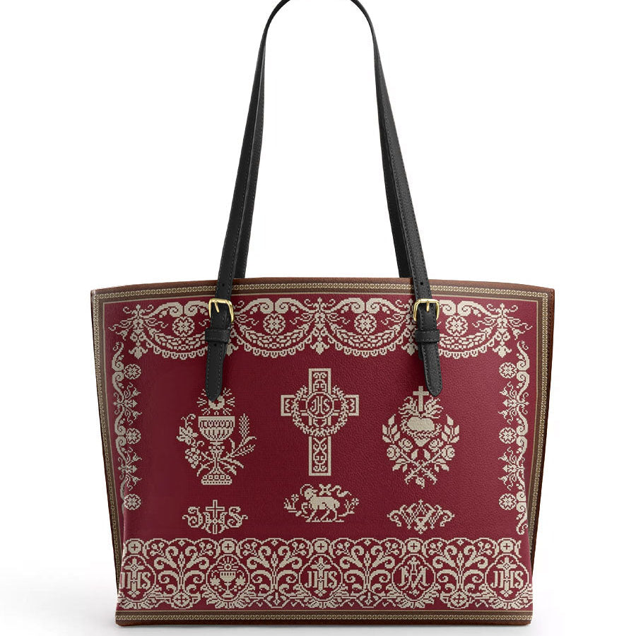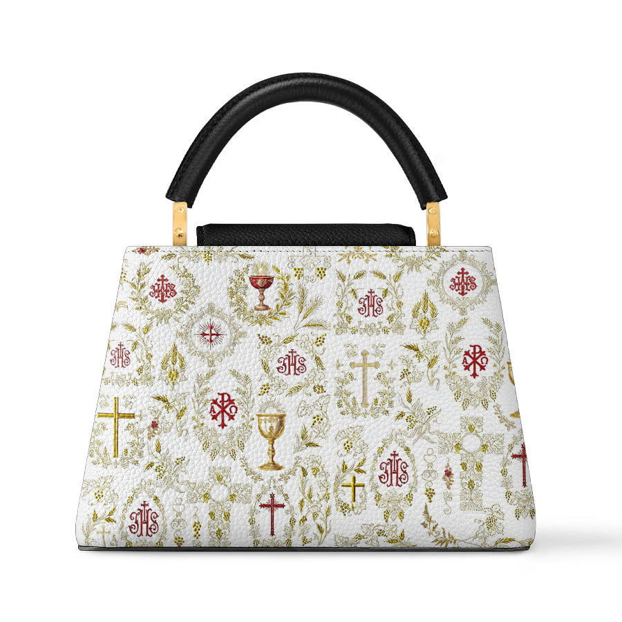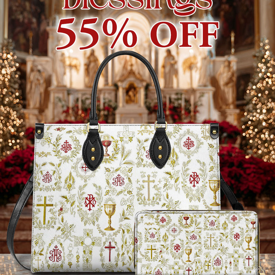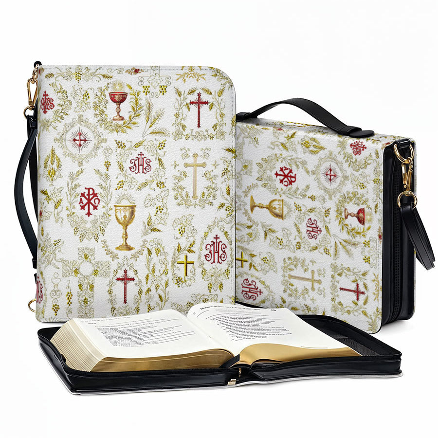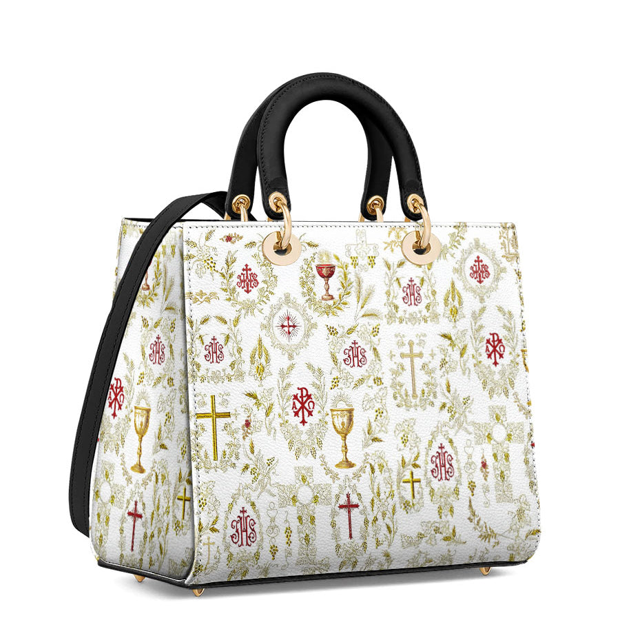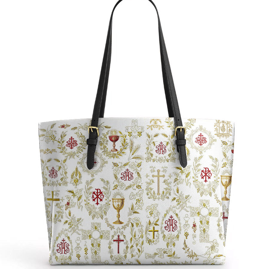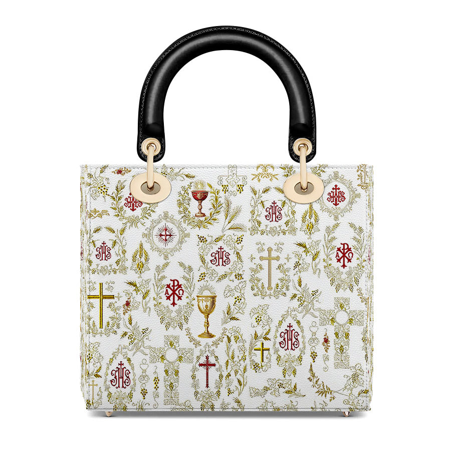 Each piece in this collection is beautifully adorned with beloved Catholic symbols — the chalice, cross, IHS emblem, and olive branches — delicately arranged in a timeless pattern. The soft ivory background paired with gold and deep wine accents creates a classic look that transitions seamlessly from church to daily life.
