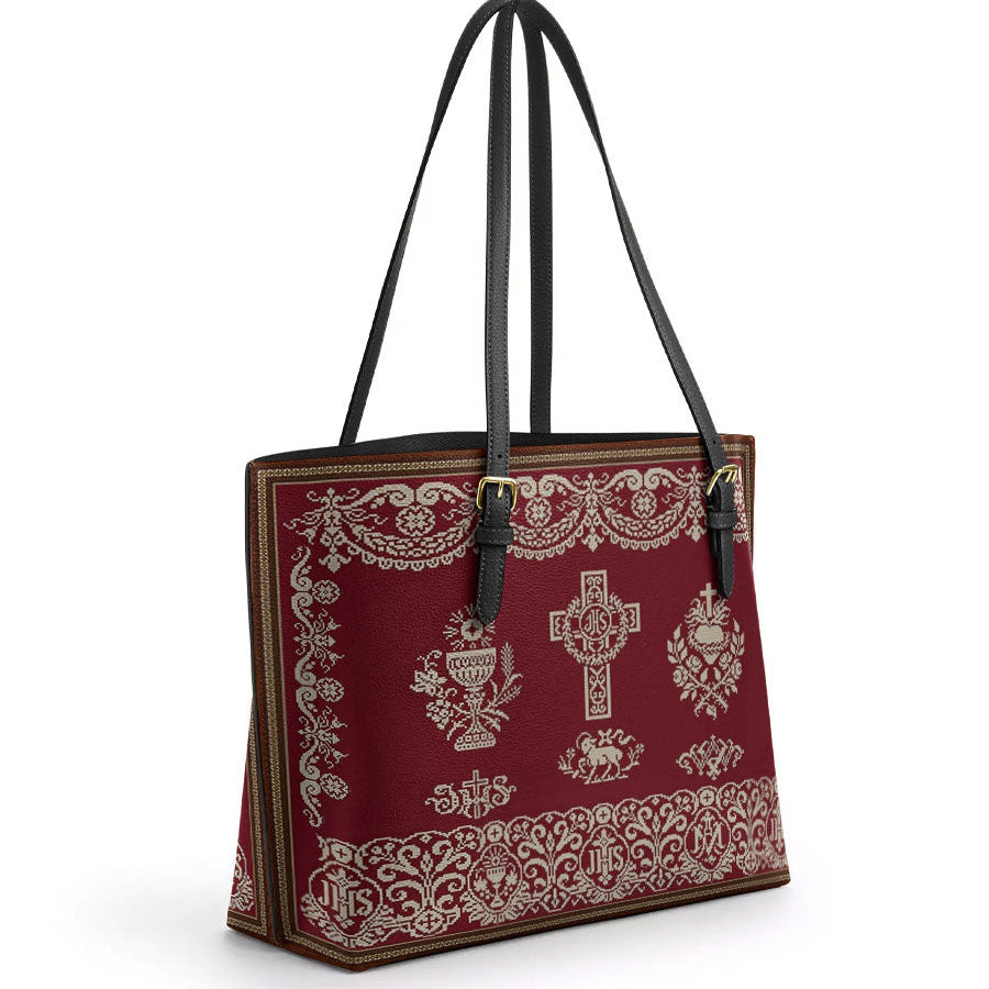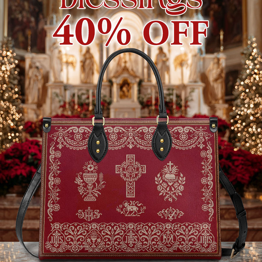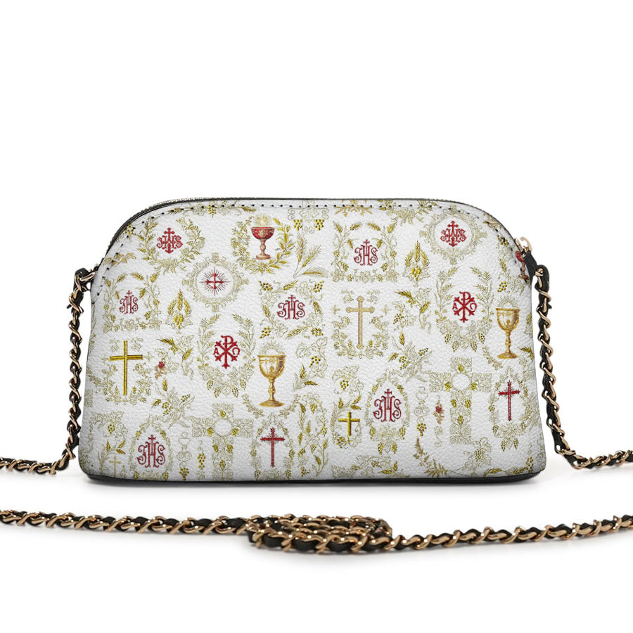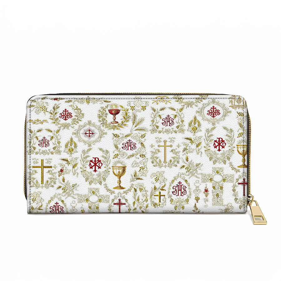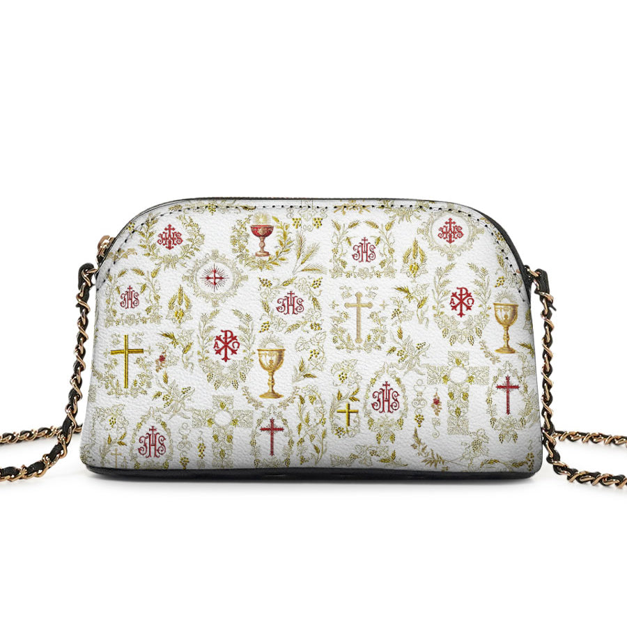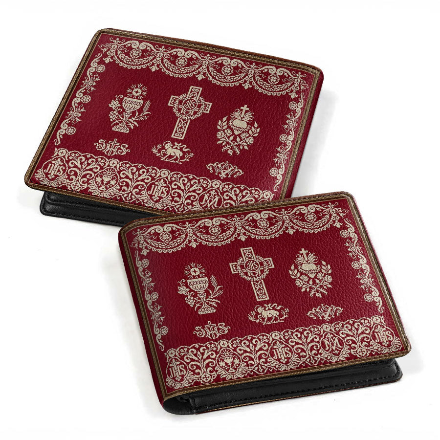 Each piece in this collection is beautifully adorned with beloved Catholic symbols — the chalice, cross, IHS emblem, and olive branches — delicately arranged in a timeless pattern. The soft ivory background paired with gold and deep wine accents creates a classic look that transitions seamlessly from church to daily life.