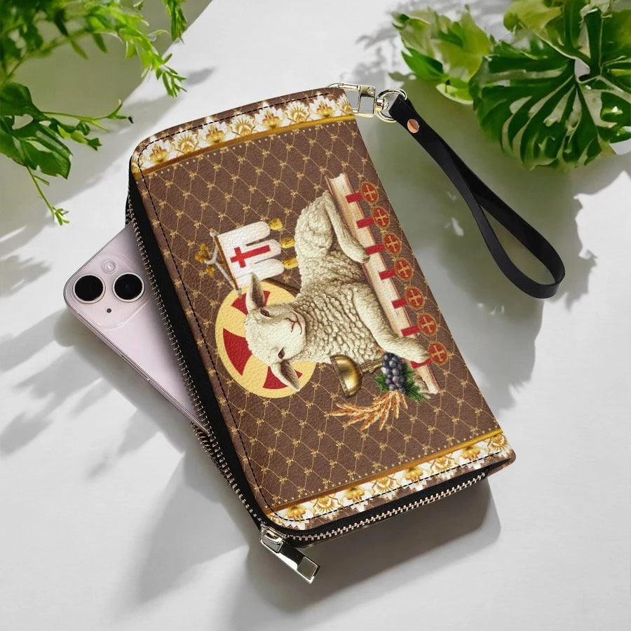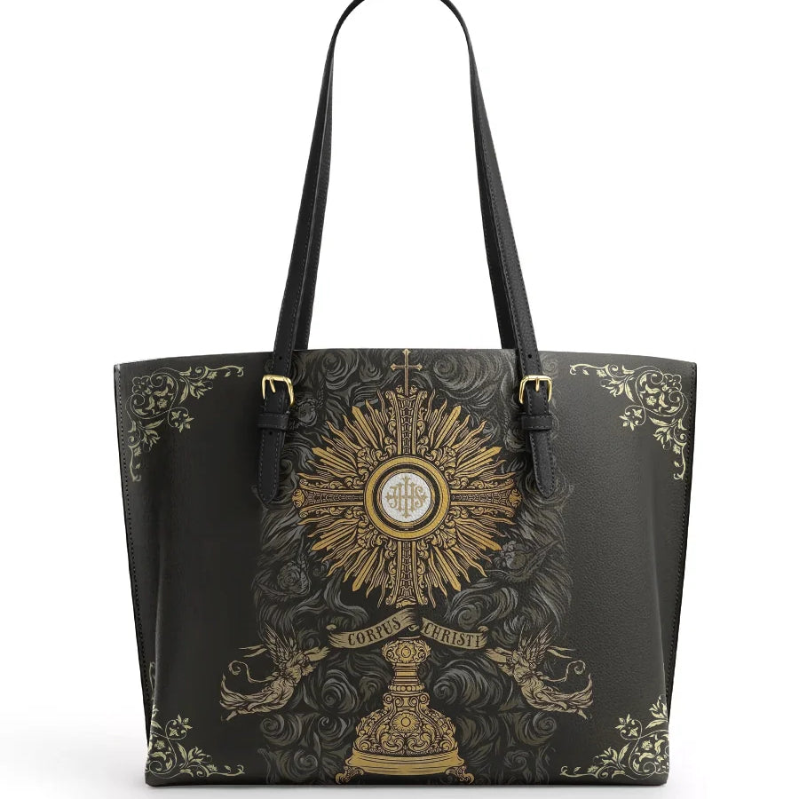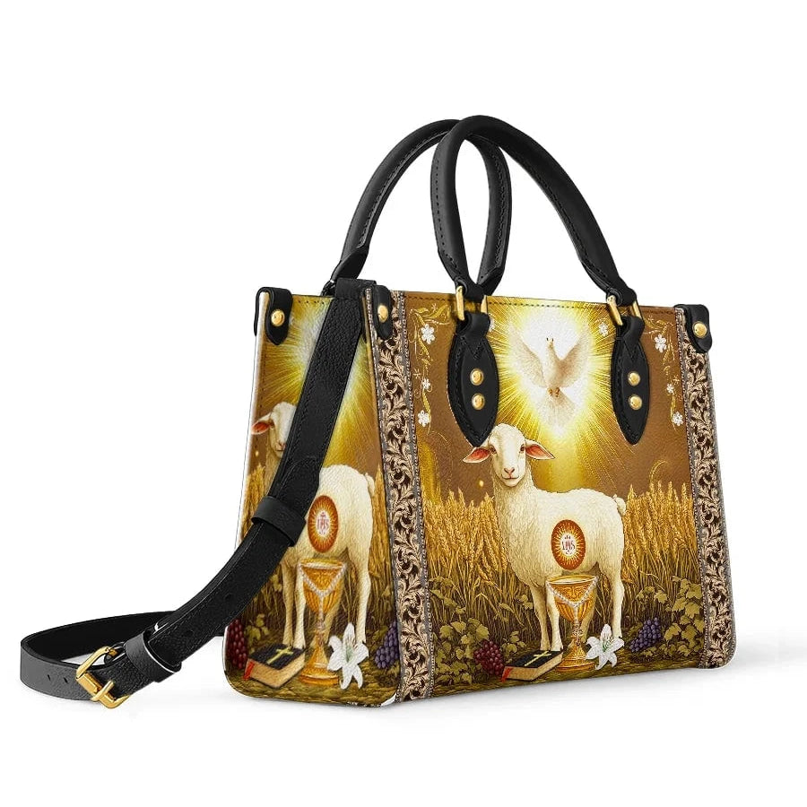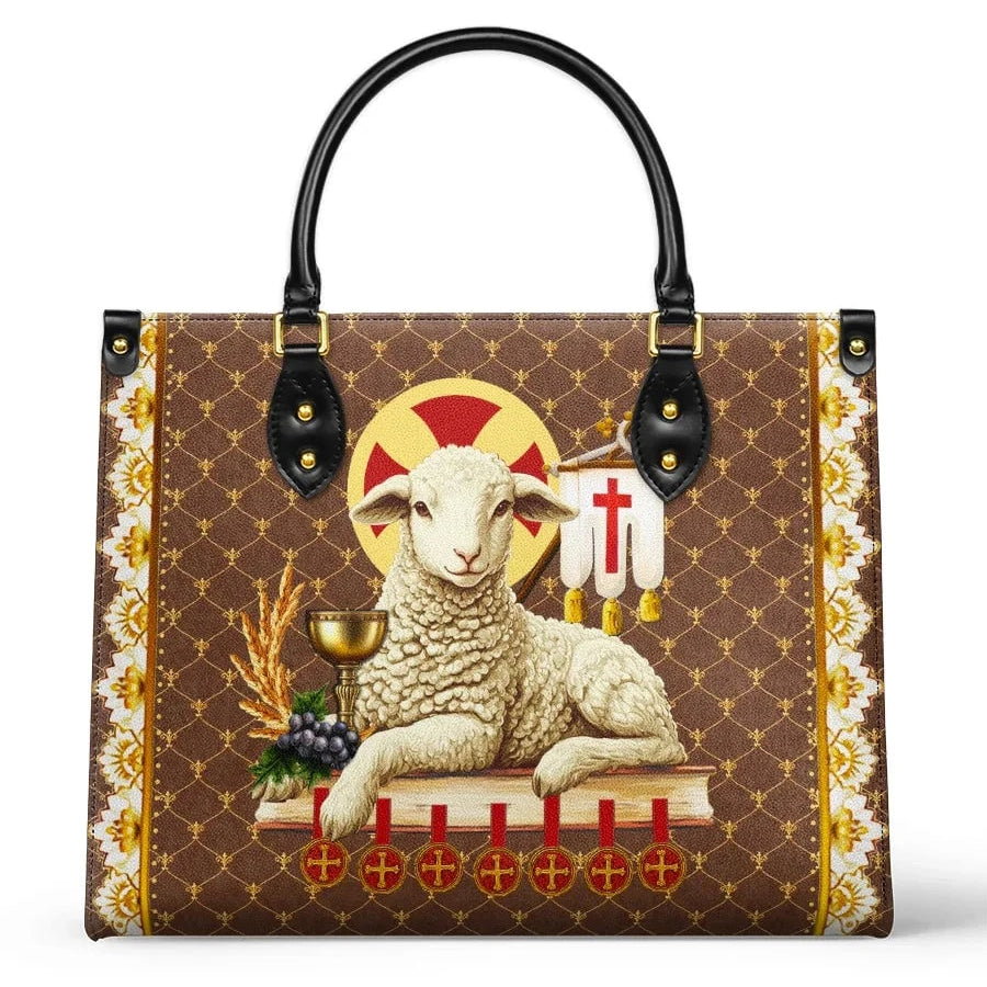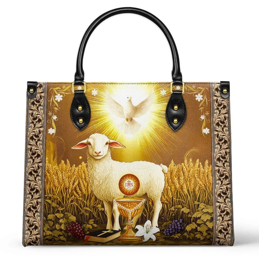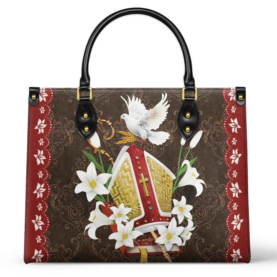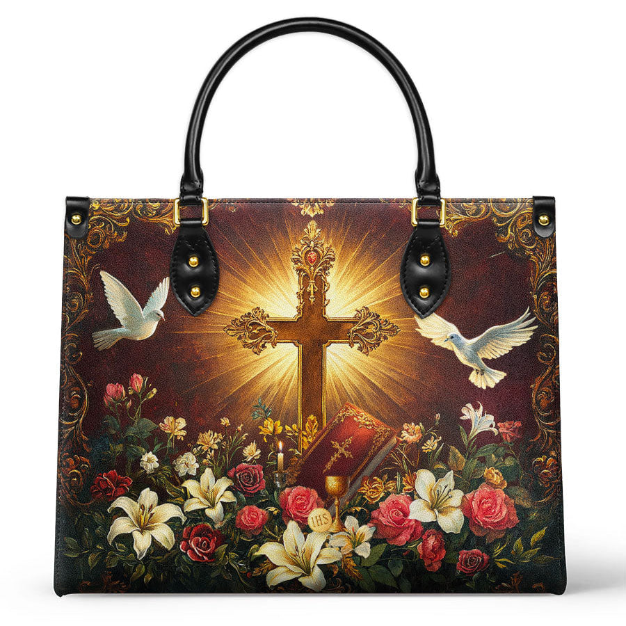 Each piece in this collection is beautifully adorned with beloved Catholic symbols — the chalice, cross, IHS emblem, and olive branches — delicately arranged in a timeless pattern. The soft ivory background paired with gold and deep wine accents creates a classic look that transitions seamlessly from church to daily life.