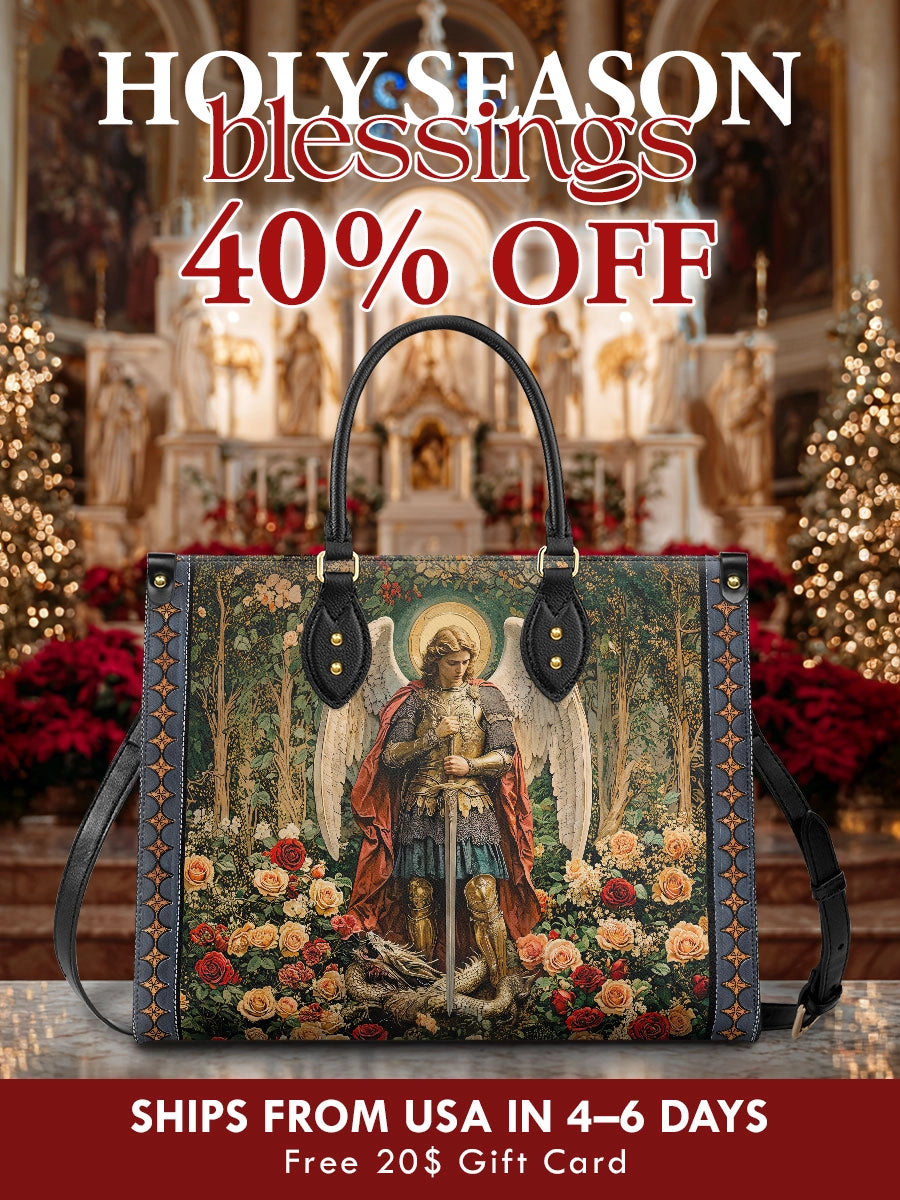 This striking leather bag features a breathtaking depiction of Archangel Michael in the heart of his victory, standing over the defeated dragon, a timeless symbol of good triumphing over evil. The vivid artwork showcases the Archangel in his resplendent golden armor, holding his sword with unwavering strength, surrounded by a garden of flourishing roses in shades of red, pink, and white. The celestial glow of his halo contrasts beautifully with the dark, intricate background, bringing divine energy and protection to life.