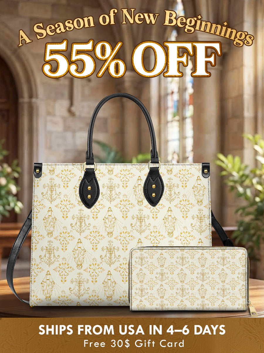 The structured handbag provides timeless form and function, while the matching wallet keeps your essentials close — both crafted to reflect the beauty of devotion in everyday life.