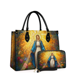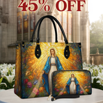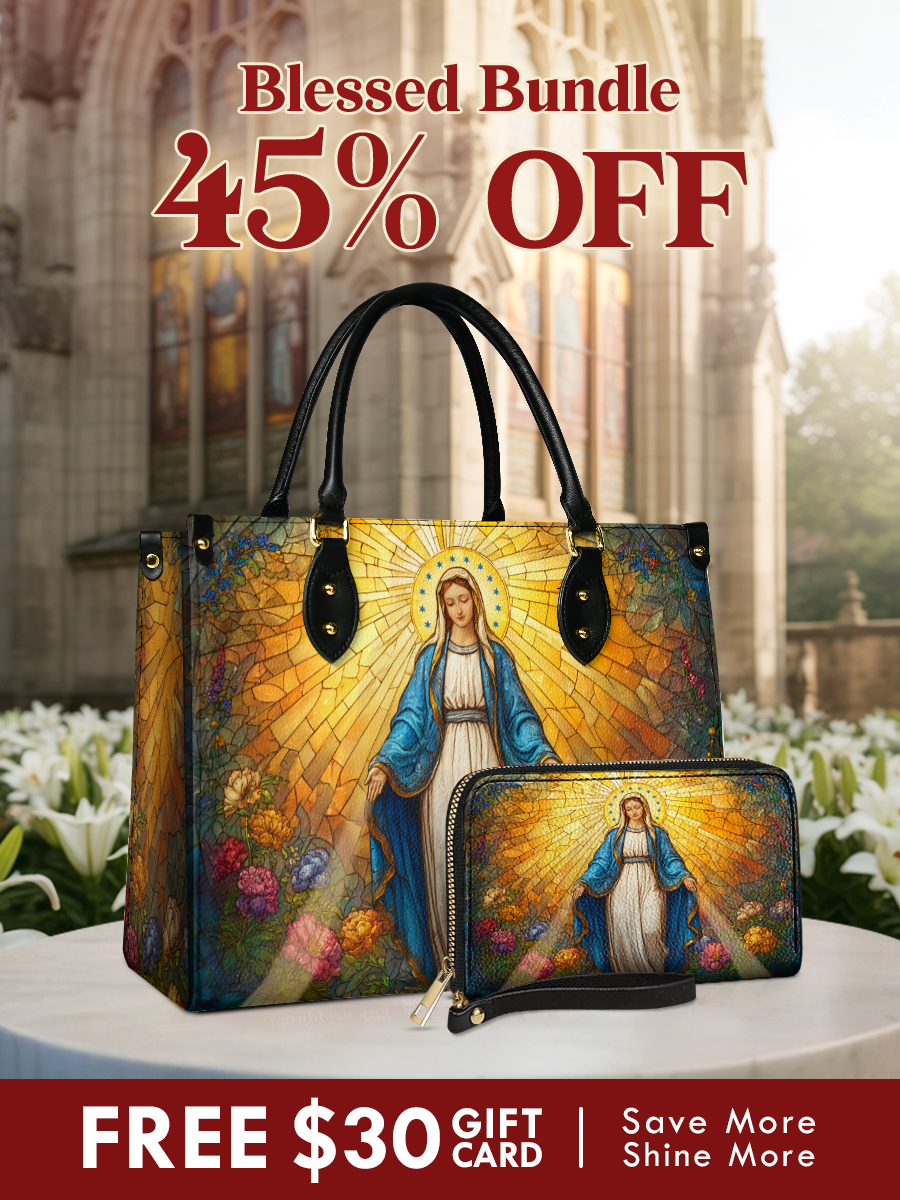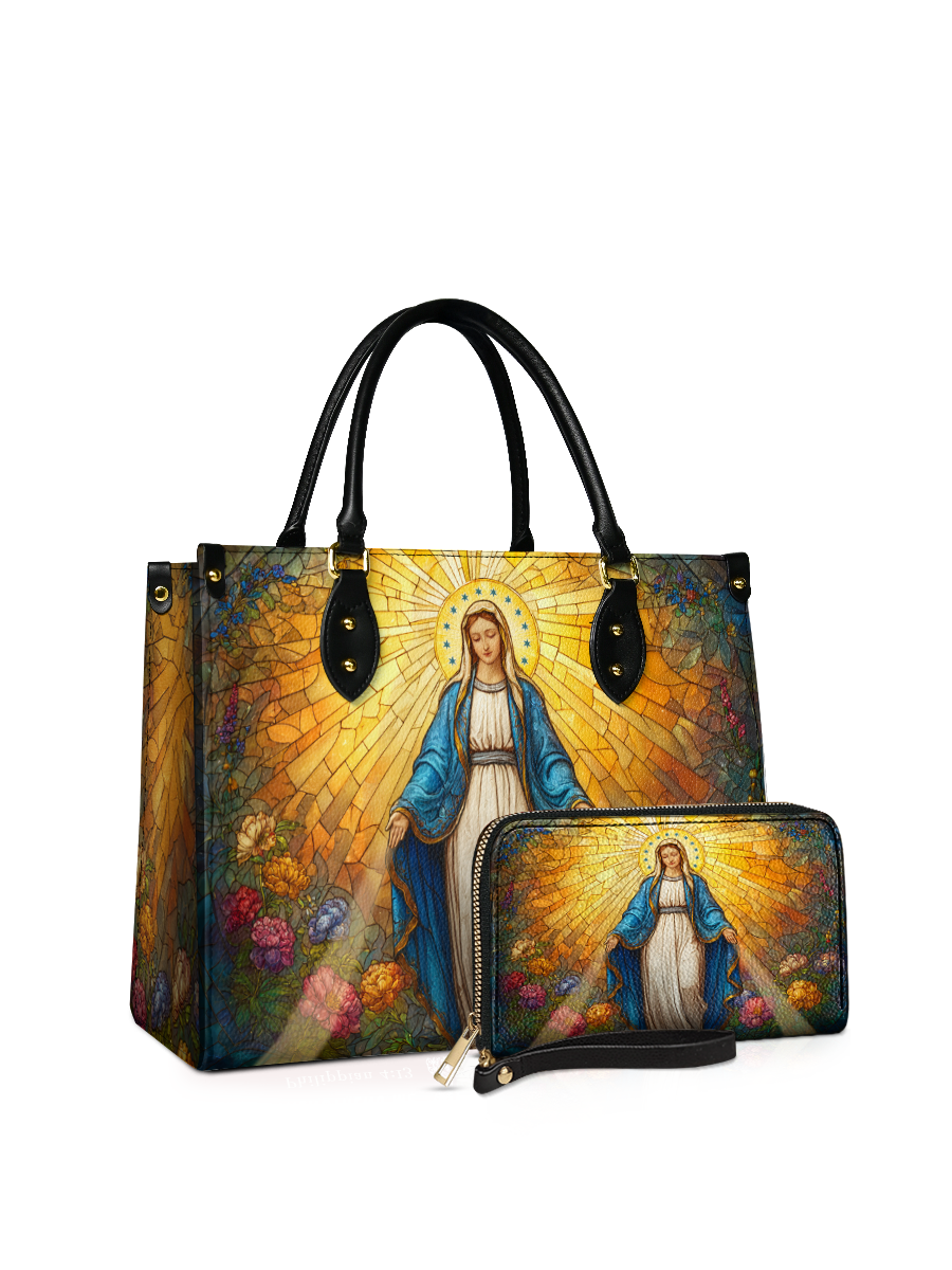 The elegant handbag offers structure and ample space for everyday needs, while the matching wallet provides beauty and organization — a timeless pair for women who walk with Mary’s love and God’s blessing.
