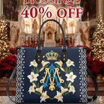 Carrying this bag brings a sense of spiritual connection and grace, a daily expression of devotion to Mary and her virtues. The intricate details of the design, from the regal monogram to the blooming lilies, create a visual masterpiece that resonates deeply with the heart.
