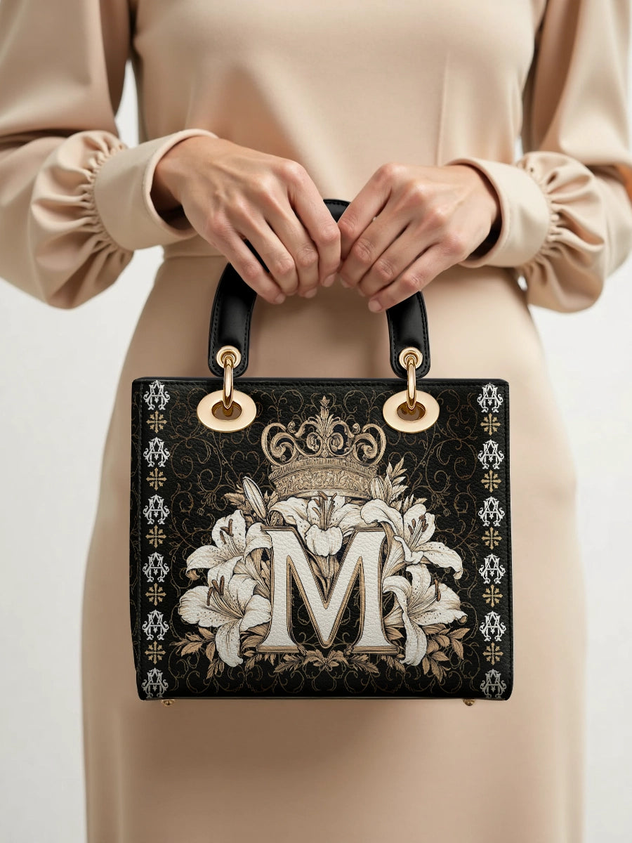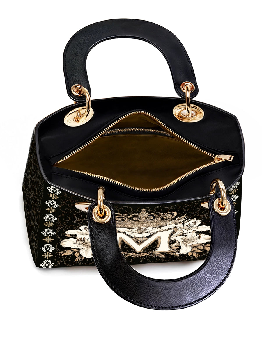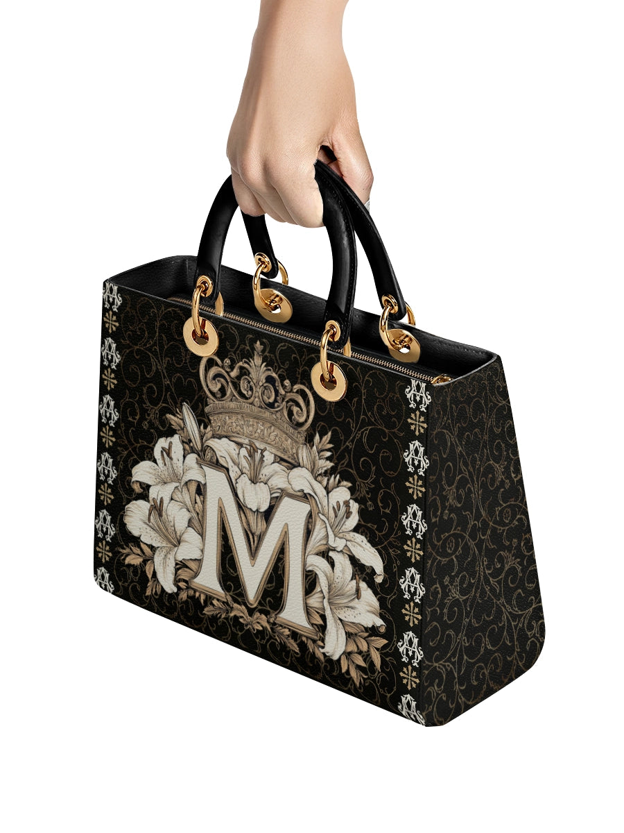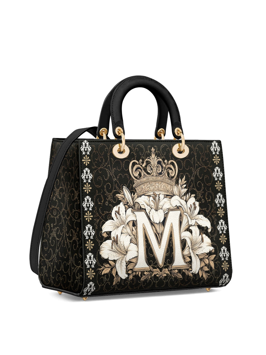 The "Divine Monogram Leather Bag" is a striking tribute to the Blessed Virgin Mary, featuring a majestic "M" monogram encircled by radiant white lilies and crowned with an ornate golden crown. The rich black background and intricate decorative patterns emphasize the regal beauty and sacred symbolism of the design, representing Mary's purity, grace, and her role as the Queen of Heaven.