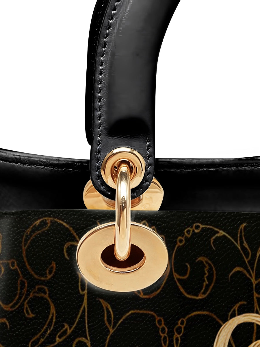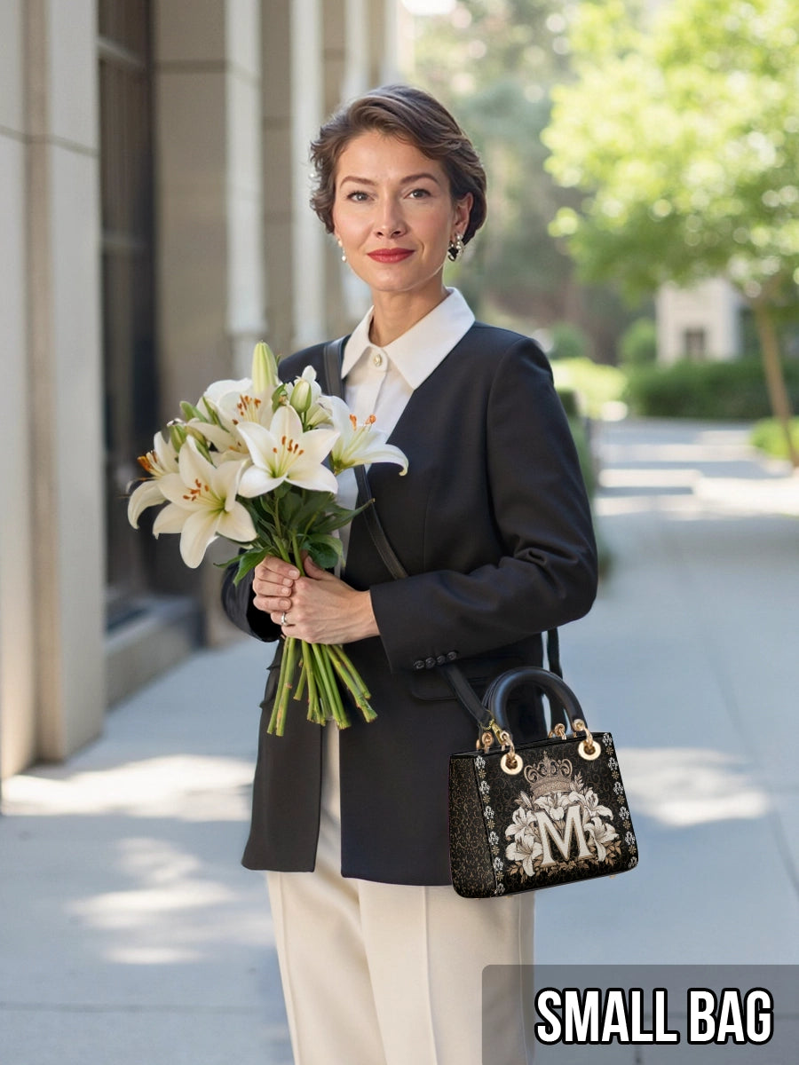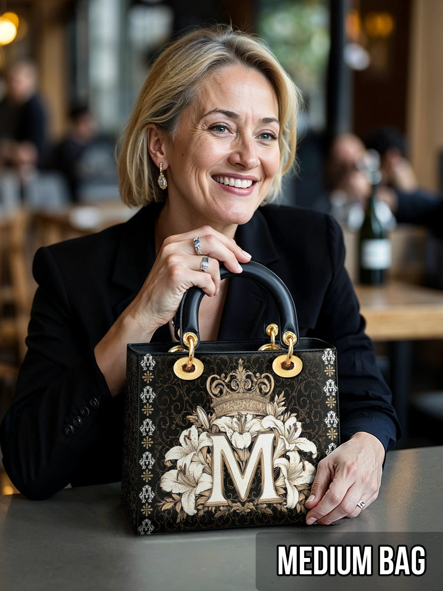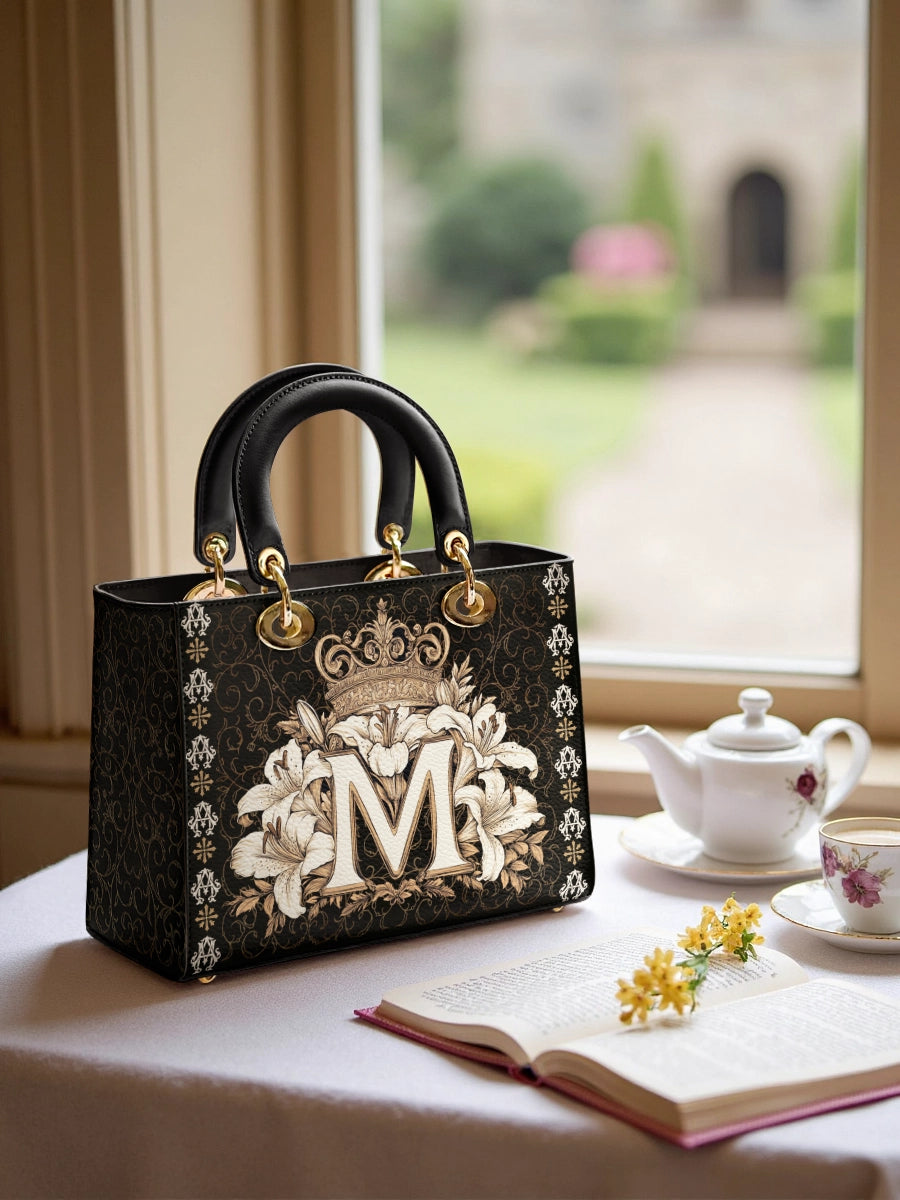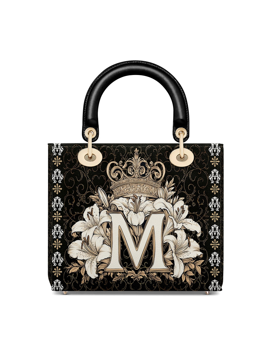 The "Divine Monogram Leather Bag" is a striking tribute to the Blessed Virgin Mary, featuring a majestic "M" monogram encircled by radiant white lilies and crowned with an ornate golden crown. The rich black background and intricate decorative patterns emphasize the regal beauty and sacred symbolism of the design, representing Mary's purity, grace, and her role as the Queen of Heaven.