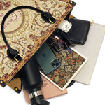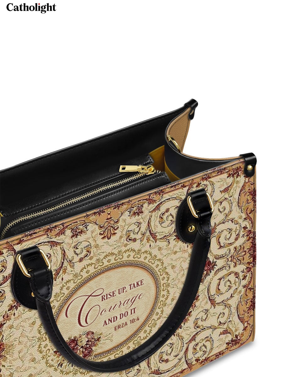 Ce sac en cuir élégant présente le verset biblique inspirant “Lève-toi, prends courage et fais-le” d'Ezra 10:4. Le verset est magnifiquement encadré dans un médaillon orné entouré de motifs floraux complexes dans des tons dorés chauds et rouges profonds, symbolisant la force, la détermination et la foi. Le design irradie une grâce intemporelle, offrant un puissant rappel de l'appel de Dieu à agir avec courage et confiance dans Sa guidance.