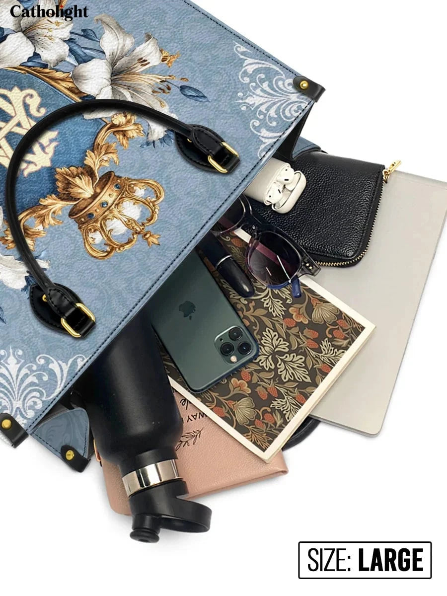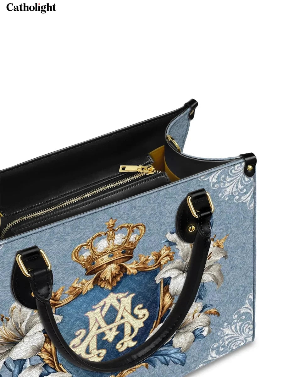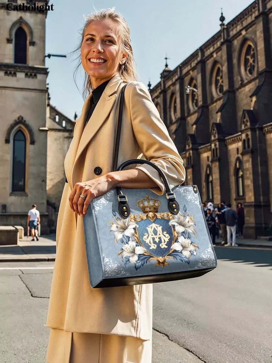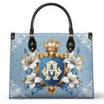 Ce sac en cuir exquis présente un design époustouflant inspiré de motifs royaux et spirituels. Le sac met en valeur un fond bleu majestueux avec des motifs élégants et tourbillonnants qui ajoutent de la texture et de la profondeur. Au centre, une couronne dorée magnifiquement détaillée repose sur un blason orné, décoré des lettres entrelacées "A" et "M", symbolisant la dévotion à la Vierge Marie. Autour du blason se trouvent de délicates lys blancs, symbolisant la pureté et la grâce, avec des accents dorés et de douces feuilles bleues rehaussant l'arrangement floral.