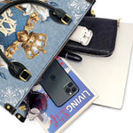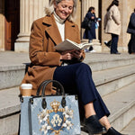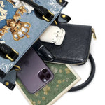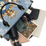 La structure du sac est à la fois sophistiquée et fonctionnelle, avec des poignées en cuir noir robustes fixées par des accessoires en métal doré, ajoutant une touche de luxe. La combinaison du bleu riche, de l'or éclatant et du blanc pur crée une esthétique harmonieuse et élégante qui rayonne d'une beauté intemporelle et d'une signification spirituelle. Ce sac en cuir n'est pas seulement un accessoire de mode mais une pièce maîtresse qui incarne la grâce, la foi et un savoir-faire raffiné.