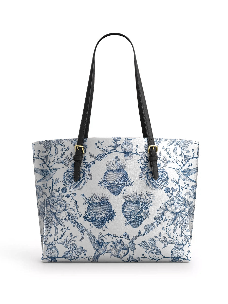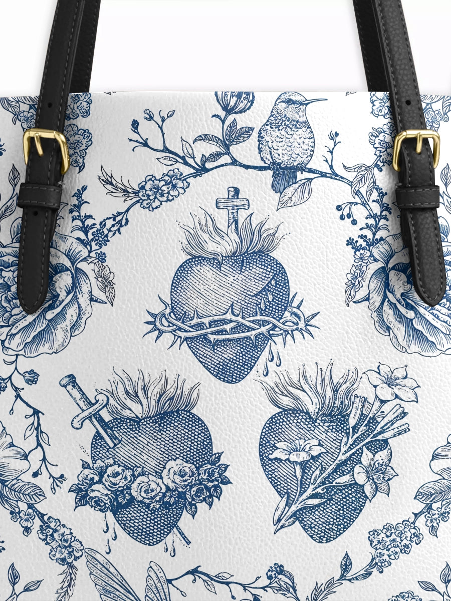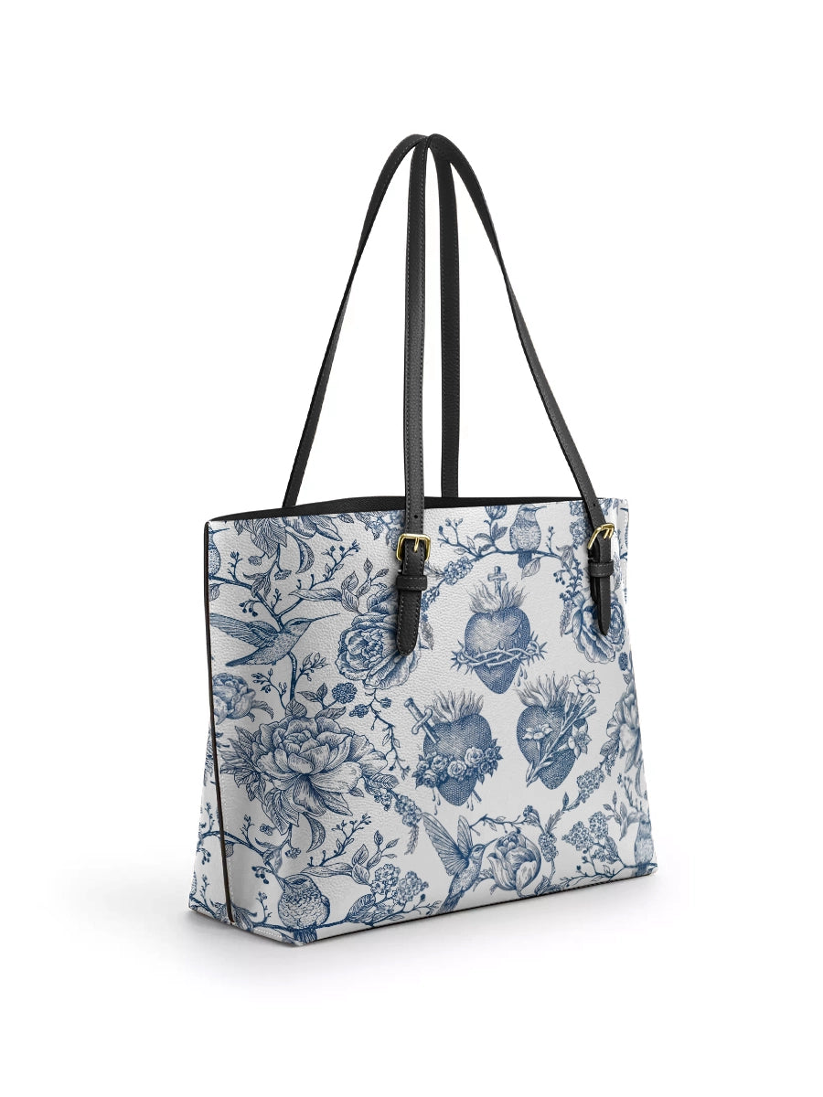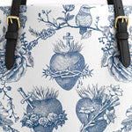 Catholight Sacred Elegance: Blue and White Devotion Leather Tote Bag
