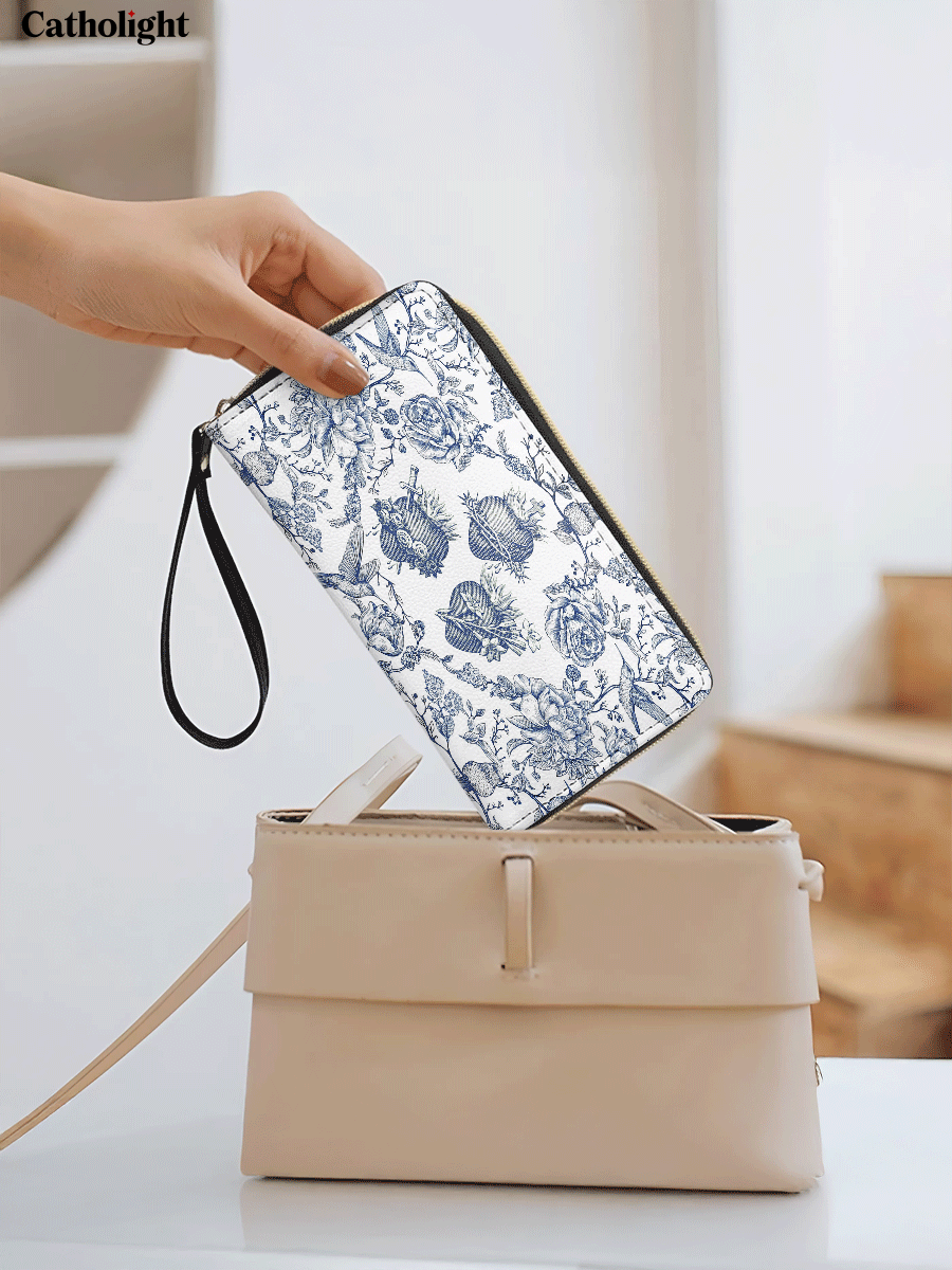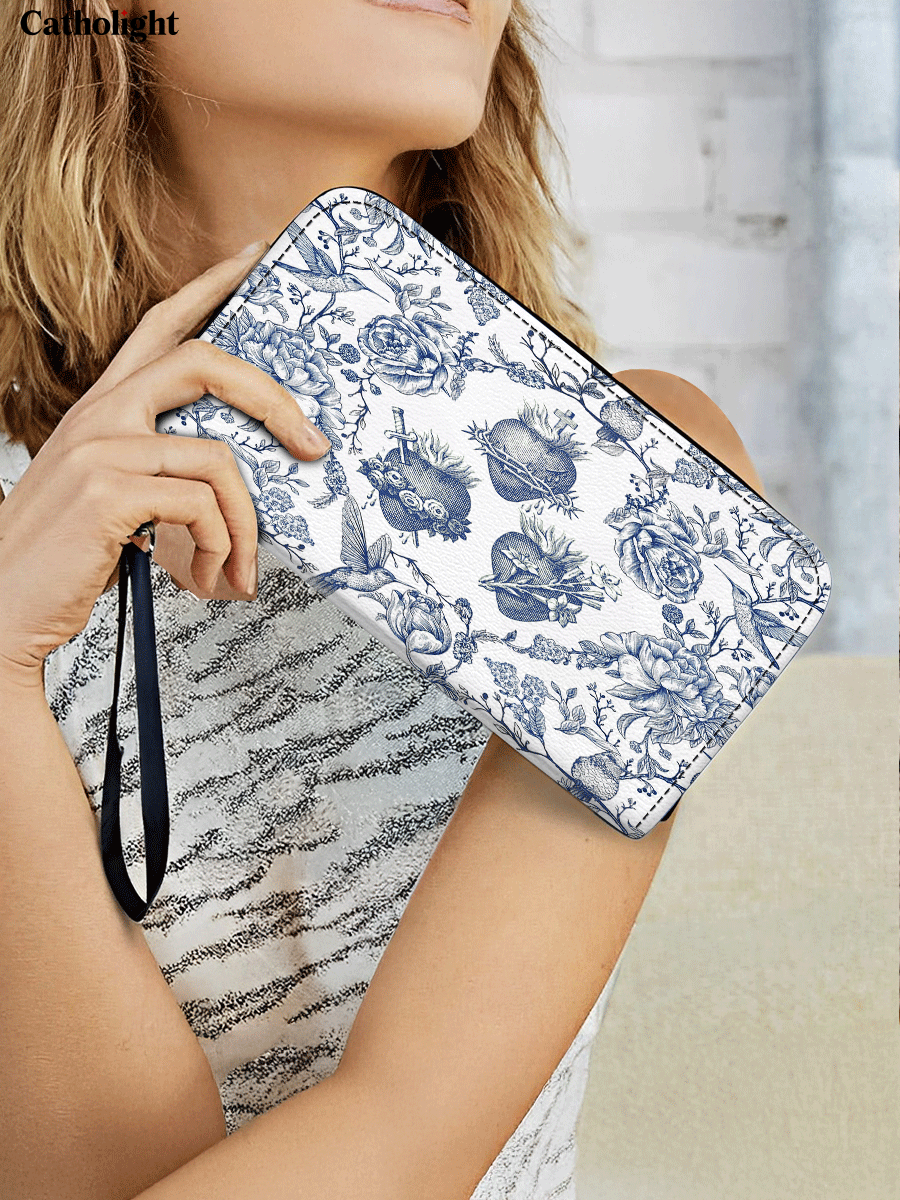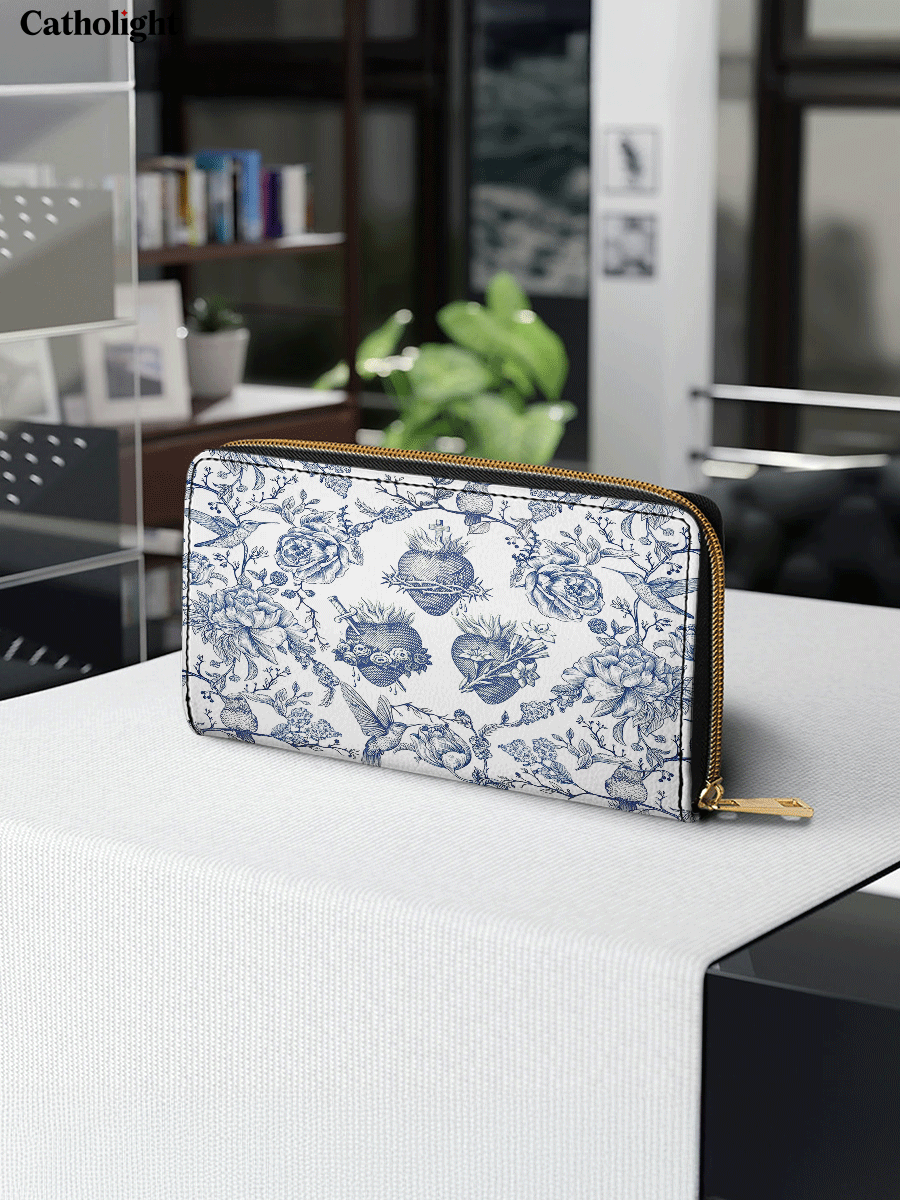 Incarner le charme intemporel et la dévotion sereine, le Sacred Elegance: Blue and White Devotion Leather Wallet Purse présente un motif exquis bleu et blanc inspiré de l'art sacré. Le design complexe met en avant des roses en fleurs, des cœurs sacrés délicats et des colombes gracieuses, tous magnifiquement rendus dans des tons monochromatiques classiques.