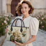 Ce sac en cuir exquis présente une belle représentation de la Sainte Famille—Jésus, Marie et Joseph—entourés d'anges et de délicates lys. Le riche symbolisme et les couleurs apaisantes évoquent un sentiment d'amour divin, de protection et d'unité. L'atmosphère radieuse et éthérée de l'œuvre invite à des sentiments de sérénité et d'espoir, en faisant un parfait rappel du lien sacré de la Sainte Famille.