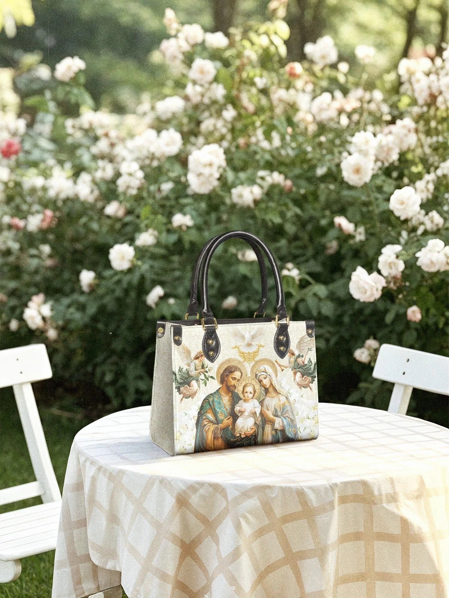 Porter ce sac apporte un sentiment de connexion spirituelle et de grâce, une expression quotidienne de foi et de dévotion. Les détails complexes de l'art, des colombes célestes à l'étreinte tendre de la famille, créent un chef-d'œuvre visuel qui résonne profondément avec le cœur.