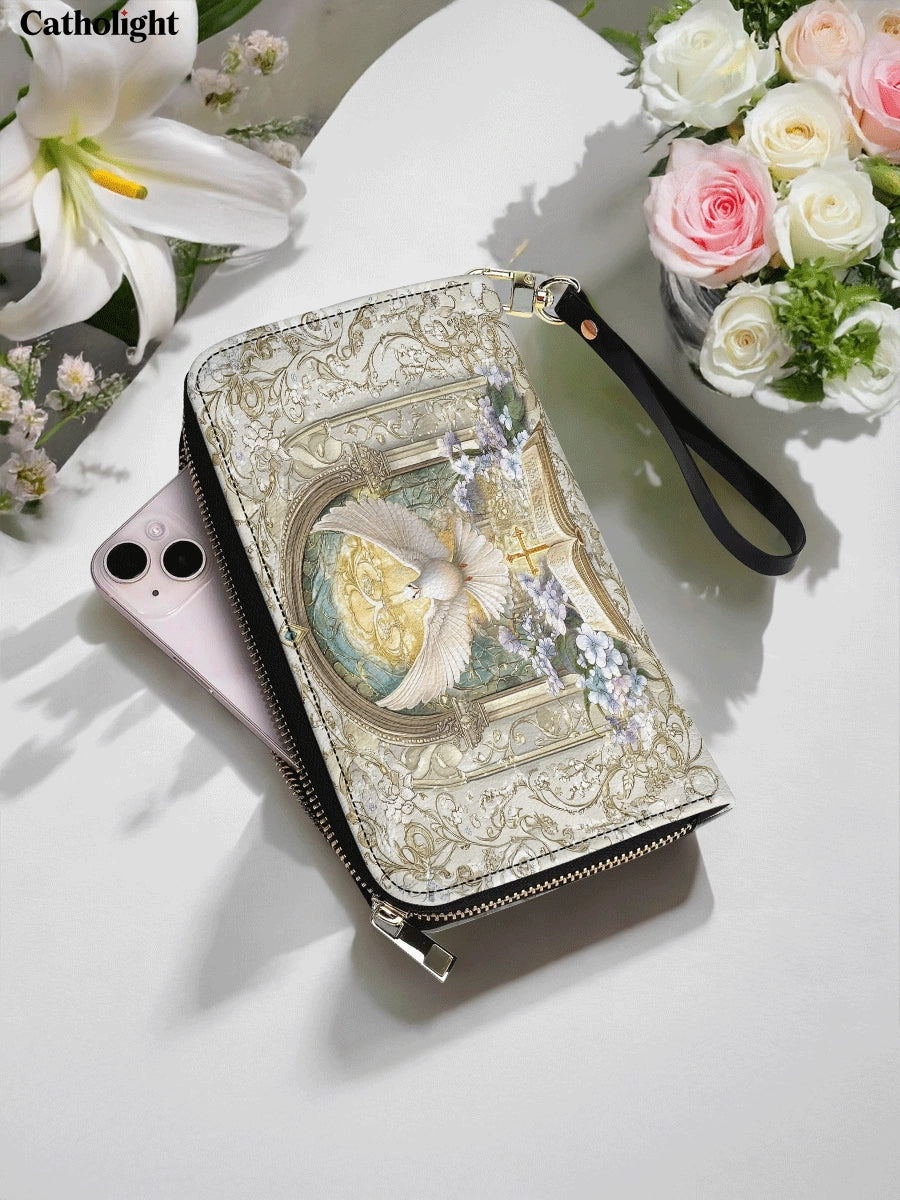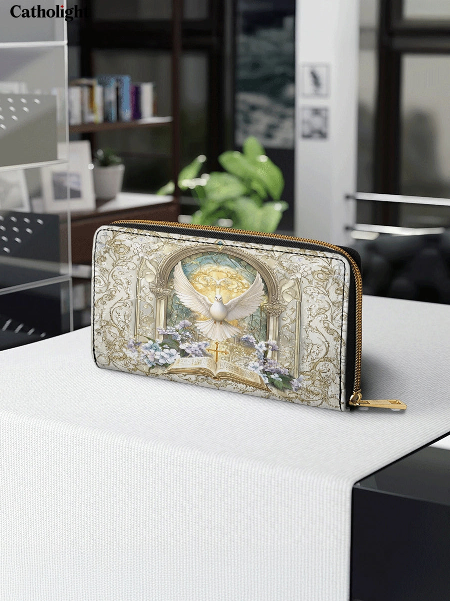 Embrassez la sérénité divine avec le Portefeuille en Cuir Sanctuaire de l'Esprit Saint, un hommage exquis à la paix spirituelle et à la pureté. Ce design présente une colombe radieuse, symbolisant l'Esprit Saint, gracieusement placée dans une arche dorée ornée de filigrane complexe. Des fleurs épanouies et une croix lumineuse complètent la scène, créant un mélange harmonieux d'élégance et de foi.