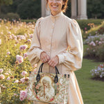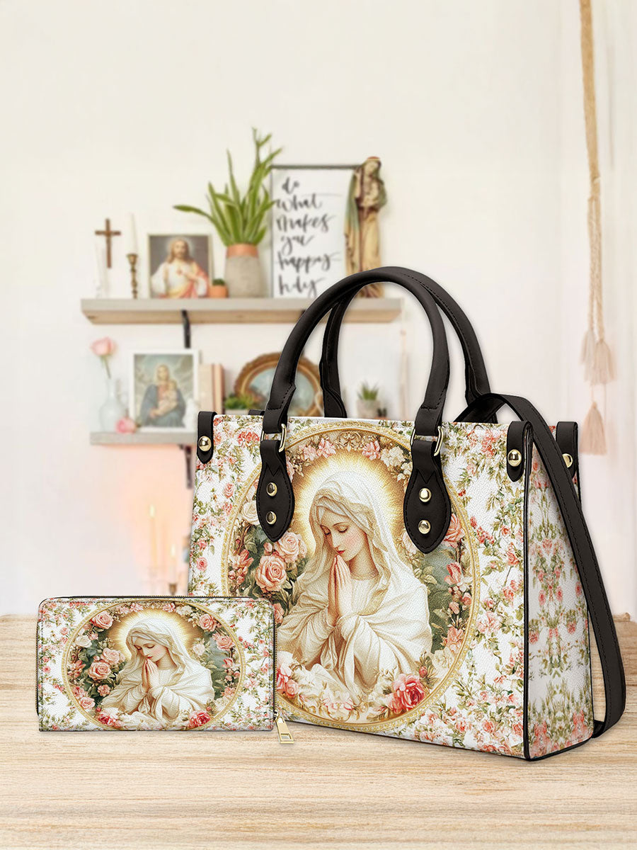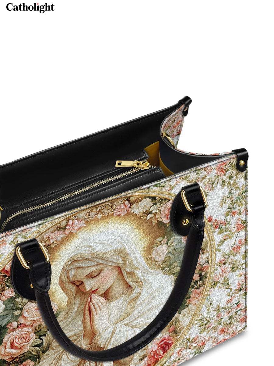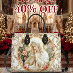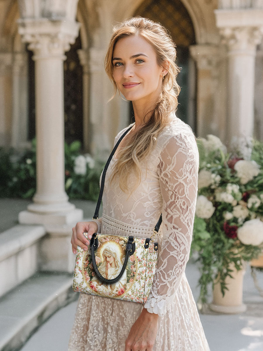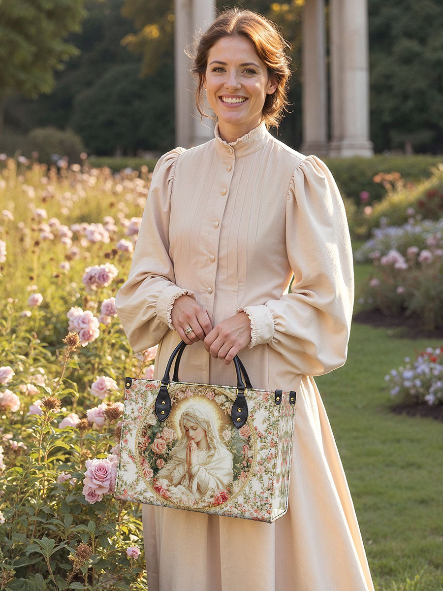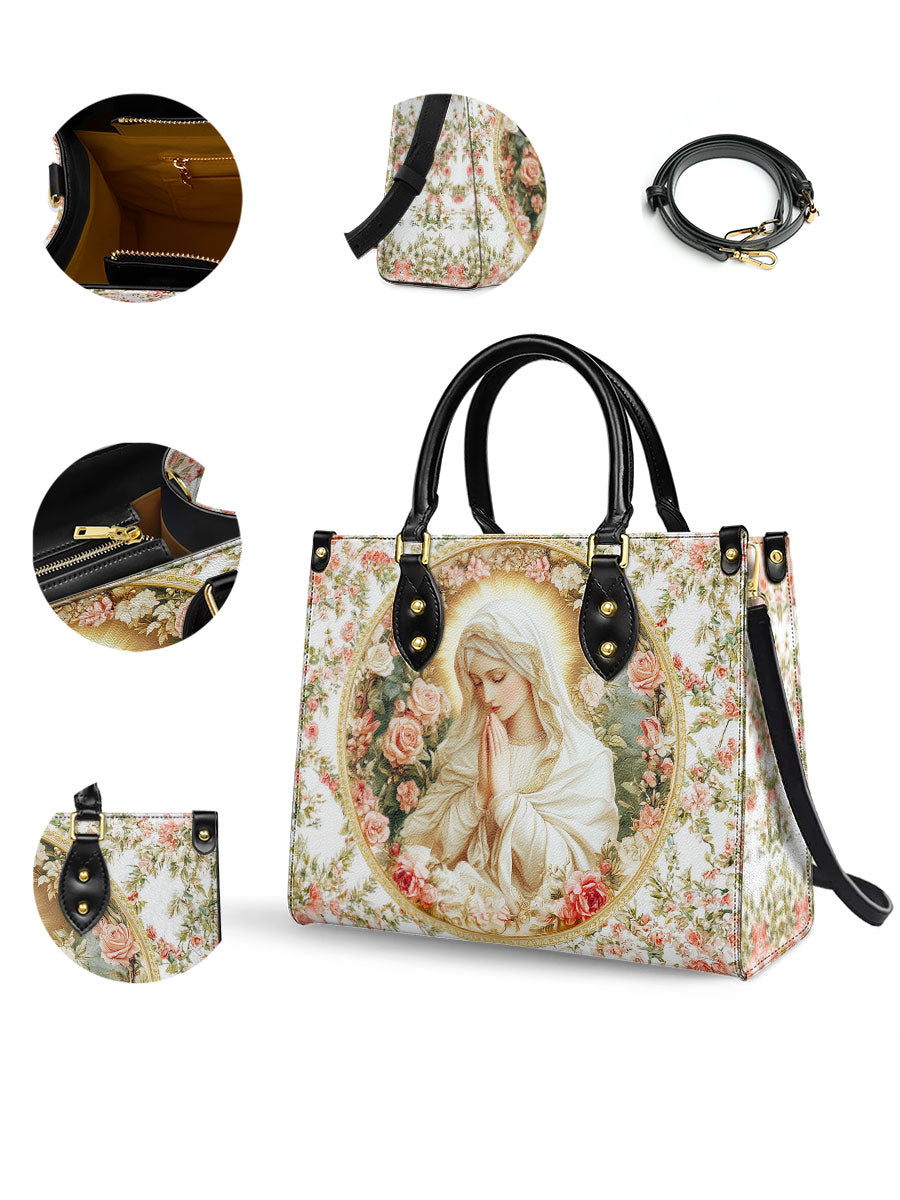 Ce sac en cuir élégant présente une représentation sereine de la Sainte Vierge Marie en prière, entourée d'une délicate couronne de roses en fleurs. L'aura dorée qui encadre sa figure rayonne de lumière divine, symbolisant sa pureté, sa grâce et son intercession aimante. Les douces teintes pastel et les détails floraux complexes évoquent un sentiment de paix, de dévotion et de beauté céleste. Ce sac en cuir est une expression intemporelle de foi et d'amour pour Notre-Dame, en faisant un accessoire chéri pour les femmes dévouées à Marie.
