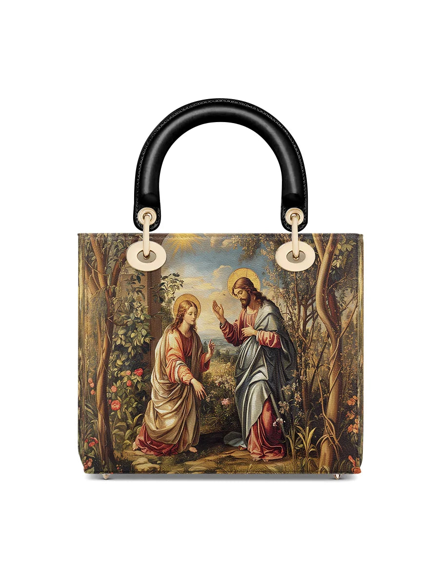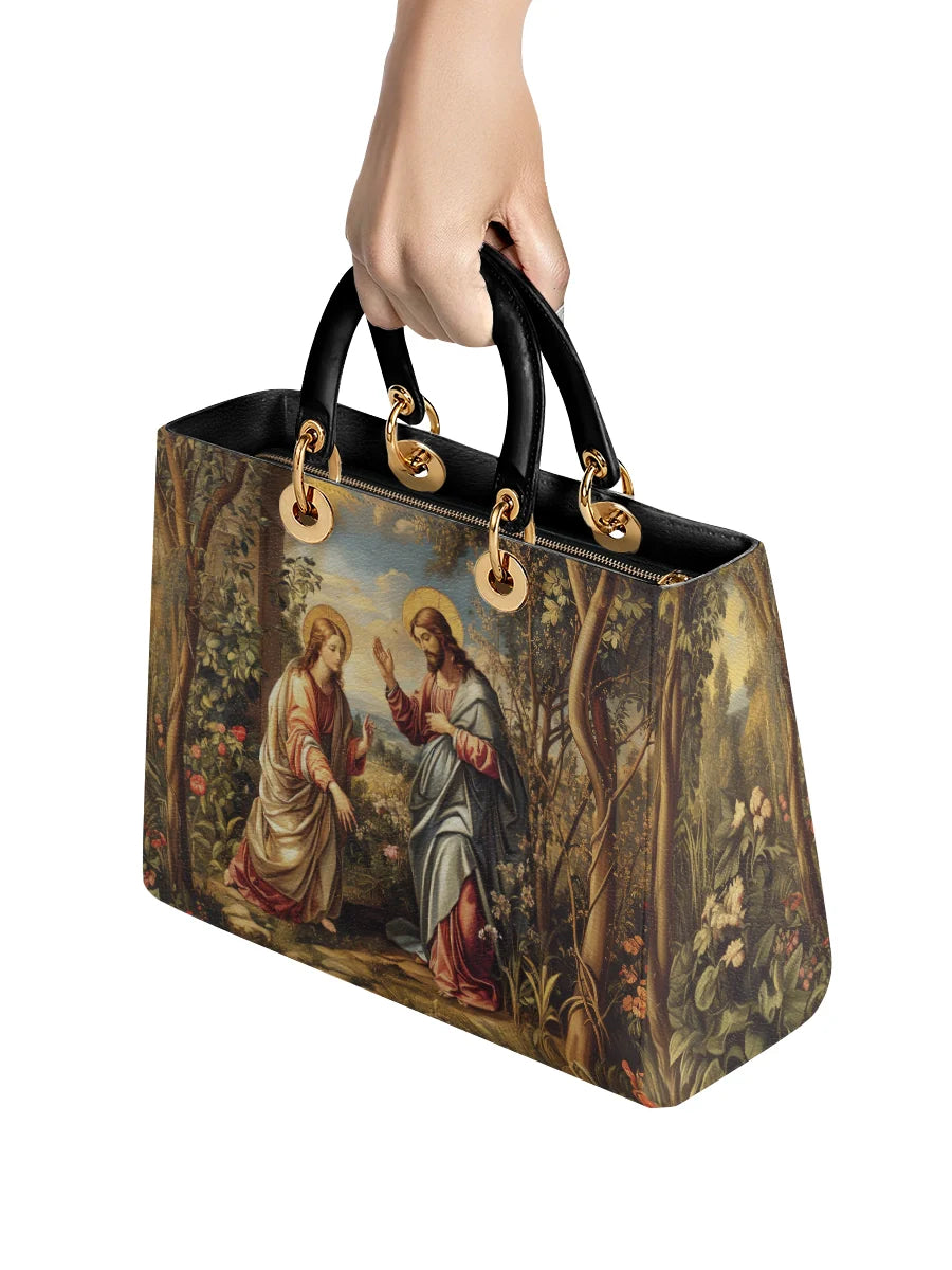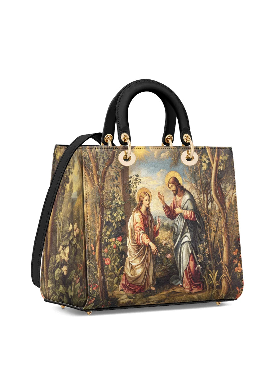 The "Christ and Mary Magdalene" leather bag captures the profound and sacred moment of Jesus appearing to Mary Magdalene after His resurrection. Set in a lush and tranquil garden, the artwork reflects their divine encounter, symbolizing hope, renewal, and the triumph of love over death. The intricate details of the scene, from the vibrant flowers to the warm light surrounding Christ, create a powerful depiction of faith and grace.