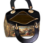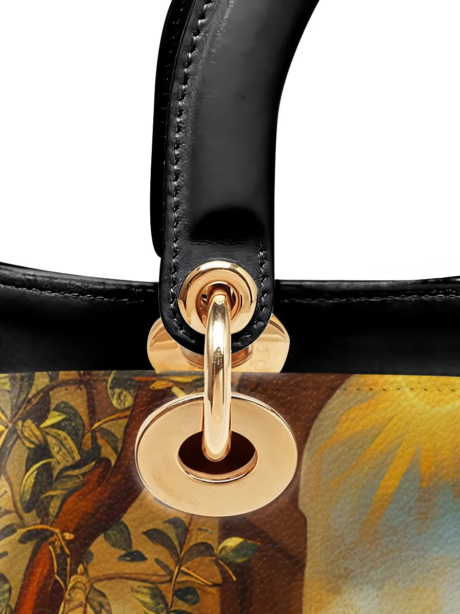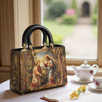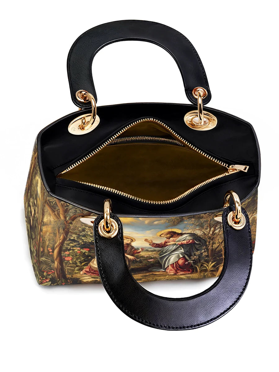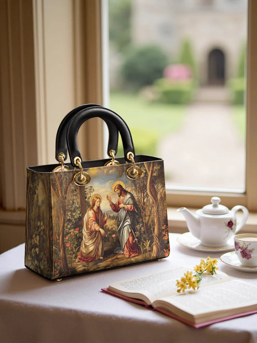 The "Christ and Mary Magdalene" leather bag captures the profound and sacred moment of Jesus appearing to Mary Magdalene after His resurrection. Set in a lush and tranquil garden, the artwork reflects their divine encounter, symbolizing hope, renewal, and the triumph of love over death. The intricate details of the scene, from the vibrant flowers to the warm light surrounding Christ, create a powerful depiction of faith and grace.