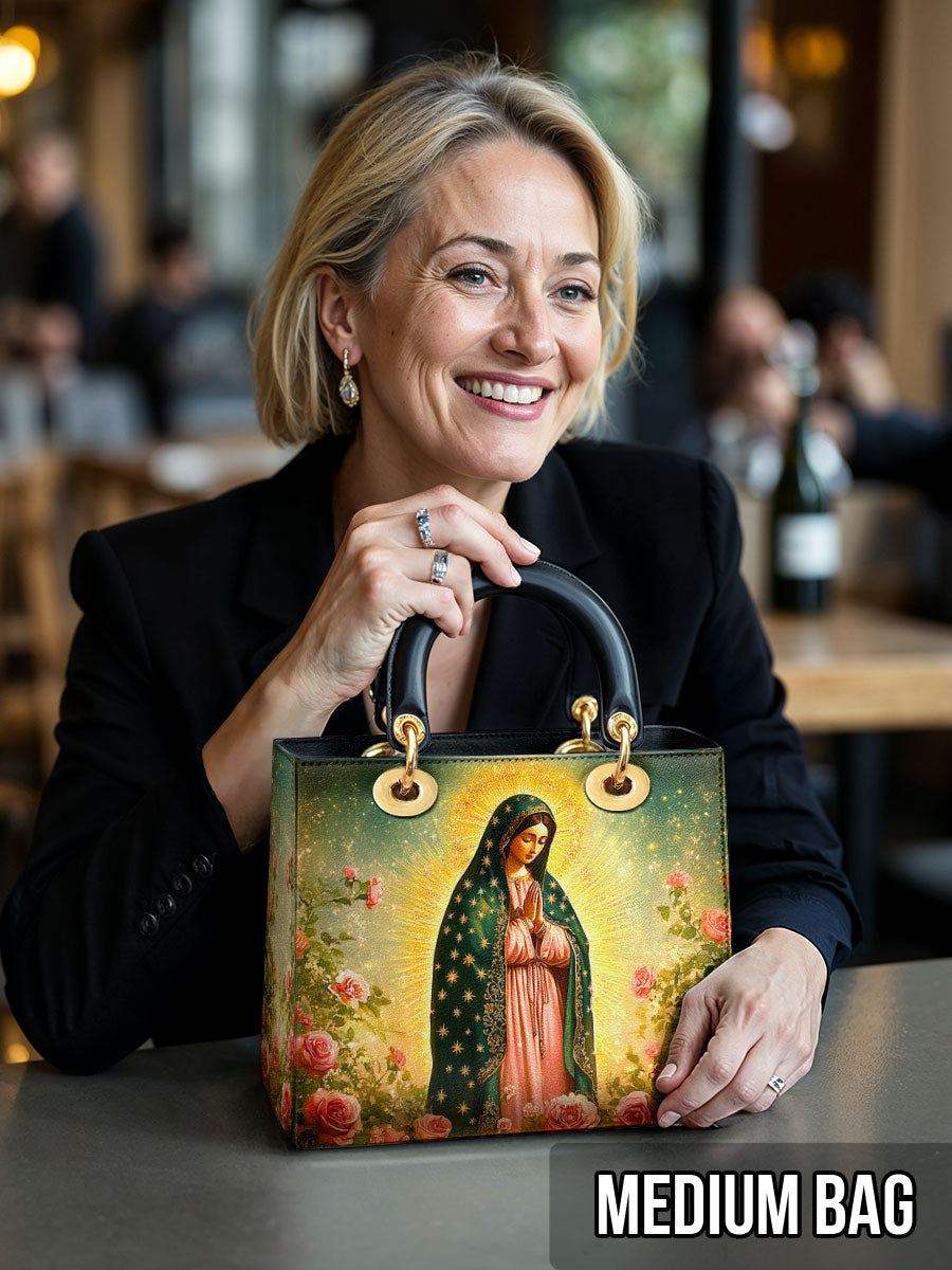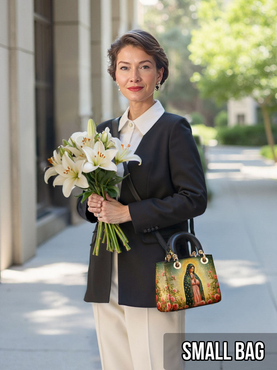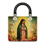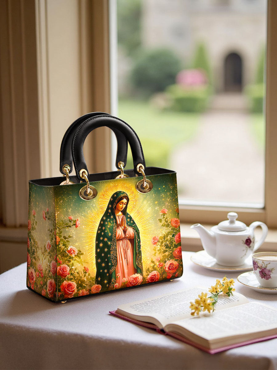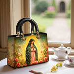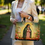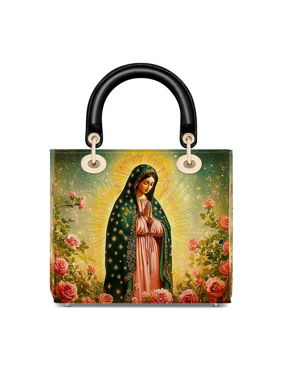 This Lady Leather Bag features a luminous portrayal of Our Lady of Guadalupe, standing in quiet reverence amid blooming roses and radiant golden light. Her emerald mantle adorned with stars and her gentle gaze reflect deep compassion, maternal care, and the sacred beauty of Marian devotion. The vibrant colors and floral setting honor the miraculous image that has inspired generations of faith.