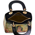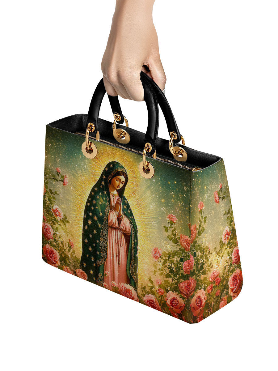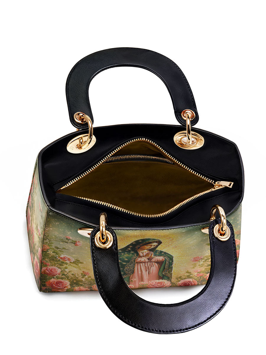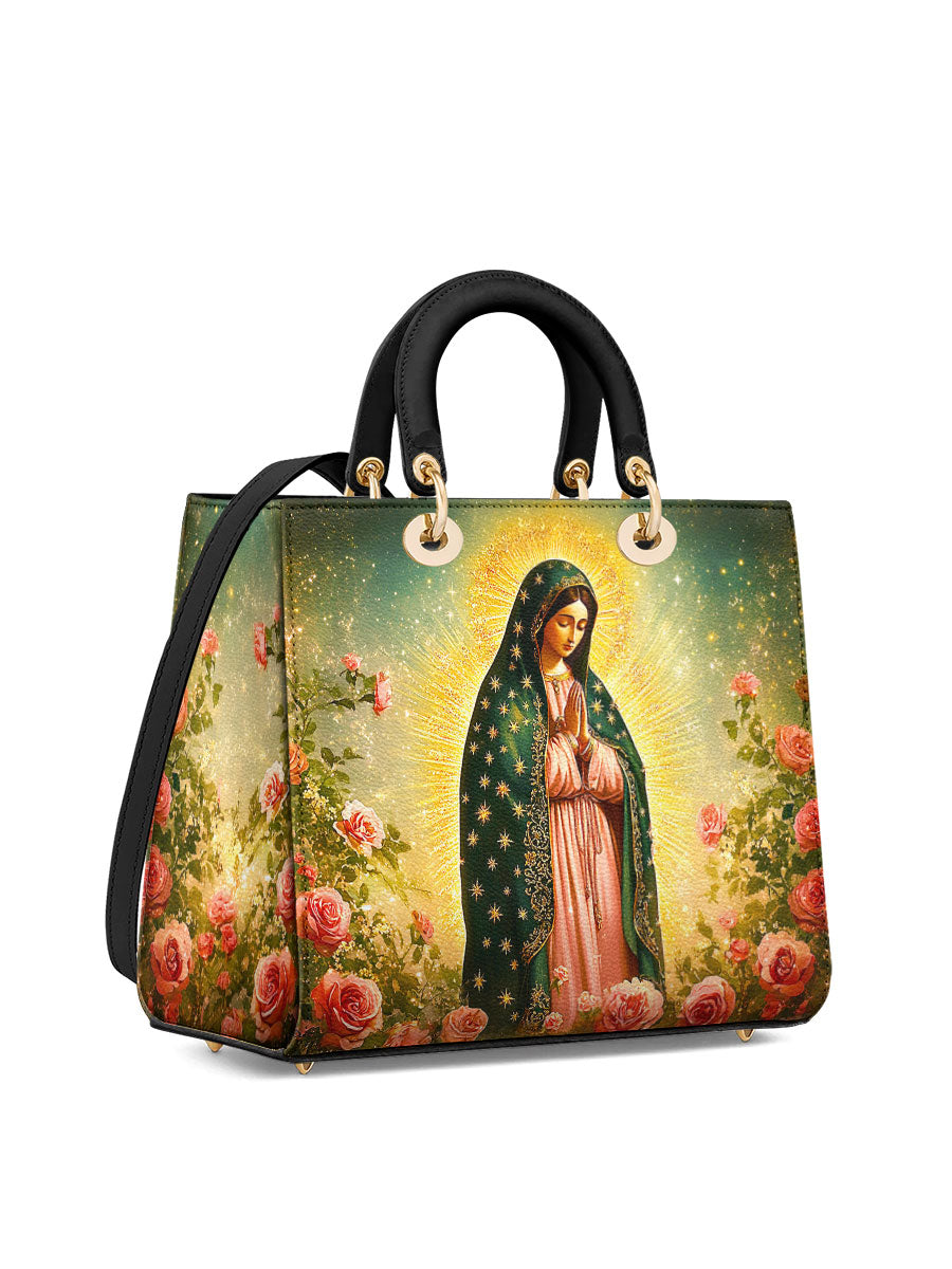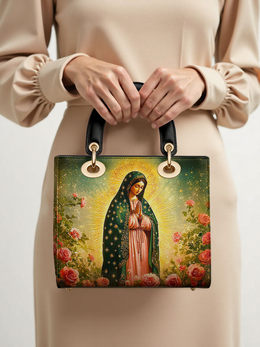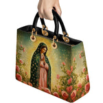 This Lady Leather Bag features a luminous portrayal of Our Lady of Guadalupe, standing in quiet reverence amid blooming roses and radiant golden light. Her emerald mantle adorned with stars and her gentle gaze reflect deep compassion, maternal care, and the sacred beauty of Marian devotion. The vibrant colors and floral setting honor the miraculous image that has inspired generations of faith.