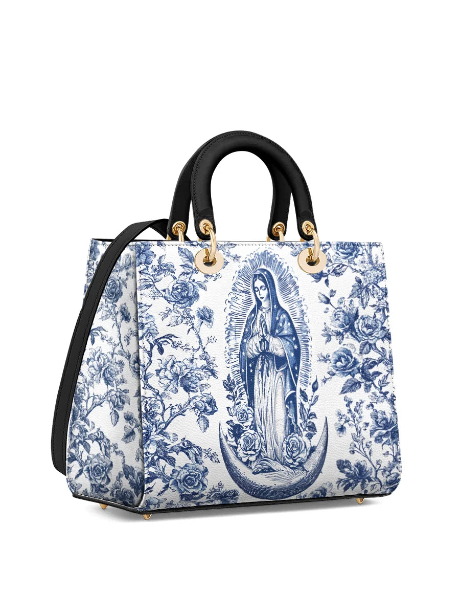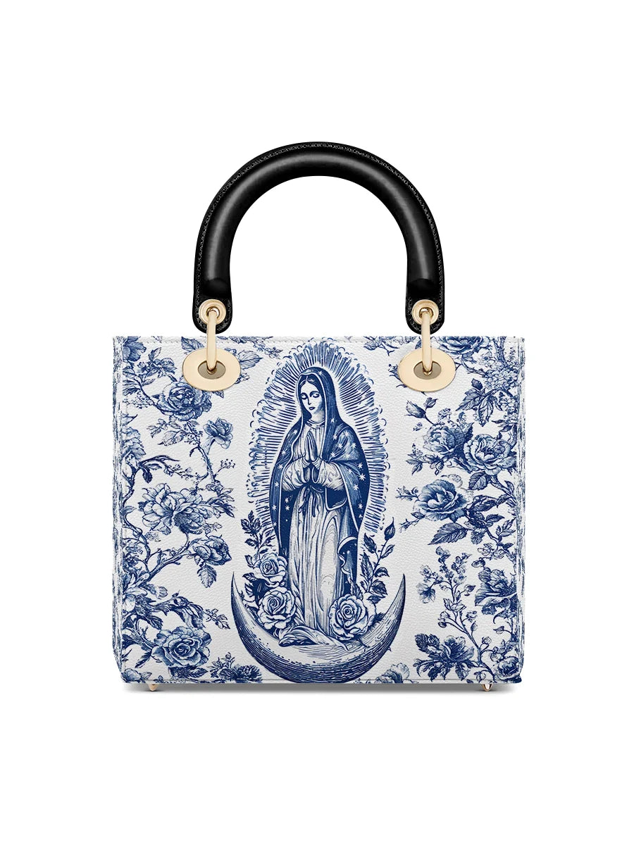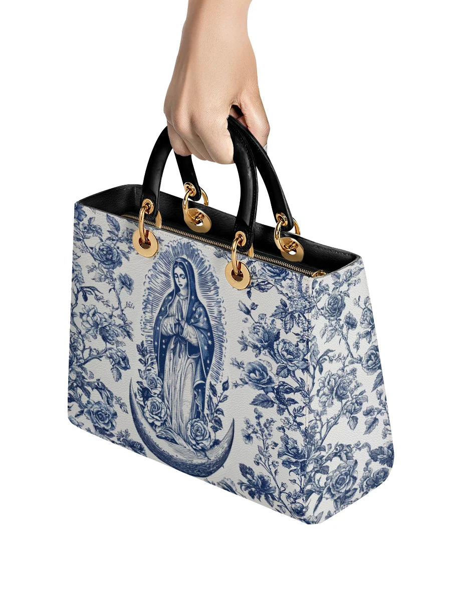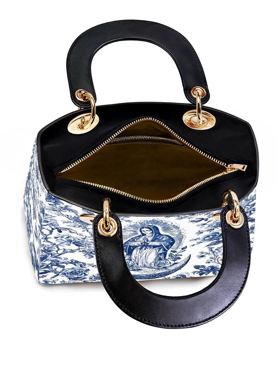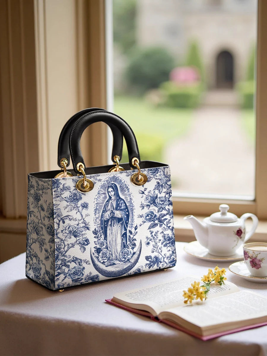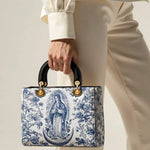 The Sacred Serenity Virgin Mary Leather Bag is a beautifully designed handbag that combines faith, elegance, and artistry. Made from premium leather, this tote features a classic blue-and-white toile pattern adorned with a graceful depiction of the Virgin Mary, symbolizing peace and devotion. The structured silhouette, accented with gold-tone hardware and black leather handles, adds a touch of sophistication. Designed for both style and functionality, this bag is perfect for those who want to carry their faith with them in a refined and fashionable way.