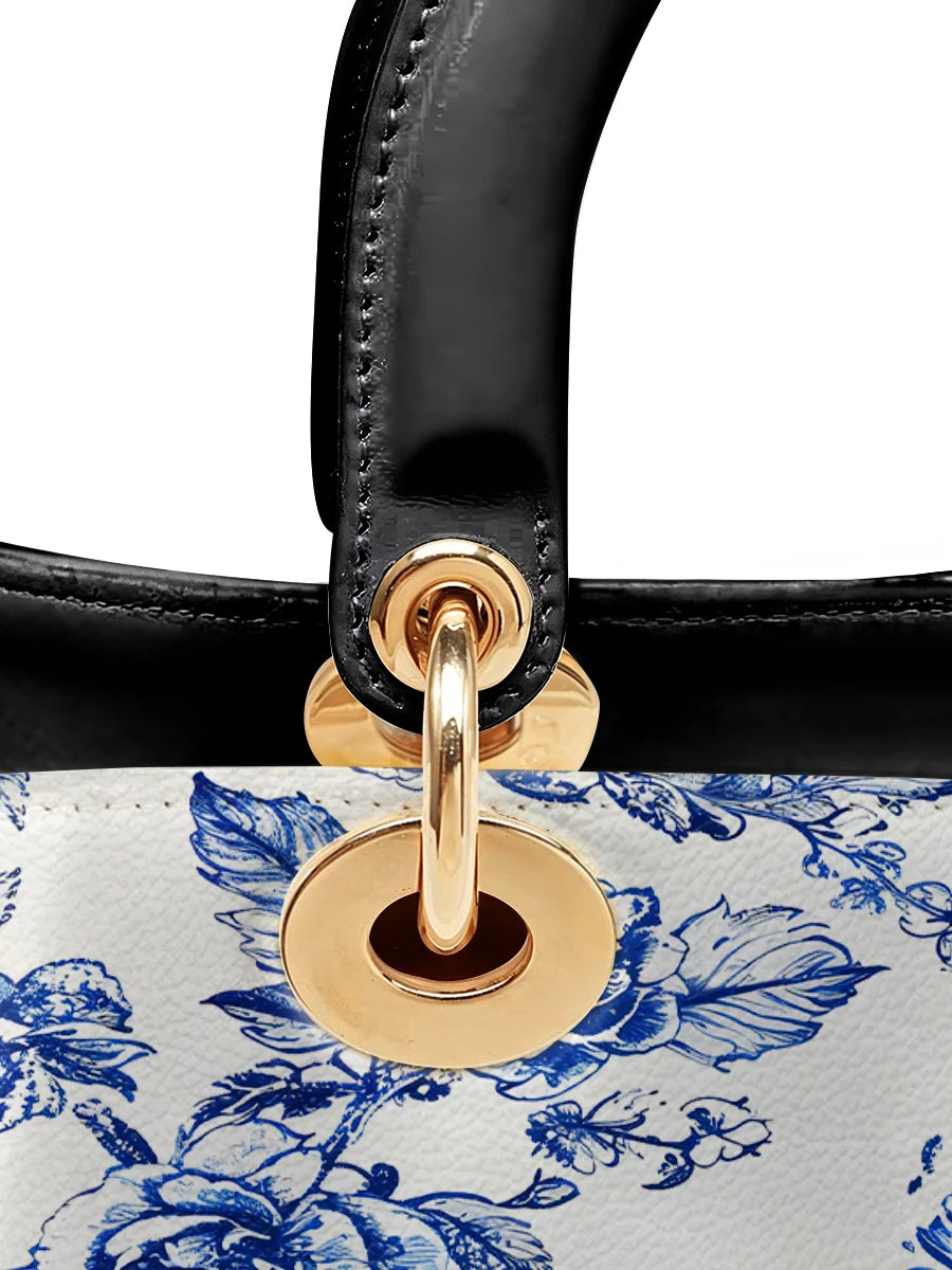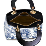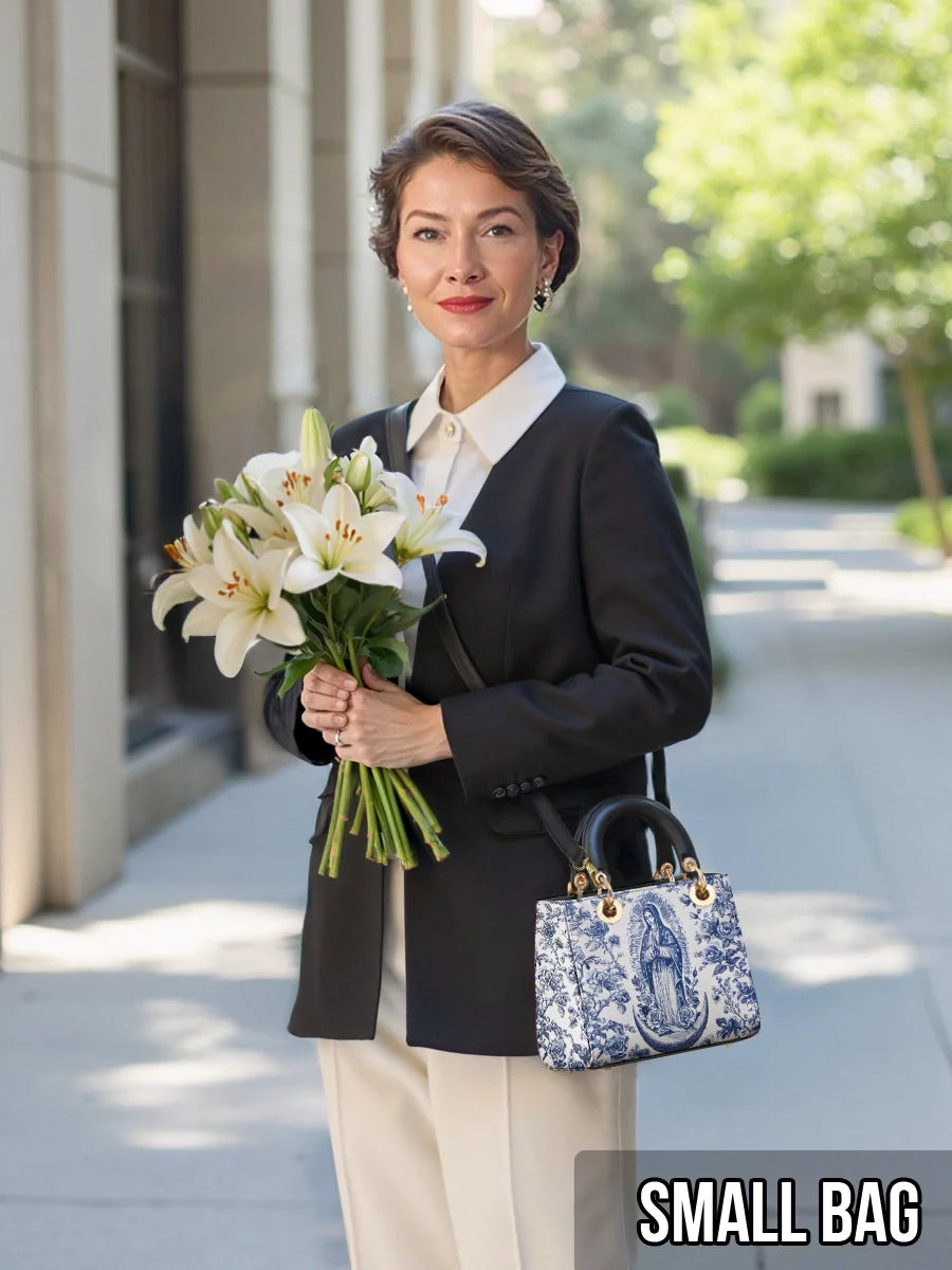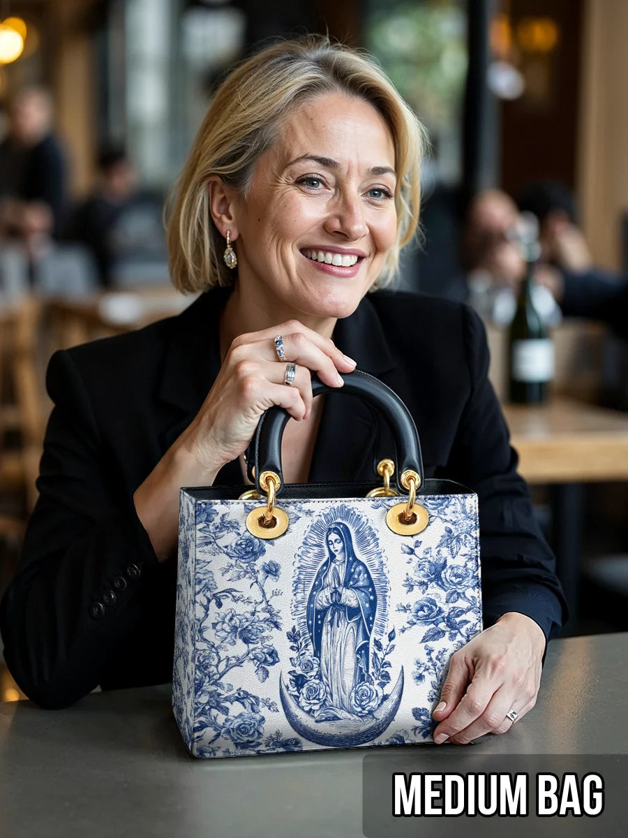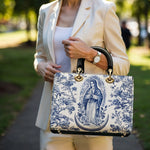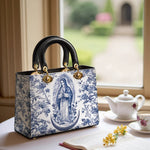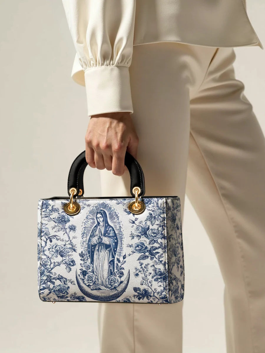The Sacred Serenity Virgin Mary Leather Bag is a beautifully designed handbag that combines faith, elegance, and artistry. Made from premium leather, this tote features a classic blue-and-white toile pattern adorned with a graceful depiction of the Virgin Mary, symbolizing peace and devotion. The structured silhouette, accented with gold-tone hardware and black leather handles, adds a touch of sophistication. Designed for both style and functionality, this bag is perfect for those who want to carry their faith with them in a refined and fashionable way.
