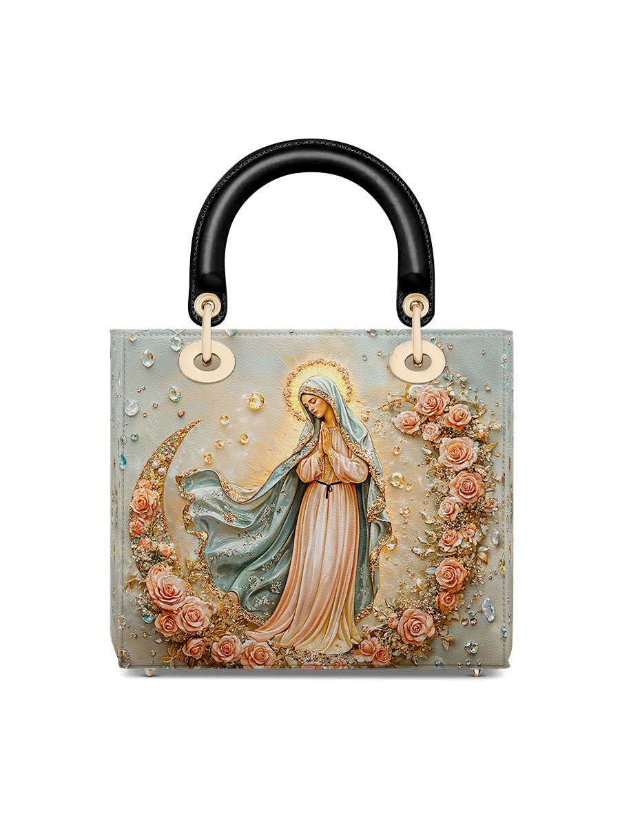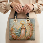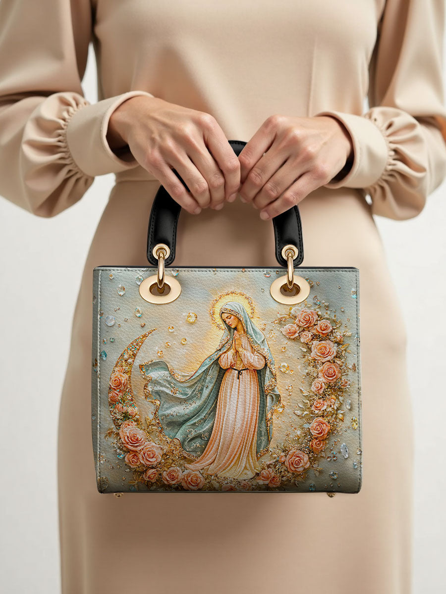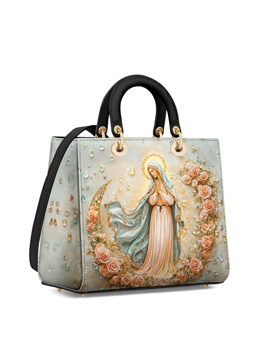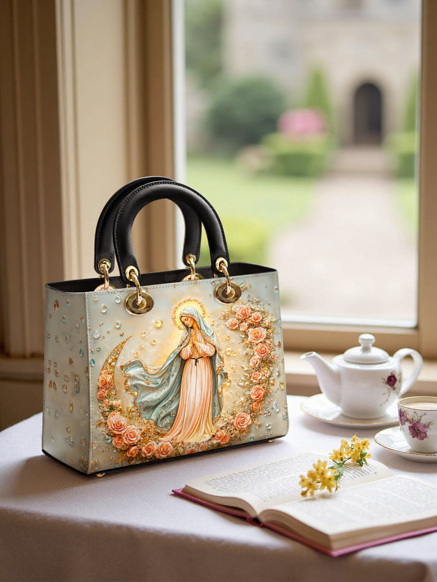 This exquisite leather bag showcases a serene image of the Blessed Virgin Mary standing gracefully on a crescent moon, encircled by delicate roses and soft golden light. The artwork beautifully symbolizes Mary’s purity, humility, and her role as the Queen of Heaven. The intricate details of her flowing veil and the soft pastel hues evoke peace, grace, and divine love, creating a meaningful piece that radiates faith and devotion.