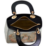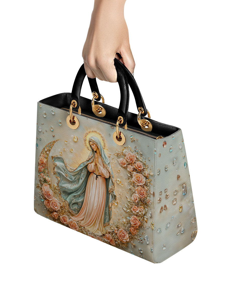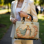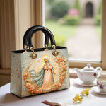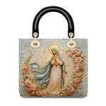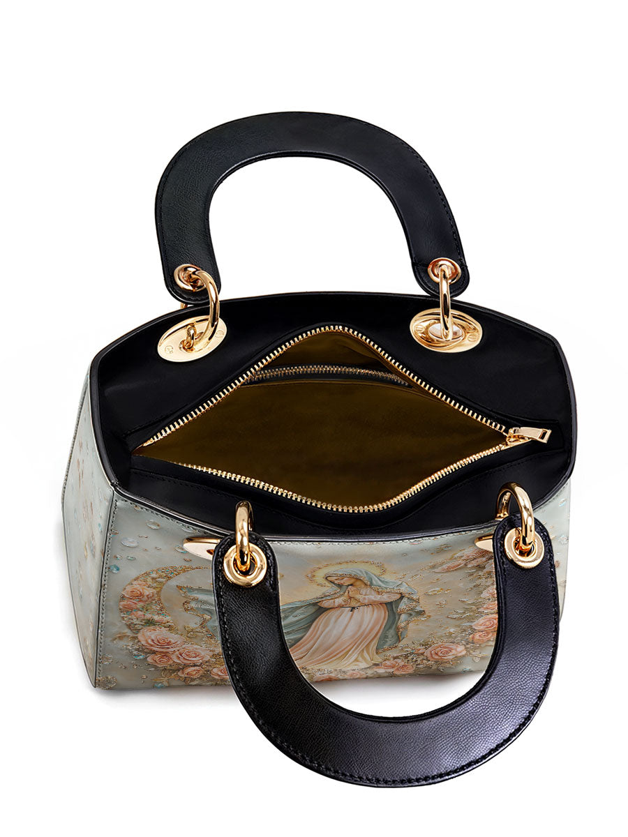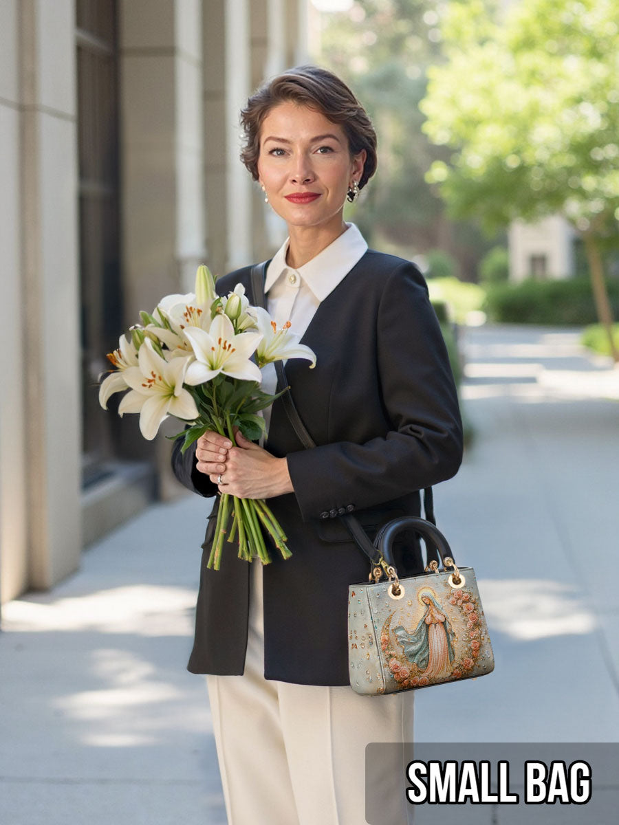 This exquisite leather bag showcases a serene image of the Blessed Virgin Mary standing gracefully on a crescent moon, encircled by delicate roses and soft golden light. The artwork beautifully symbolizes Mary’s purity, humility, and her role as the Queen of Heaven. The intricate details of her flowing veil and the soft pastel hues evoke peace, grace, and divine love, creating a meaningful piece that radiates faith and devotion.