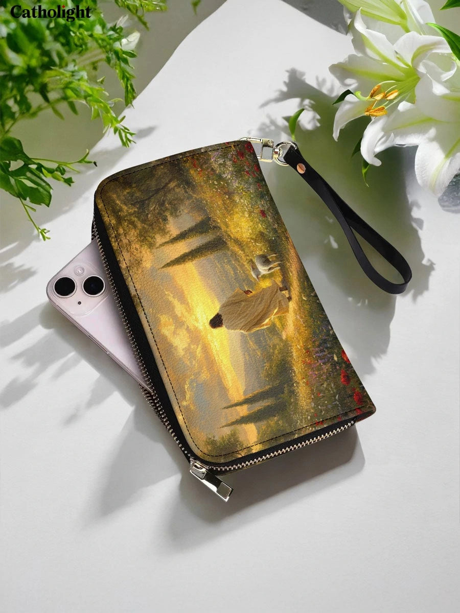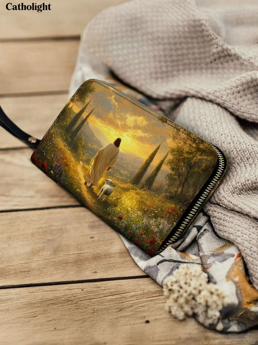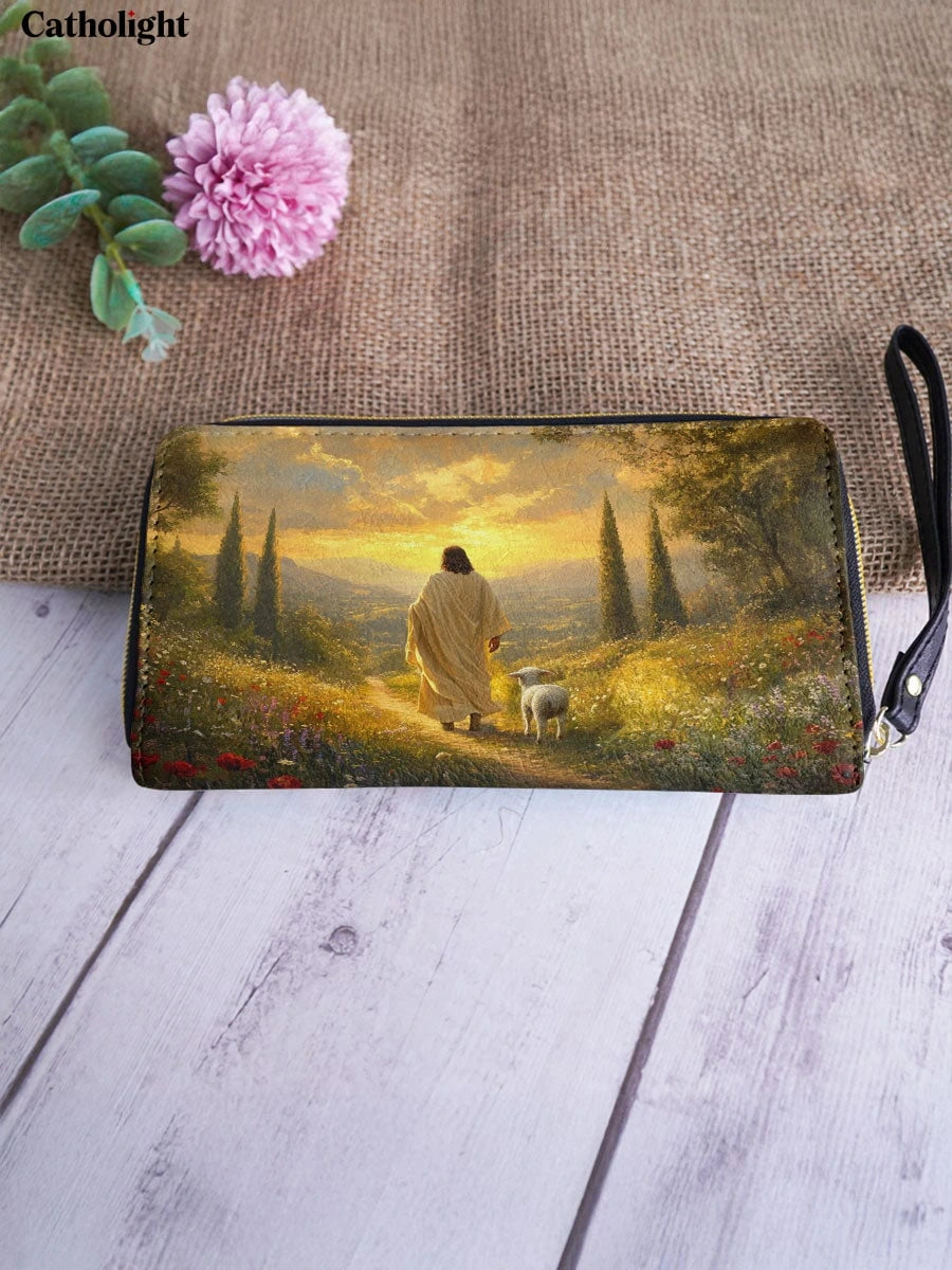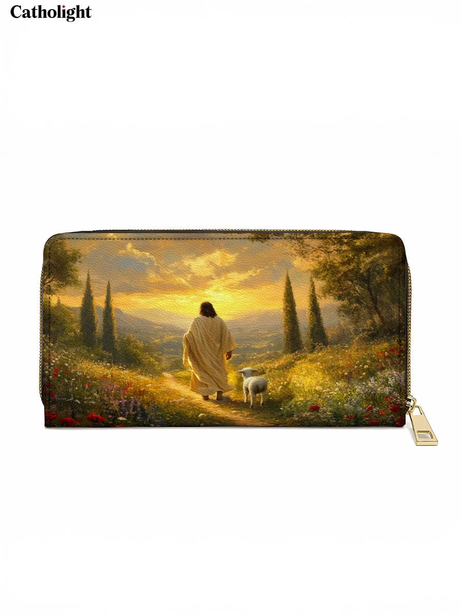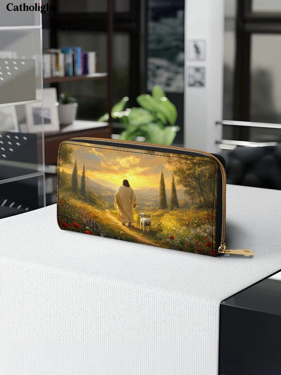 Ce portefeuille magnifiquement conçu capture un moment paisible de Jésus en tant que Bon Berger, marchant à travers un pré doré au coucher du soleil avec un agneau à ses côtés. La douce lumière radieuse du soleil couchant symbolise la guidance divine et le réconfort de la présence du Christ, tandis que les fleurs sauvages vibrantes et les collines ondulantes reflètent la beauté et l'harmonie de la création de Dieu. L'image inspire un sentiment de paix, de réassurance et de connexion à la foi.