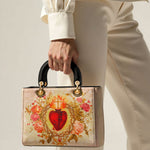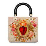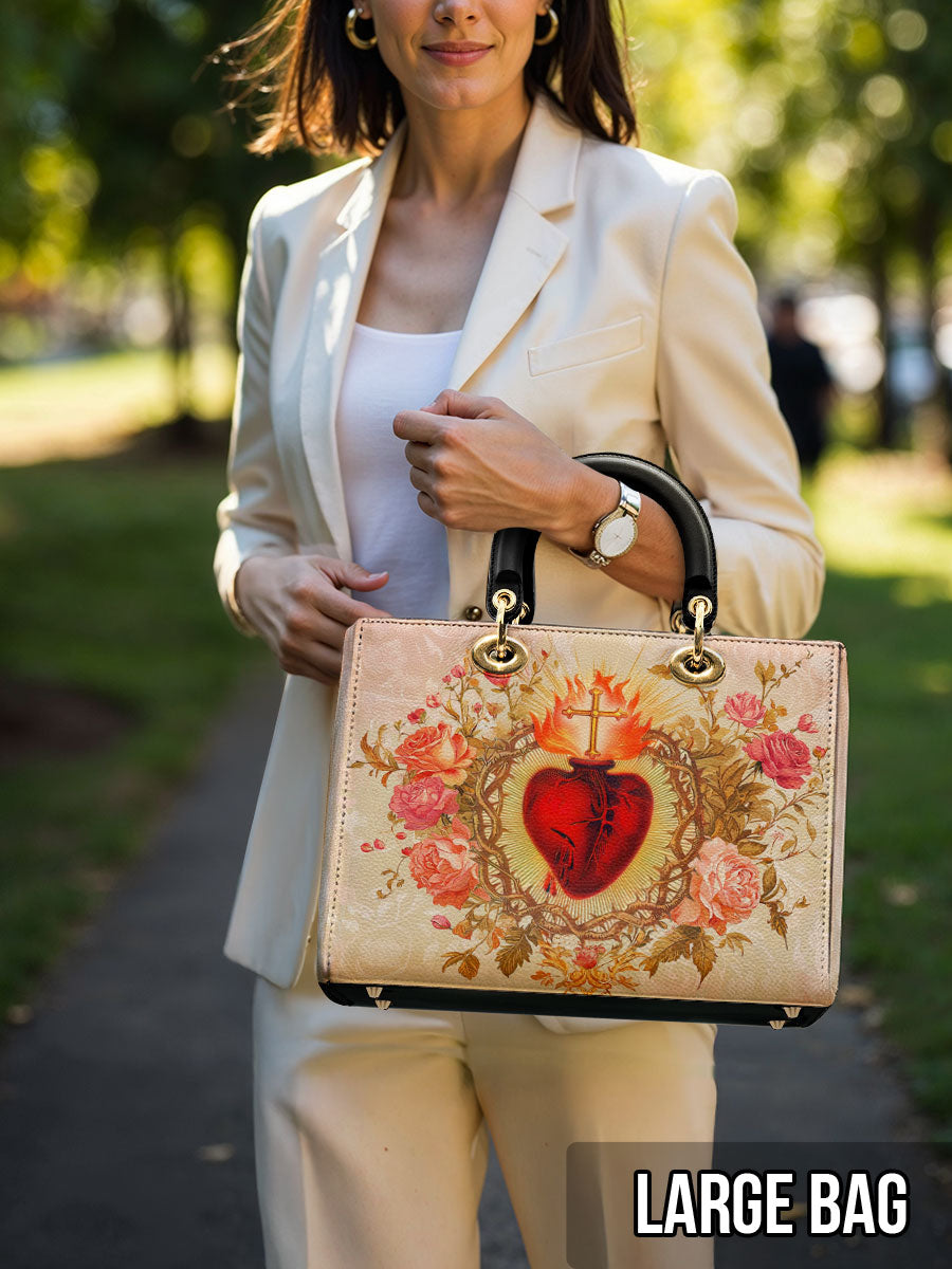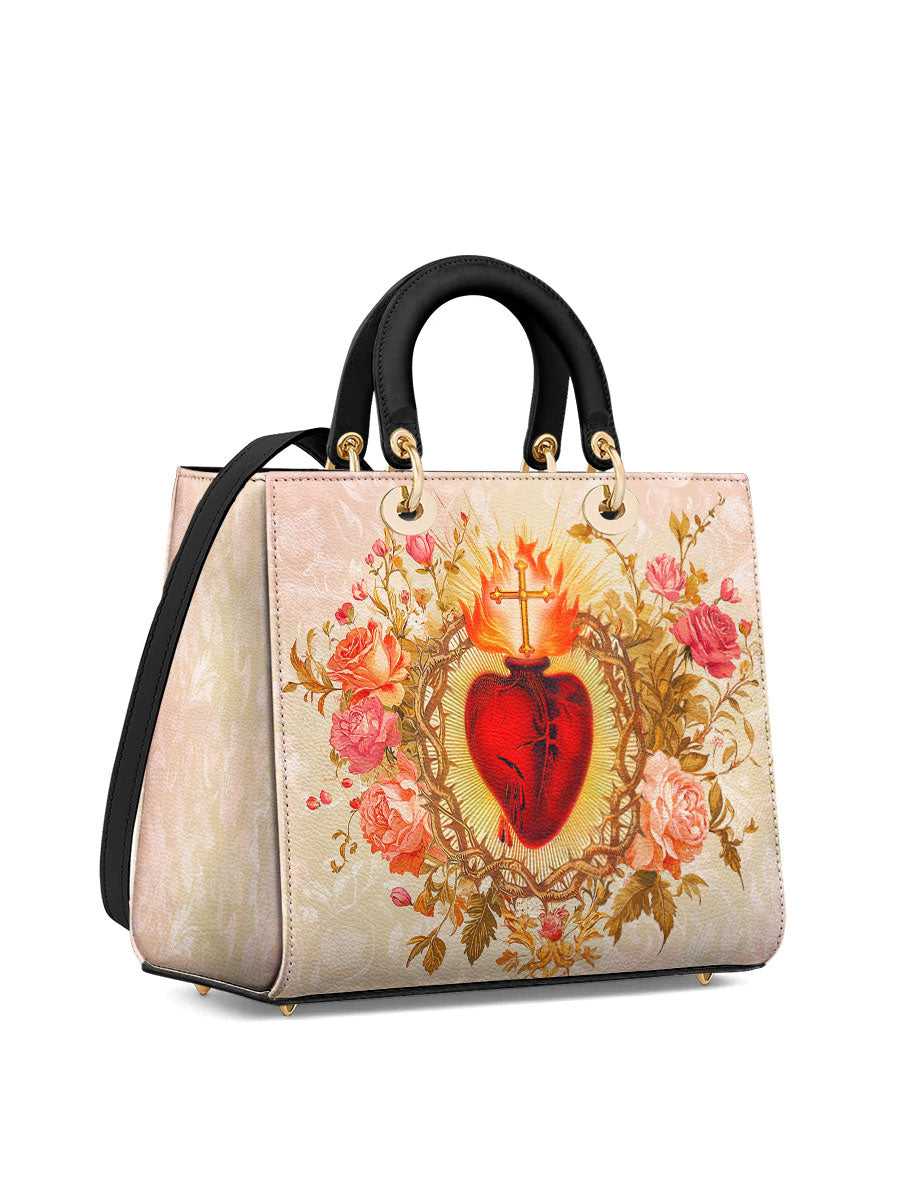 This Lady Leather Bag features a striking image of the Sacred Heart of Jesus, encircled by thorns and crowned with a radiant flame and cross—symbols of divine love, sacrifice, and mercy. The rich red heart glows with spiritual intensity, while the surrounding roses and golden leaves soften the composition with a touch of tenderness and devotion.