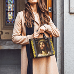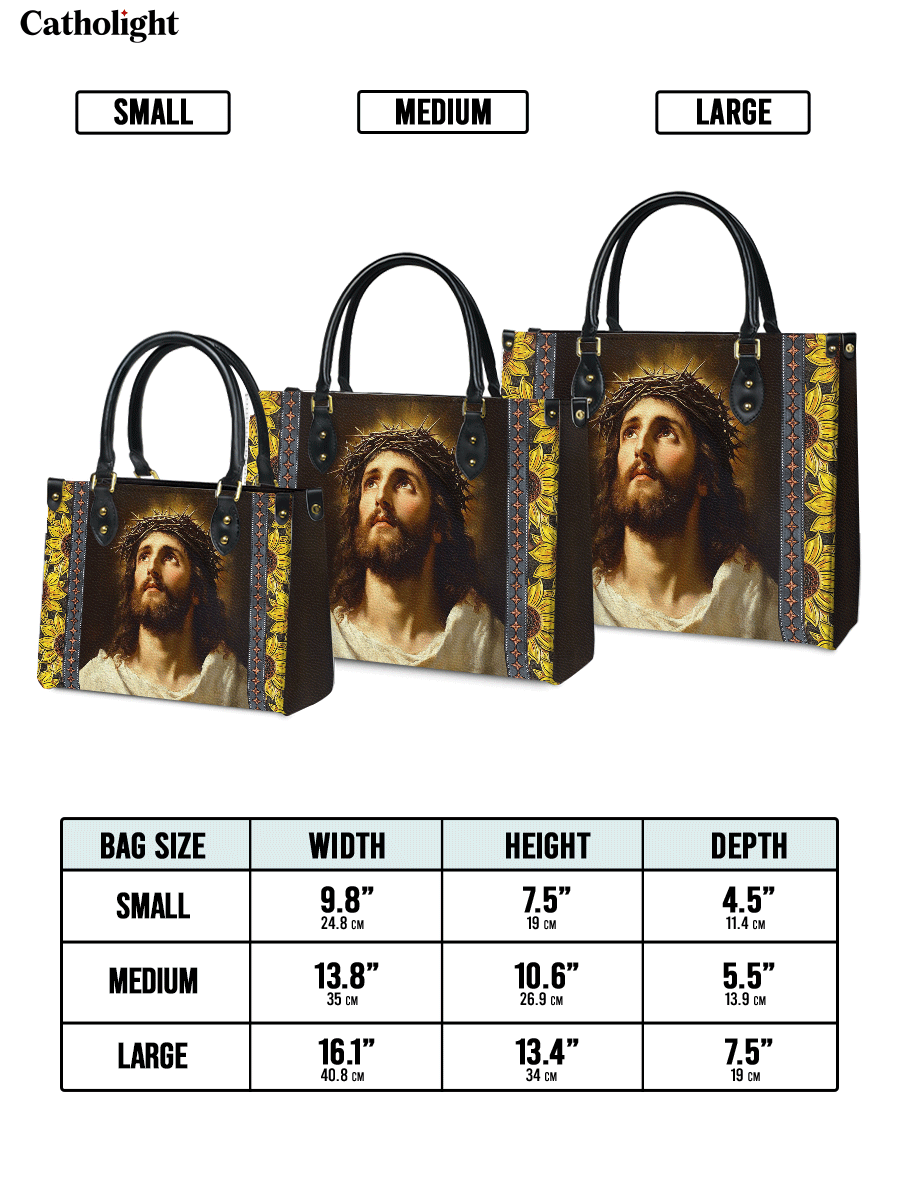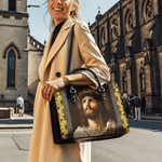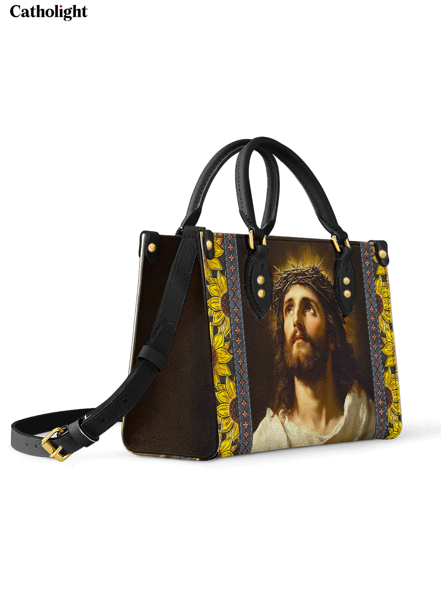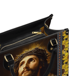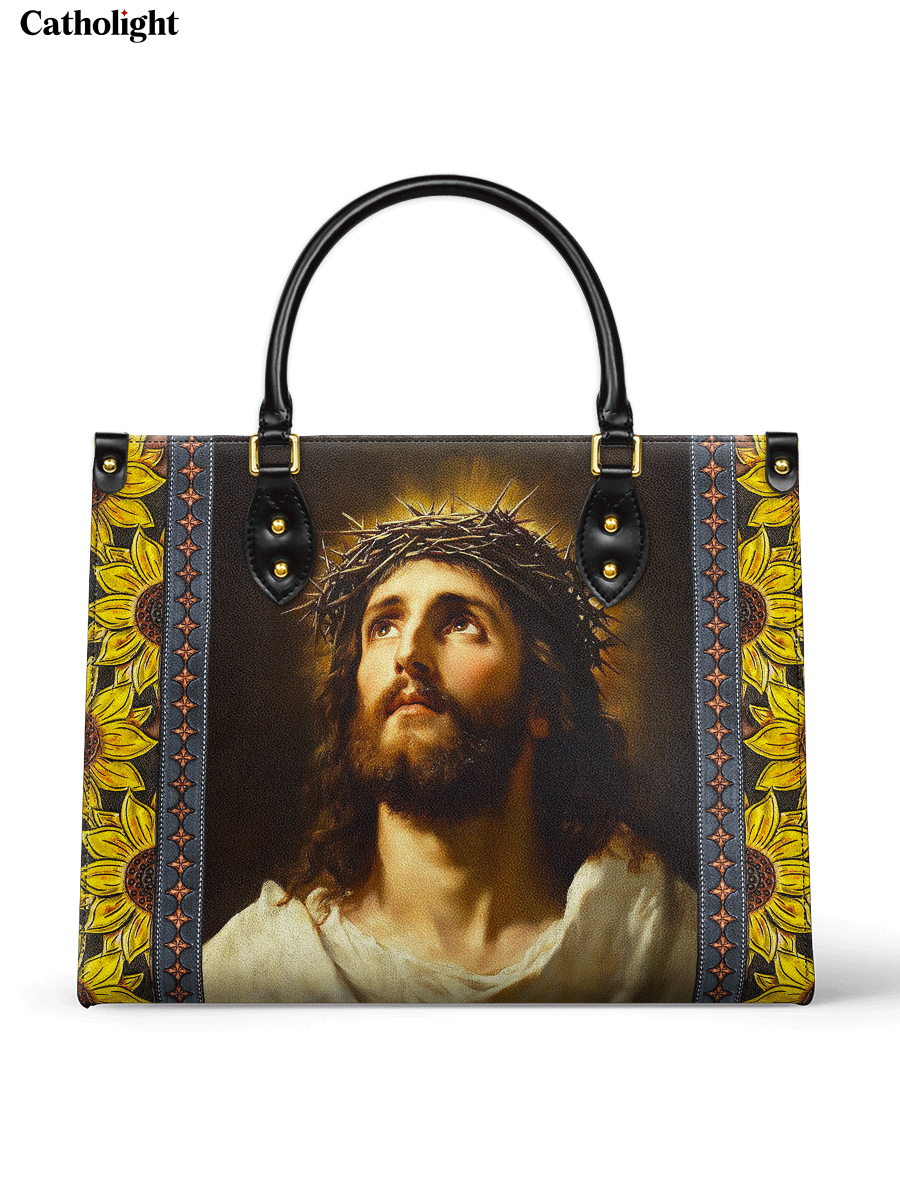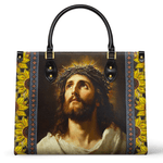 Ce sac en cuir exceptionnel présente une représentation captivante de Jésus-Christ portant la Couronne d'Épines, son regard levé vers le ciel dans une profonde dévotion et une force spirituelle. L'œuvre est baignée d'une douce lumière divine, symbolisant la rédemption, l'espoir et une foi indéfectible au milieu des épreuves. L'image centrale évoque une profonde résonance émotionnelle, entraînant le spectateur dans son récit sacré.
