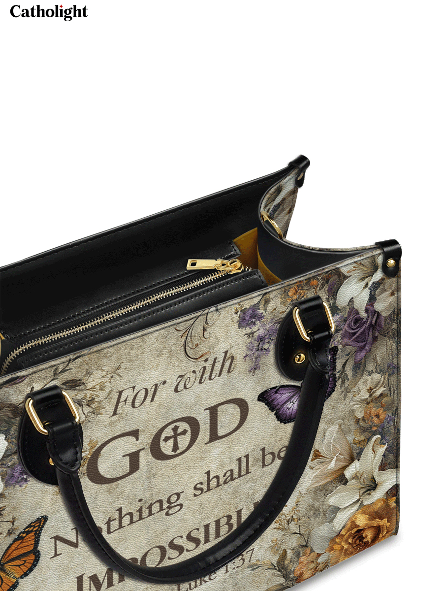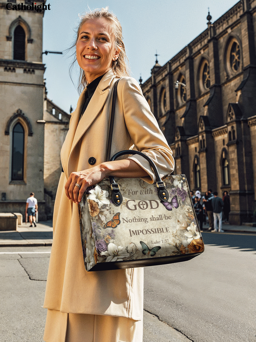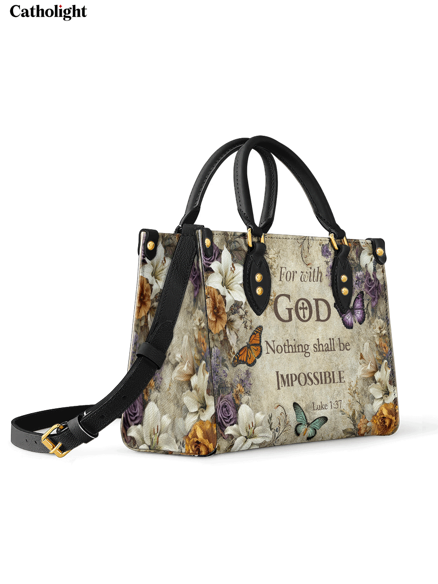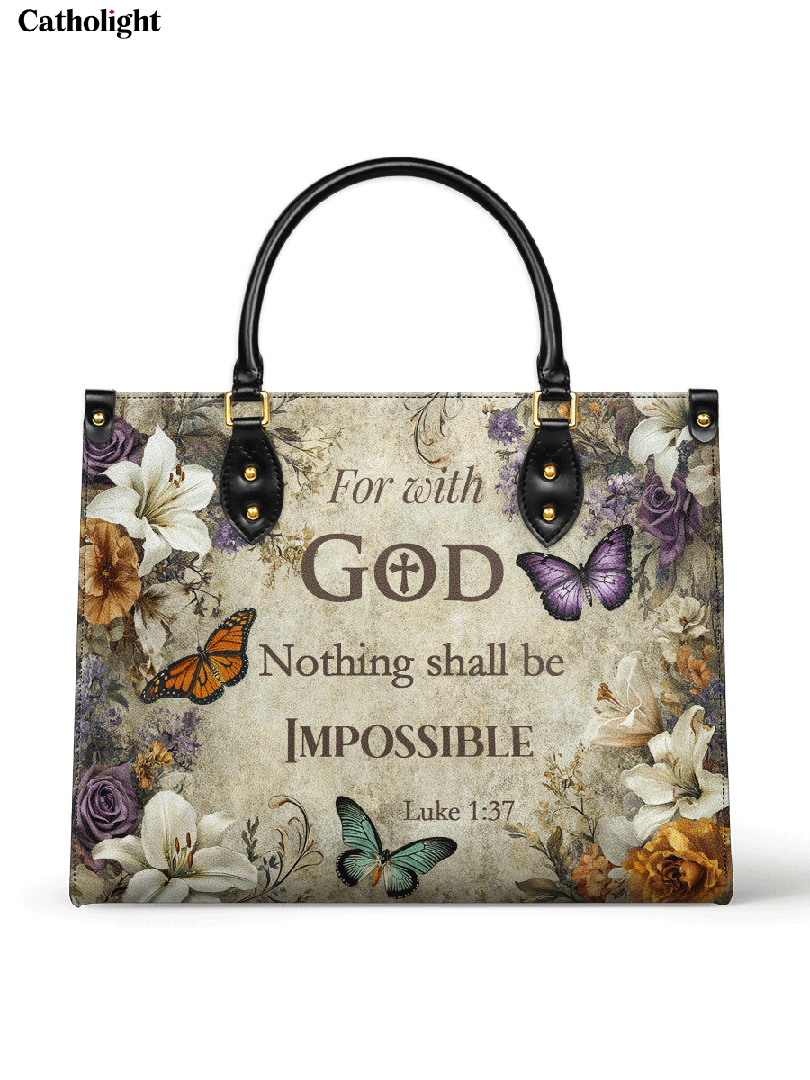 Célébrez une foi inébranlable avec ce sac en cuir inspirant, magnifiquement orné d'un puissant message de Luc 1:37 : "Car rien n'est impossible à Dieu." Cette déclaration d'espoir et de force est gracieusement entourée d'un délicat arrangement floral mettant en vedette de douces lys, symbolisant la pureté et le renouveau, et des fleurs dorées qui dégagent chaleur et amour divin.