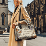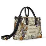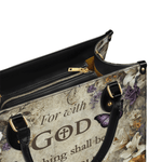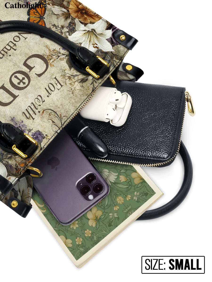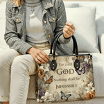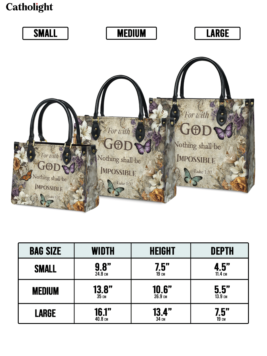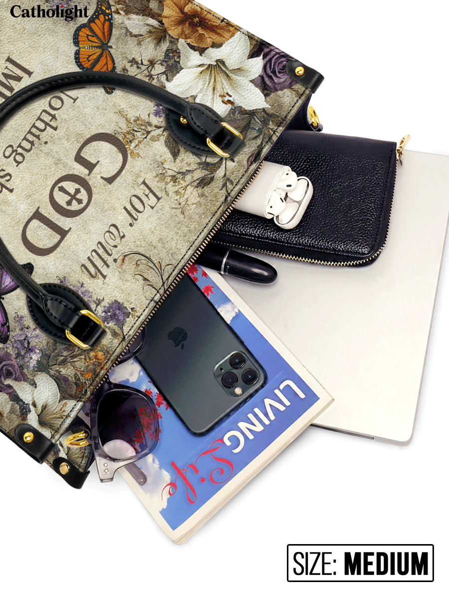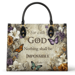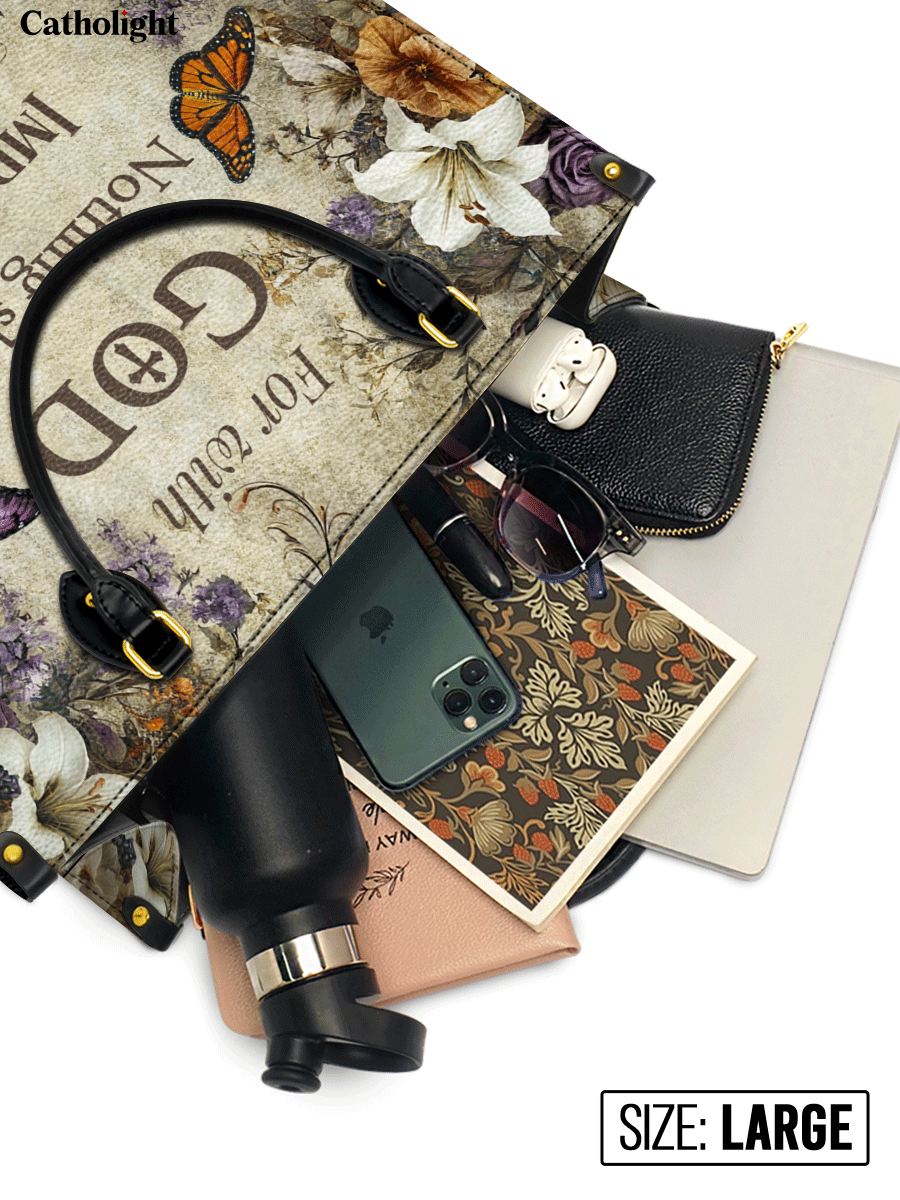 Célébrez une foi inébranlable avec ce sac en cuir inspirant, magnifiquement orné d'un puissant message de Luc 1:37 : "Car rien n'est impossible à Dieu." Cette déclaration d'espoir et de force est gracieusement entourée d'un délicat arrangement floral mettant en vedette de douces lys, symbolisant la pureté et le renouveau, et des fleurs dorées qui dégagent chaleur et amour divin.