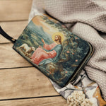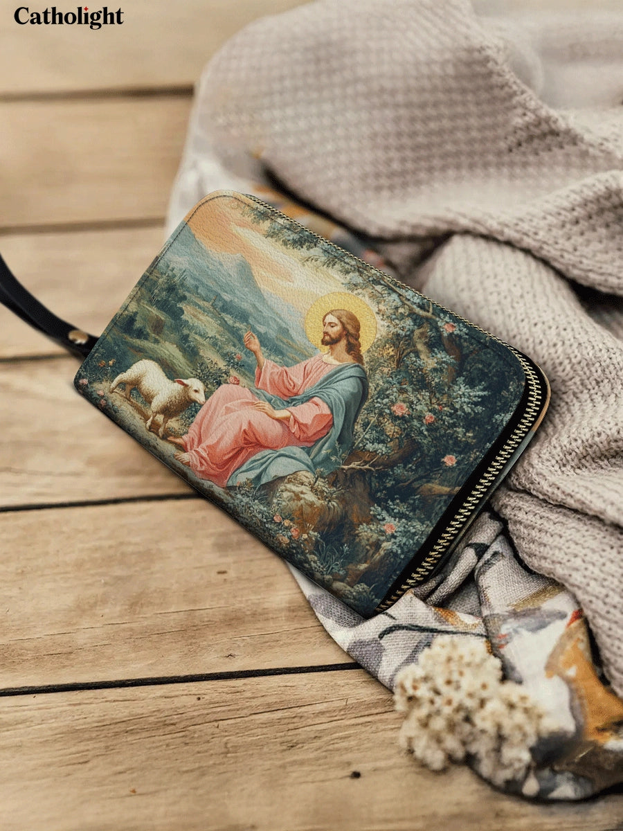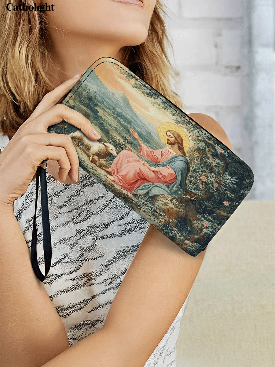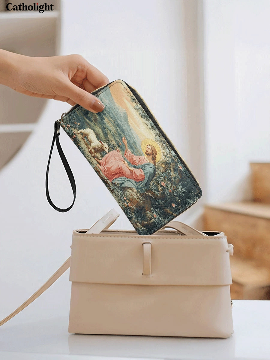 Célébrez la guidance sereine et le soin du Bon Berger avec Le Portefeuille en Cuir de la Grâce du Berger. Ce design élégant présente une image réconfortante du Christ s'occupant de Son agneau, entouré d'une campagne tranquille remplie de beauté naturelle. Les détails délicats et les couleurs apaisantes créent un sentiment de paix et de protection divine.