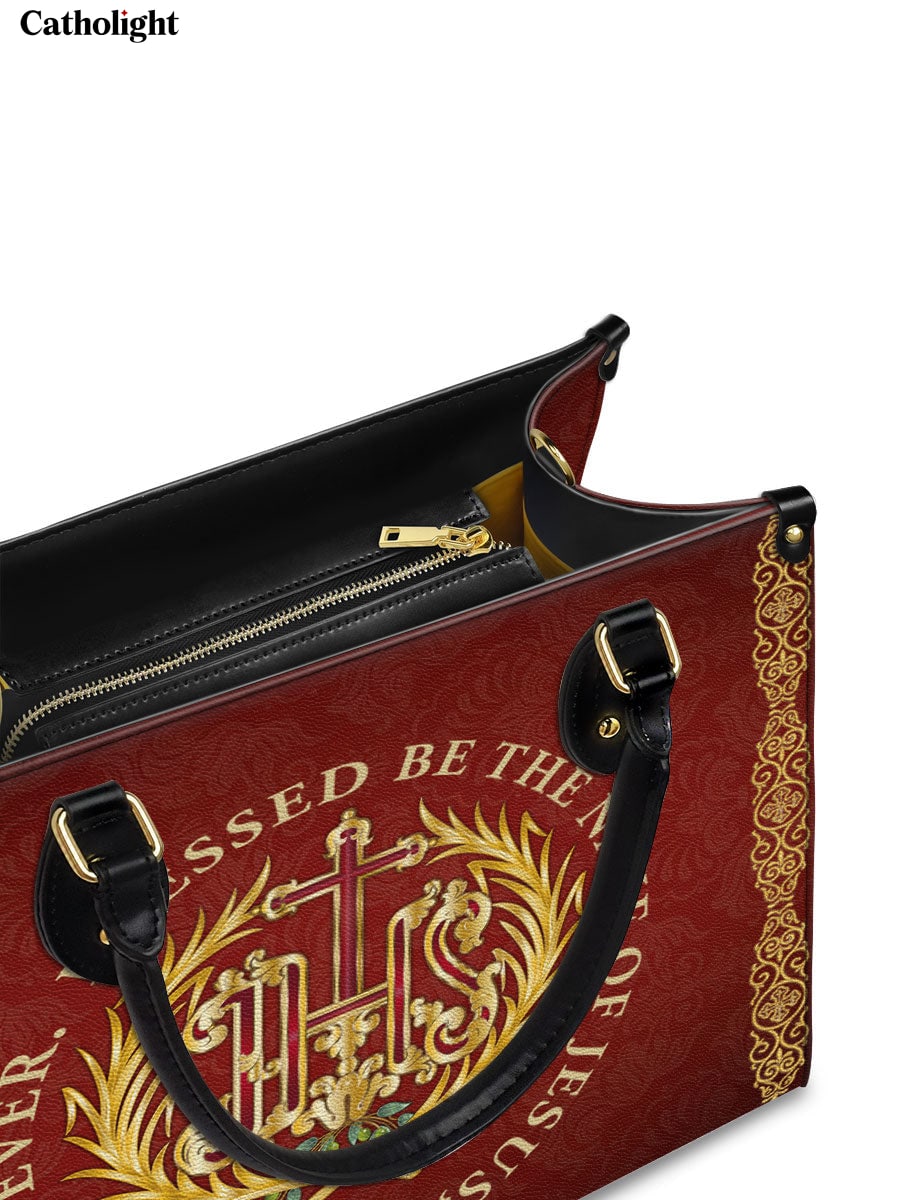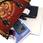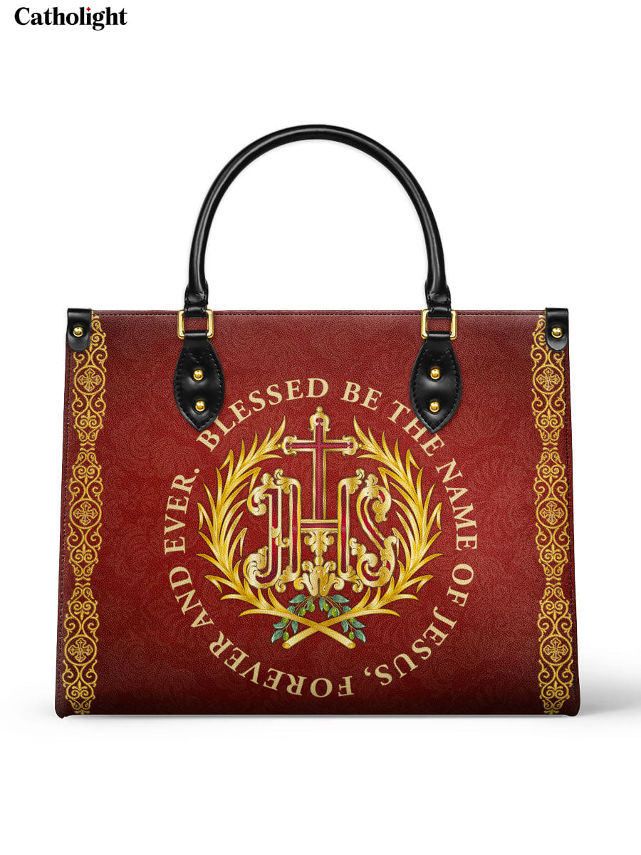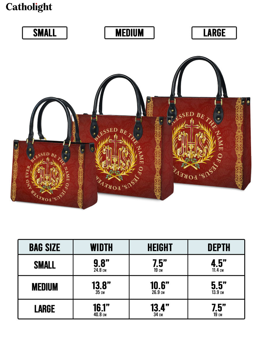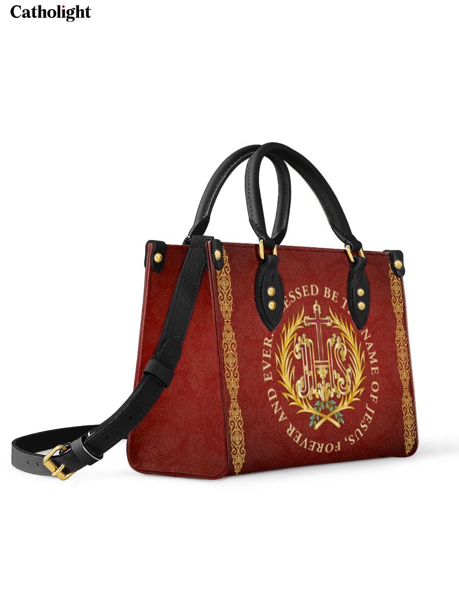 Ce sac en cuir exquis présente le monogramme sacré "IHS", représentant le Saint Nom de Jésus, entouré d'une couronne dorée radieuse et orné de délicats accents floraux. La phrase inspirante “Béni soit le Nom de Jésus, pour les siècles des siècles” est élégamment affichée autour de l'emblème, offrant un puissant rappel de dévotion et de révérence. Le fond cramoisi profond, enrichi de détails dorés complexes, crée un design intemporel qui exhale foi et grâce.