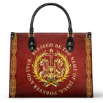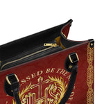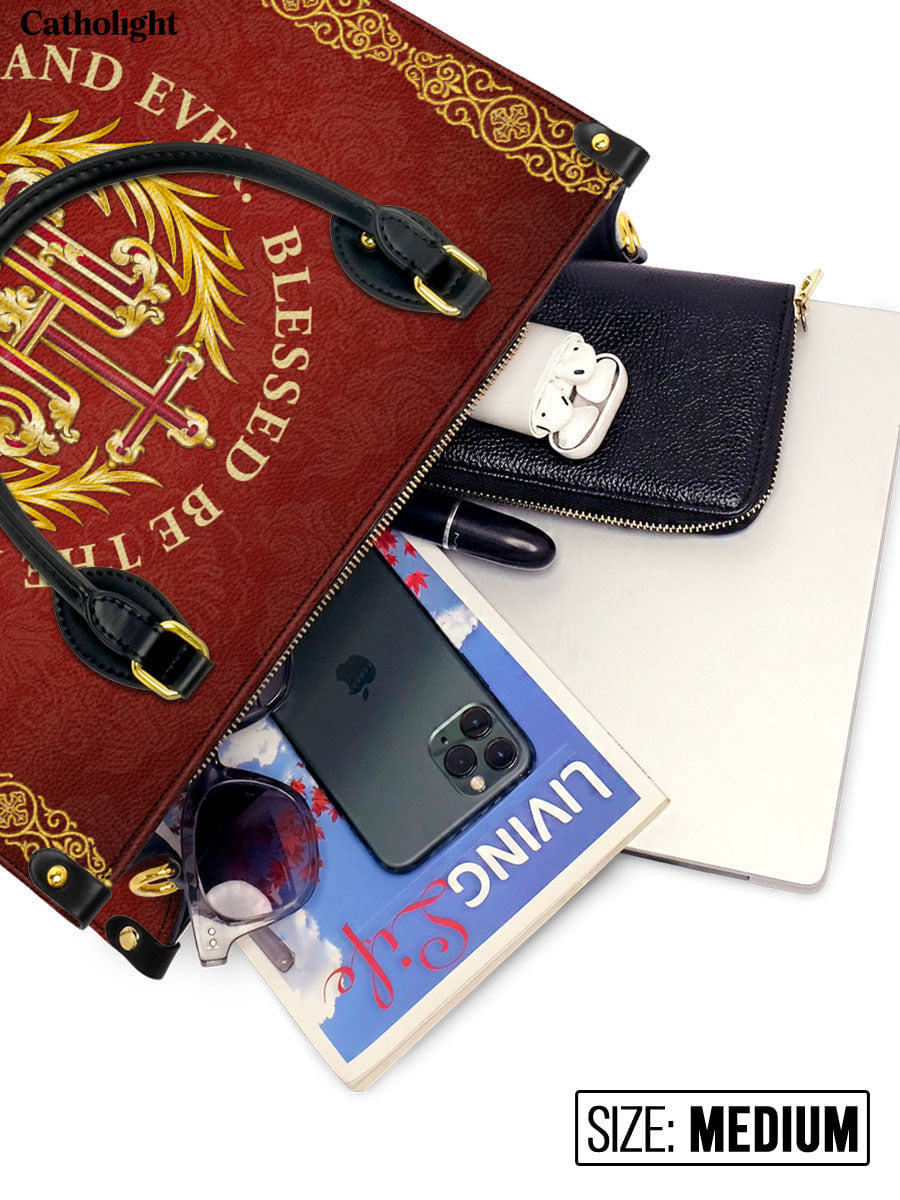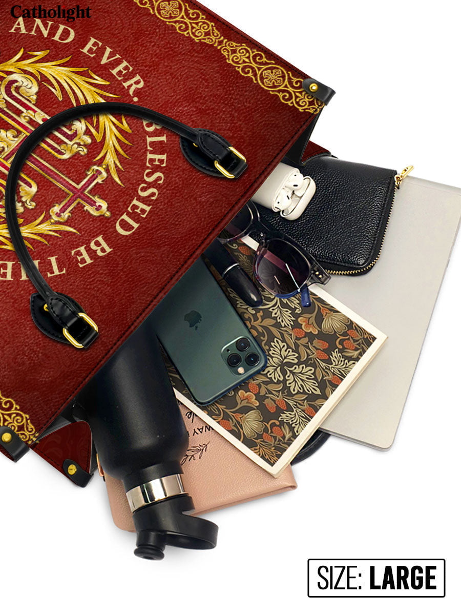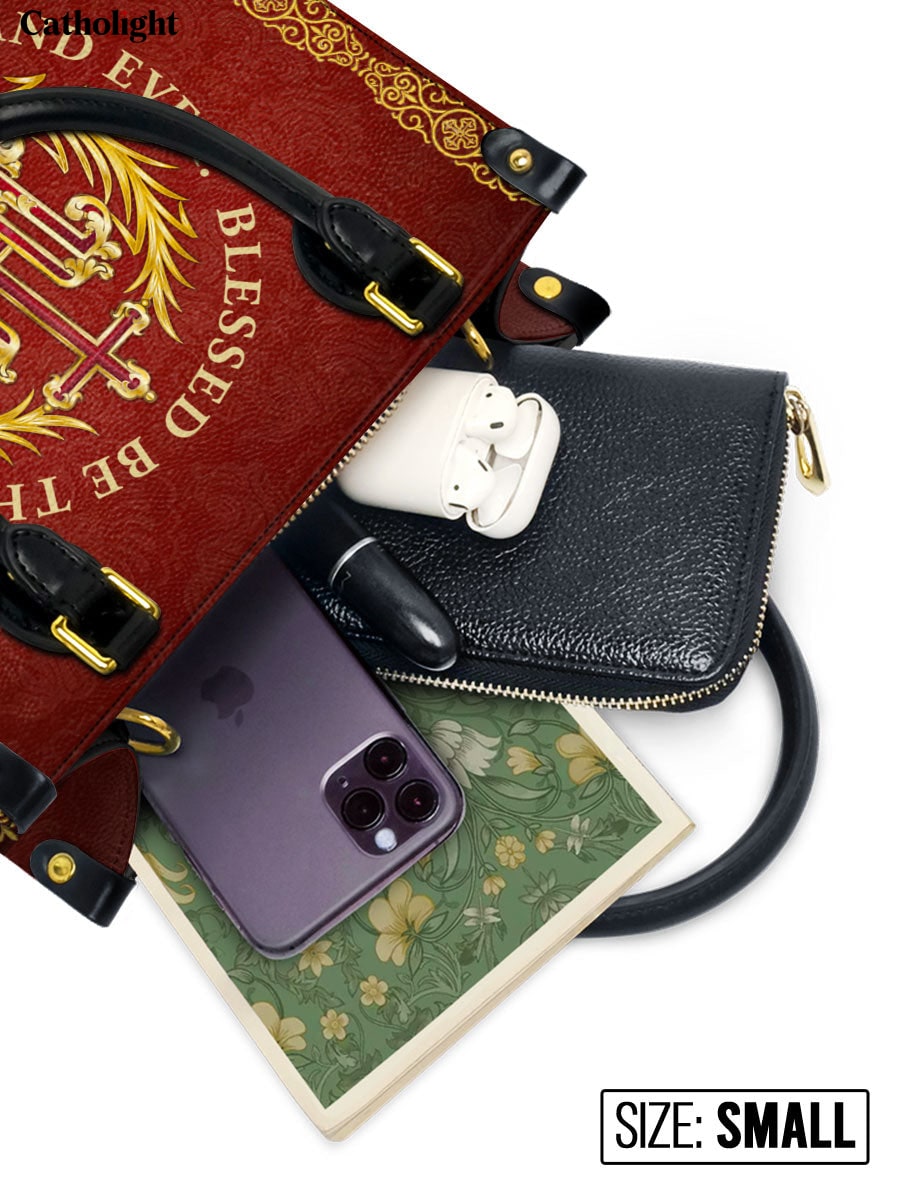 Ce sac en cuir exquis présente le monogramme sacré "IHS", représentant le Saint Nom de Jésus, entouré d'une couronne dorée radieuse et orné de délicats accents floraux. La phrase inspirante “Béni soit le Nom de Jésus, pour les siècles des siècles” est élégamment affichée autour de l'emblème, offrant un puissant rappel de dévotion et de révérence. Le fond cramoisi profond, enrichi de détails dorés complexes, crée un design intemporel qui exhale foi et grâce.