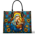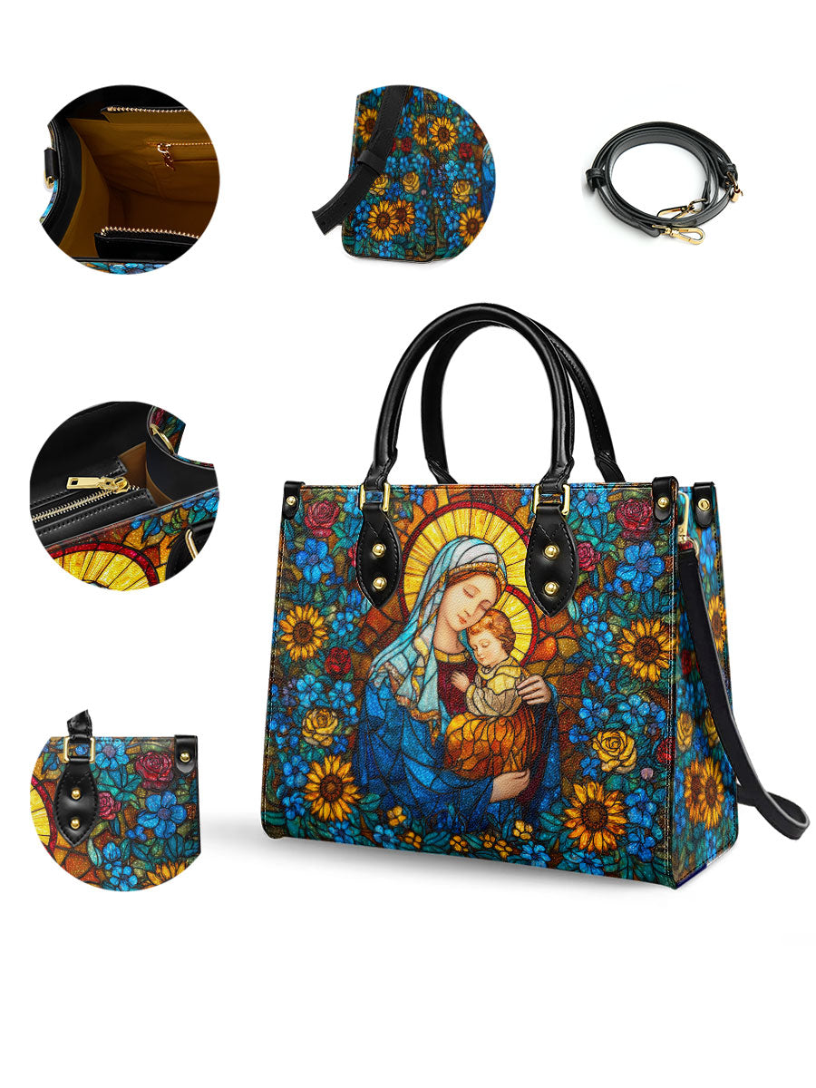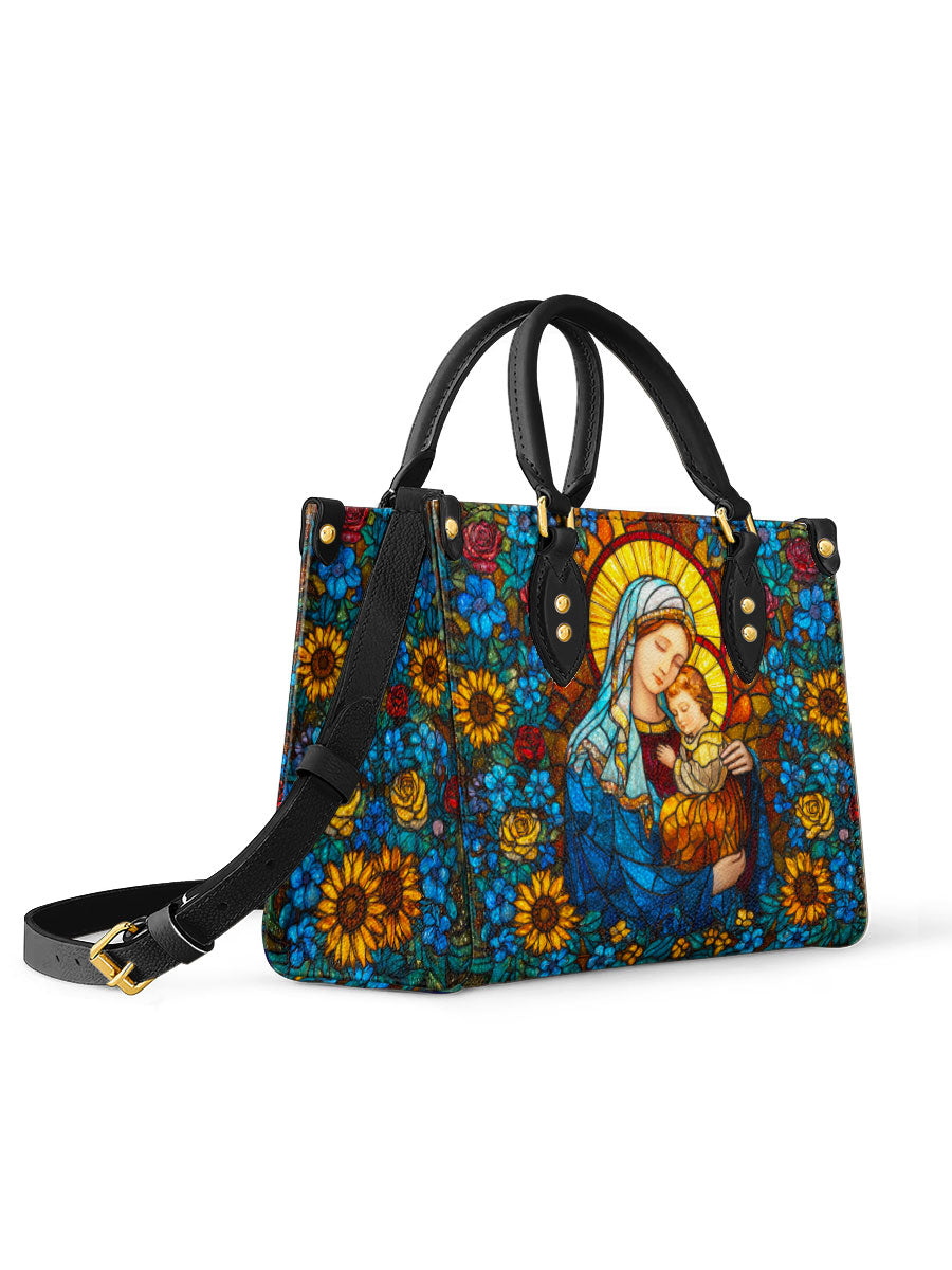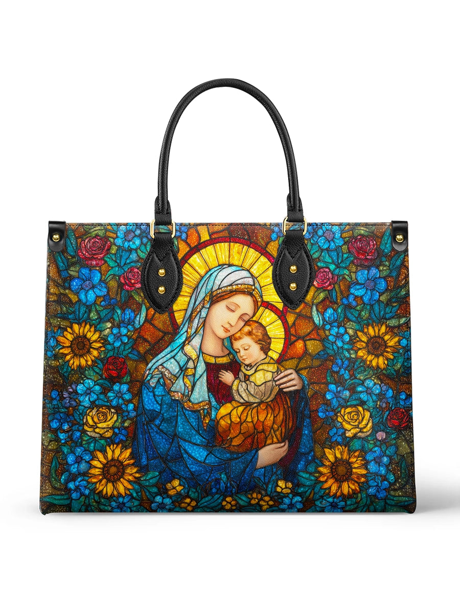This radiant handbag portrays the Virgin Mary tenderly holding the Child Jesus, illuminated in stained glass artistry. Surrounded by sunflowers and roses, the scene reflects divine love, peace, and heavenly light.