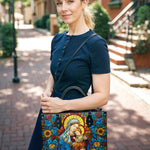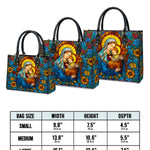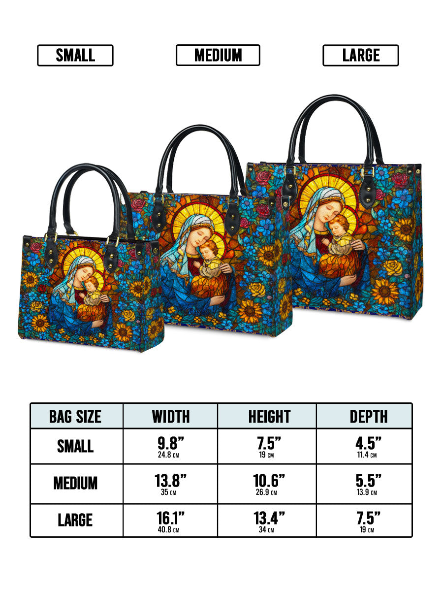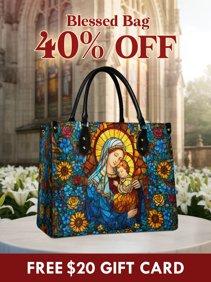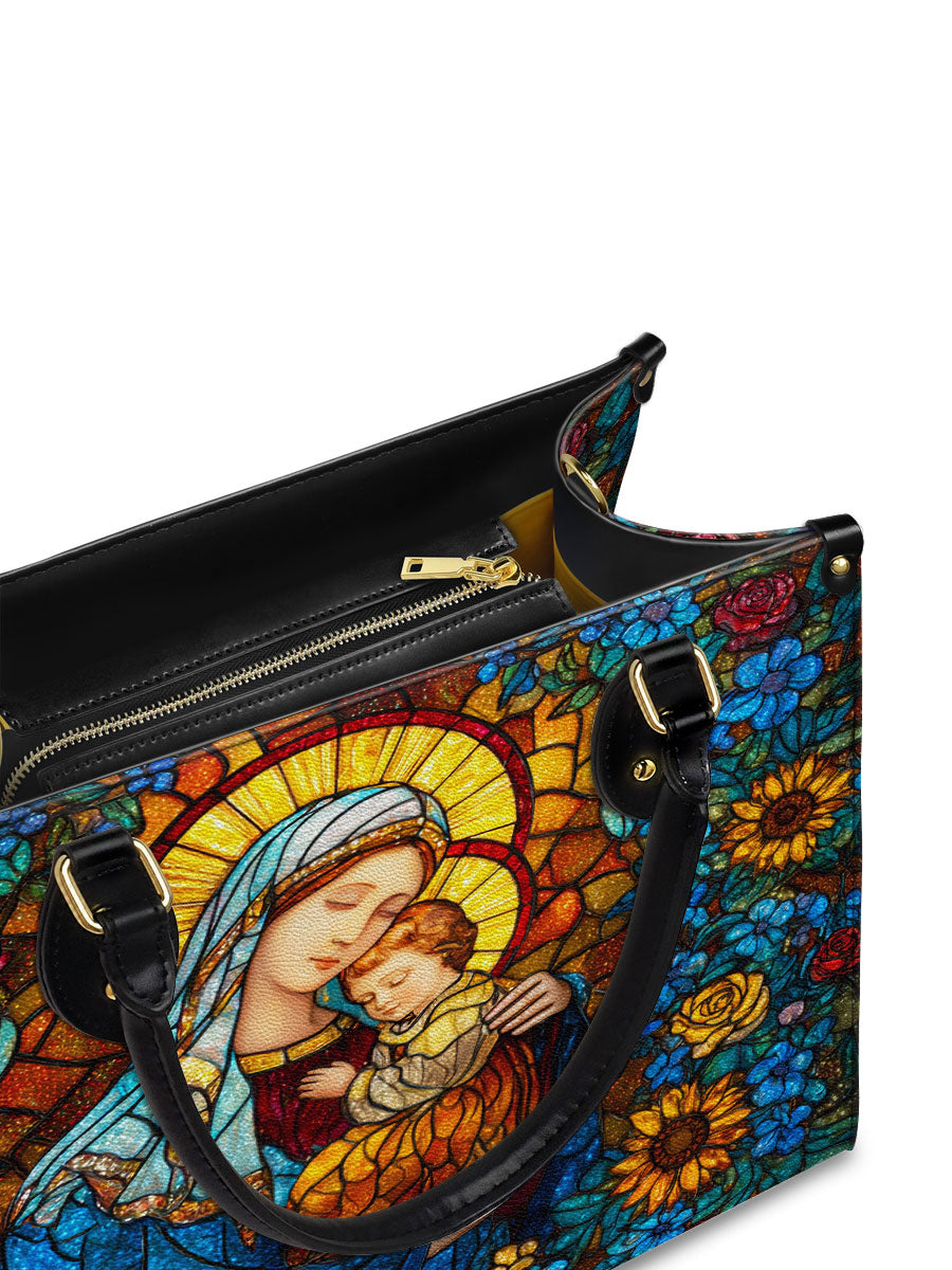 This radiant handbag portrays the Virgin Mary tenderly holding the Child Jesus, illuminated in stained glass artistry. Surrounded by sunflowers and roses, the scene reflects divine love, peace, and heavenly light.