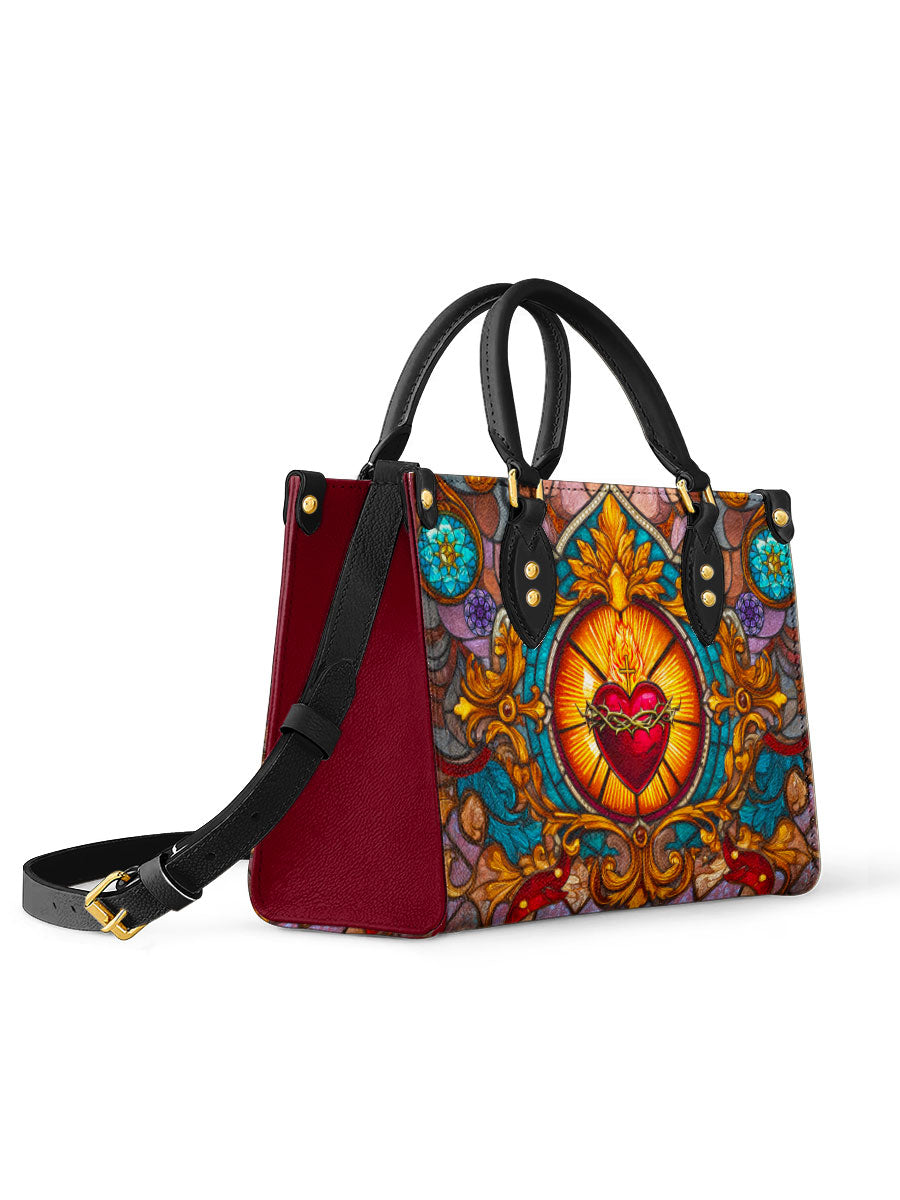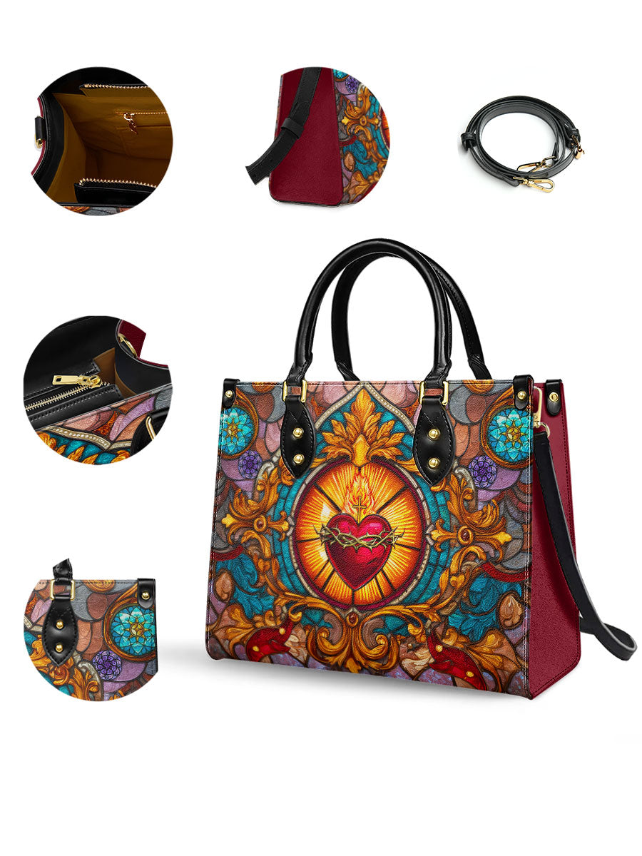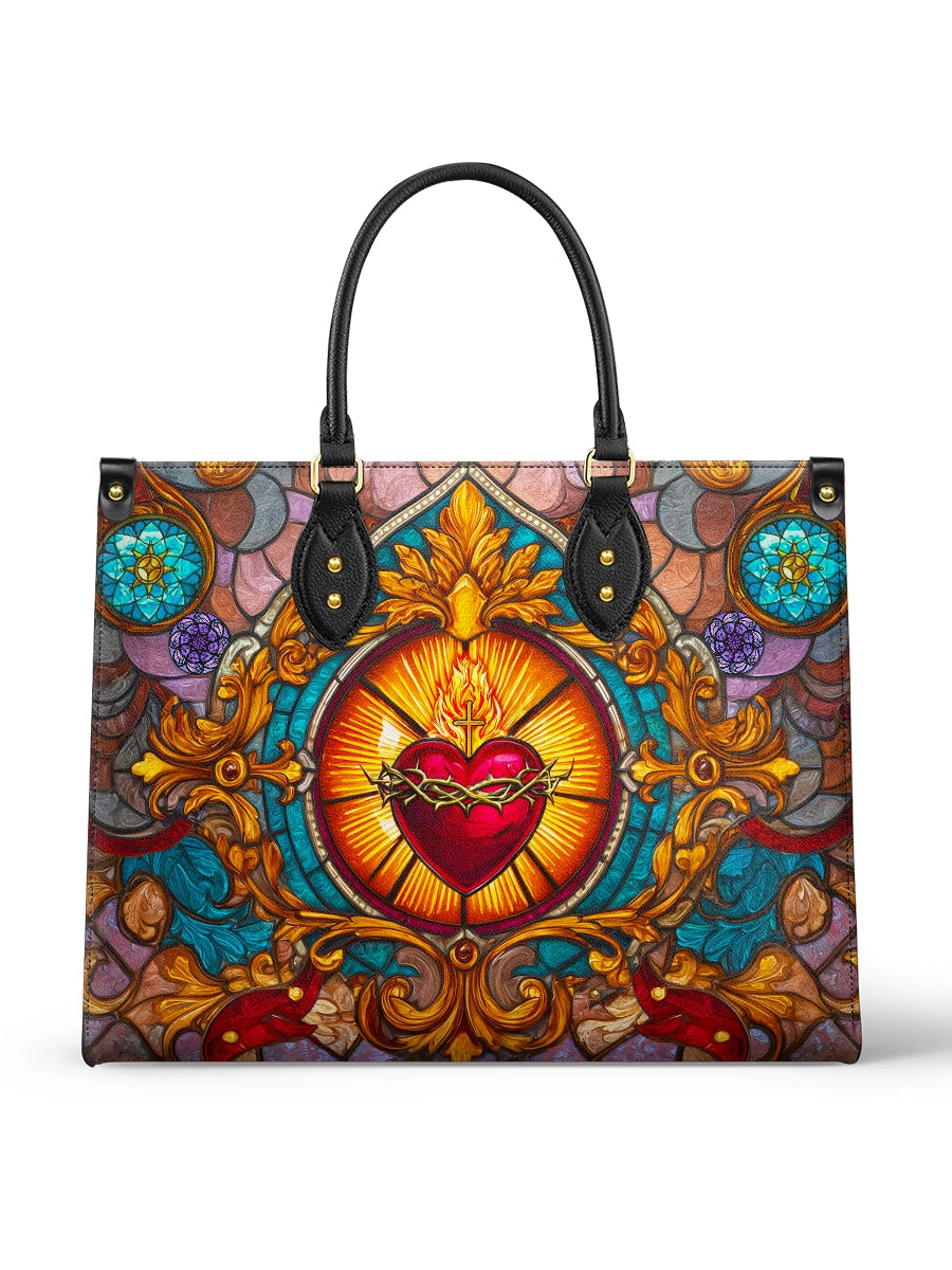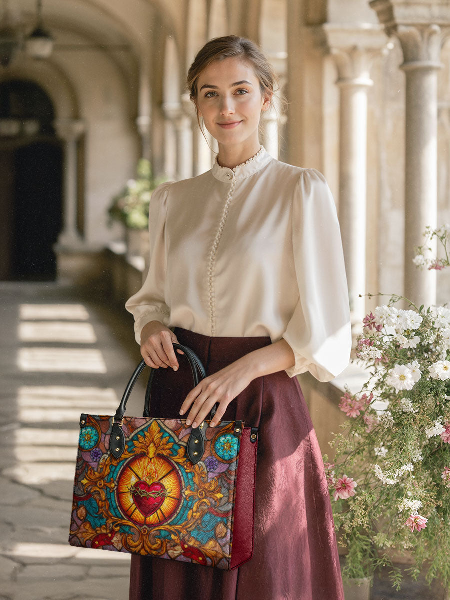 This exquisite handbag showcases the Sacred Heart of Jesus in luminous stained glass artistry — a timeless symbol of divine love, sacrifice, and mercy. The radiant heart, crowned with thorns and glowing with heavenly light, stands as a reminder of Christ’s unfailing compassion.