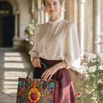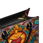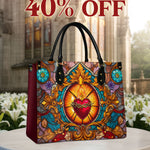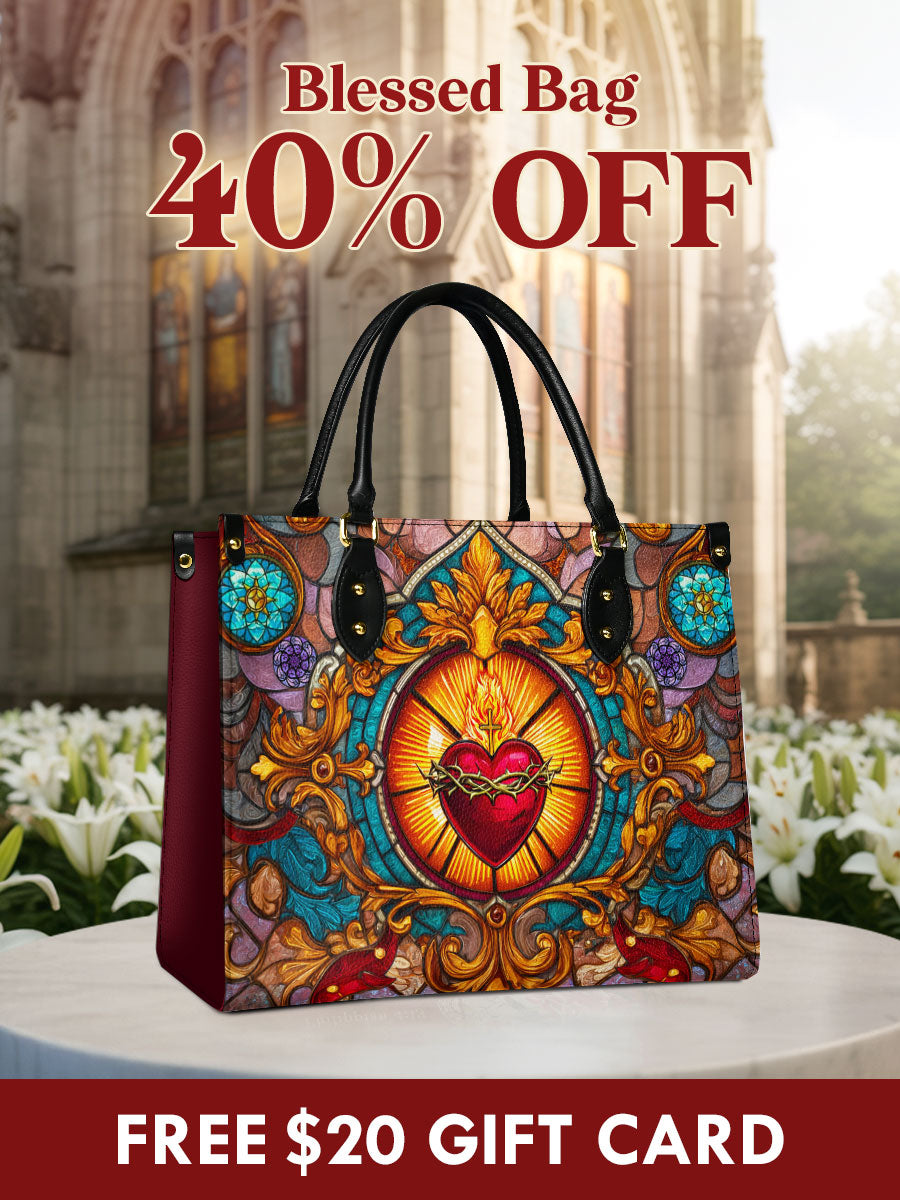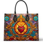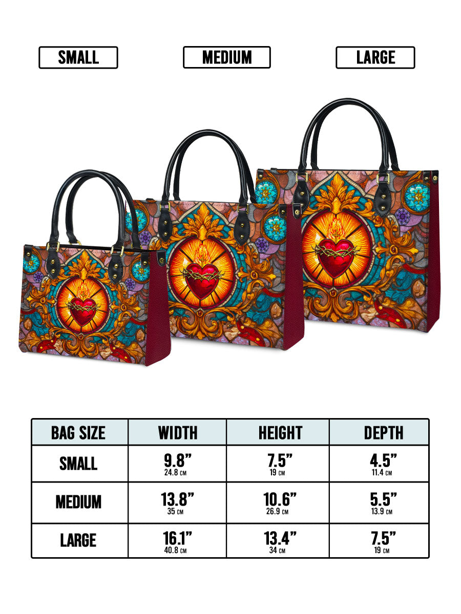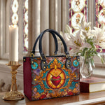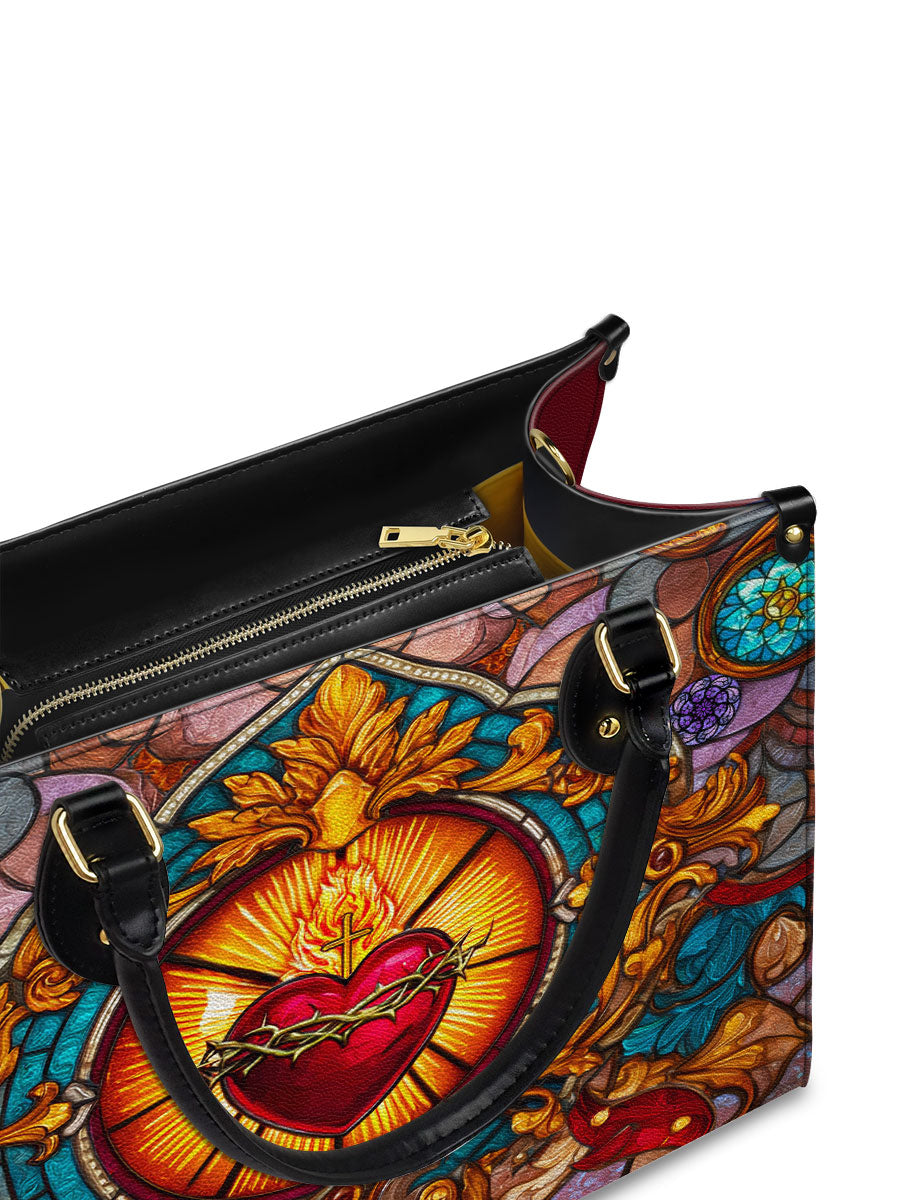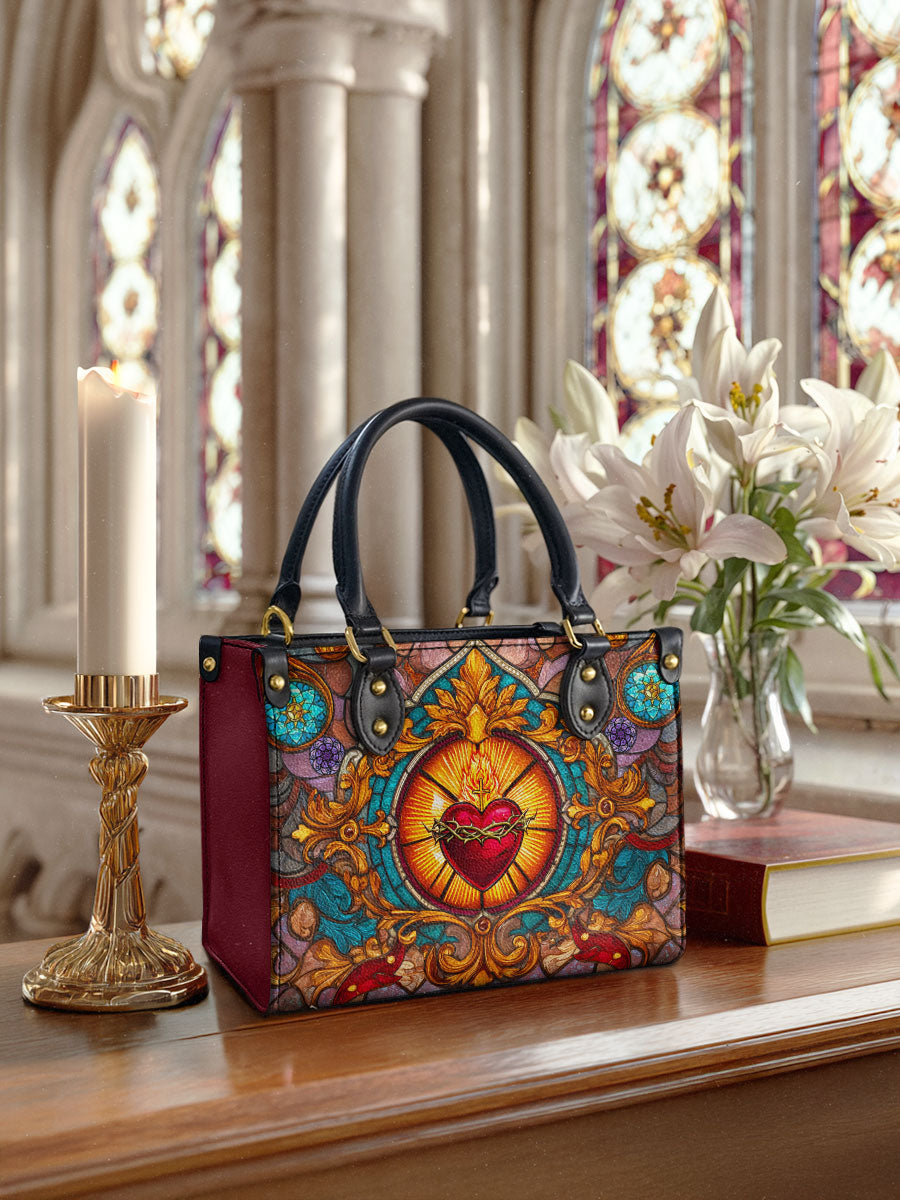 This exquisite handbag showcases the Sacred Heart of Jesus in luminous stained glass artistry — a timeless symbol of divine love, sacrifice, and mercy. The radiant heart, crowned with thorns and glowing with heavenly light, stands as a reminder of Christ’s unfailing compassion.