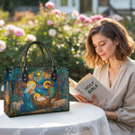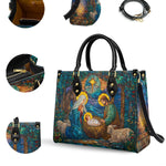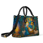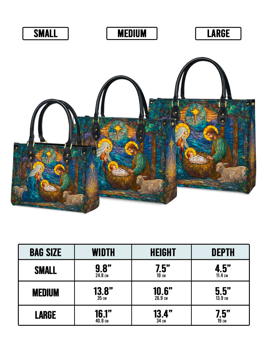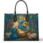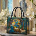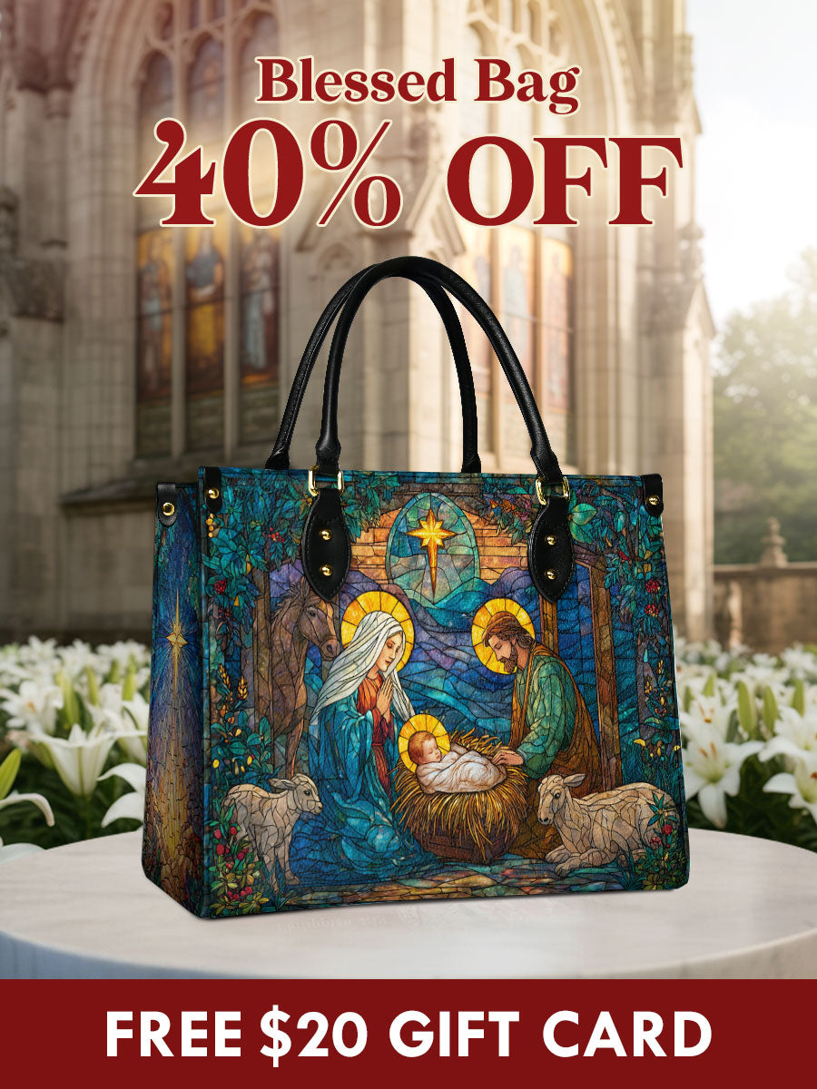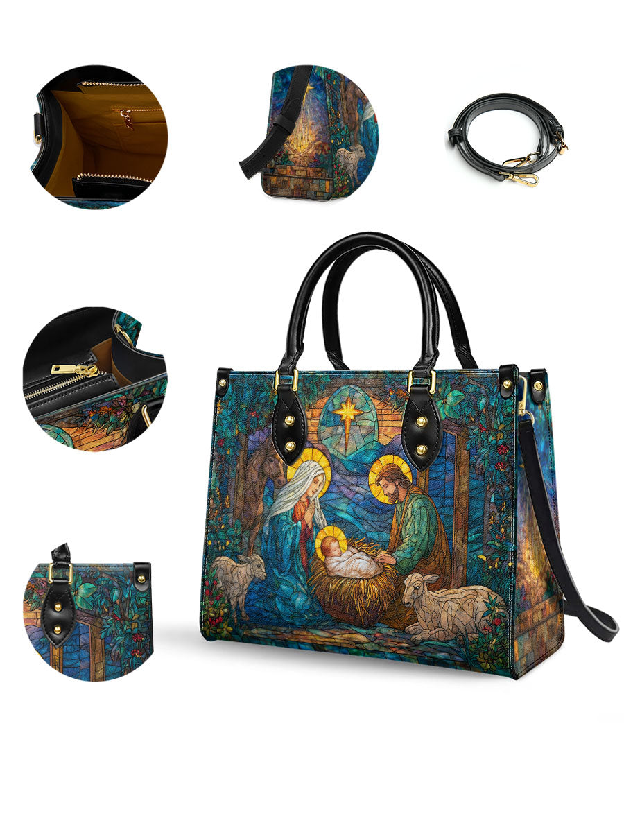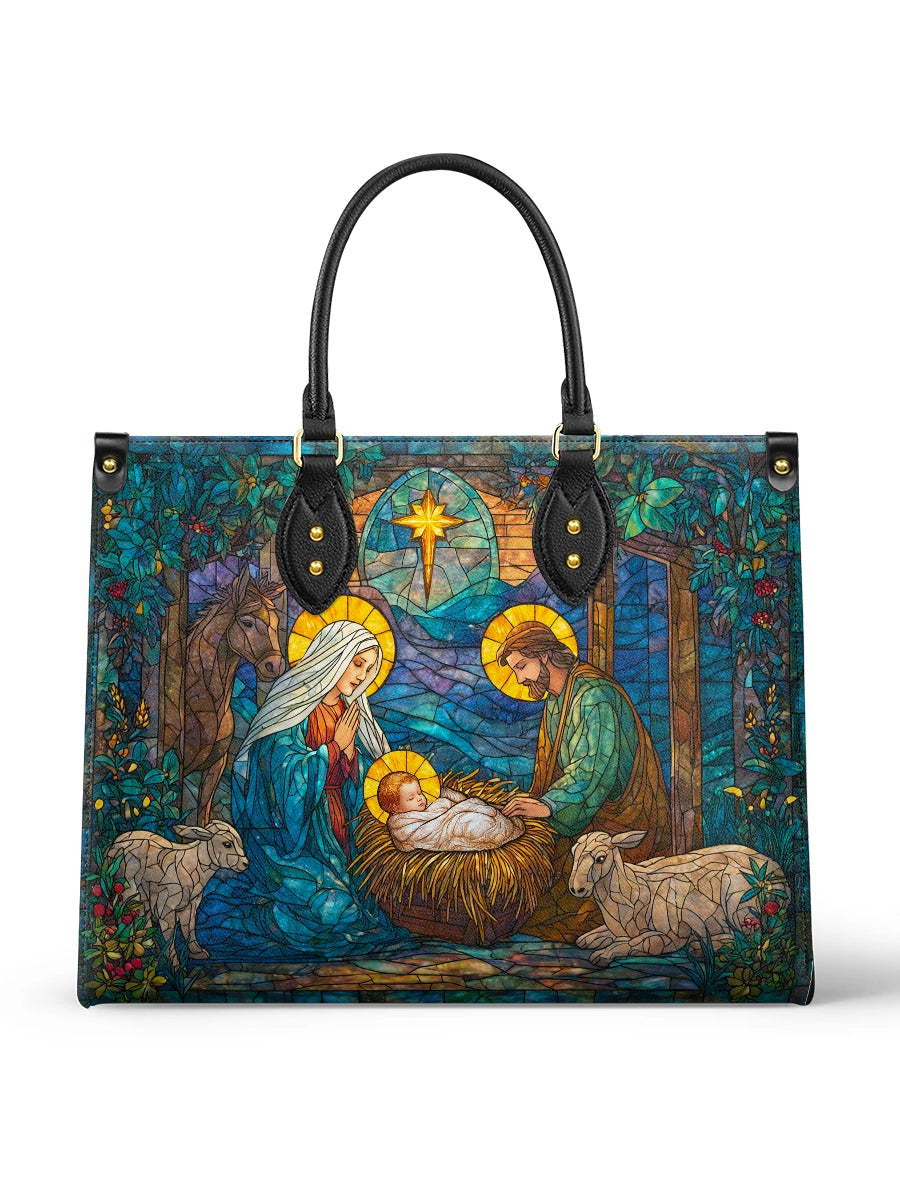 This radiant handbag captures the Holy Nativity — Mary and Joseph gazing upon the newborn Christ beneath the Star of Bethlehem, surrounded by the humble beauty of creation. Rendered in timeless stained glass artistry, the scene reflects peace, devotion, and the miracle of God’s love made flesh.