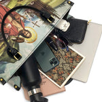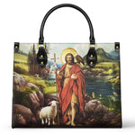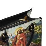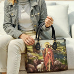 Le sac en cuir "Saint Jean-Baptiste Berger" présente une représentation à couper le souffle de Saint Jean-Baptiste, le héraut du Christ, marchant à travers une campagne sereine avec un agneau à ses côtés. Vêtu d'une robe fluide, il porte un bâton orné d'une croix, symbolisant son rôle de précurseur du Messie. Le paysage vibrant, complété par une verdure luxuriante et des eaux tranquilles, renforce le sentiment de paix et de but divin reflété dans cette œuvre d'art.