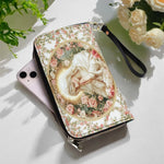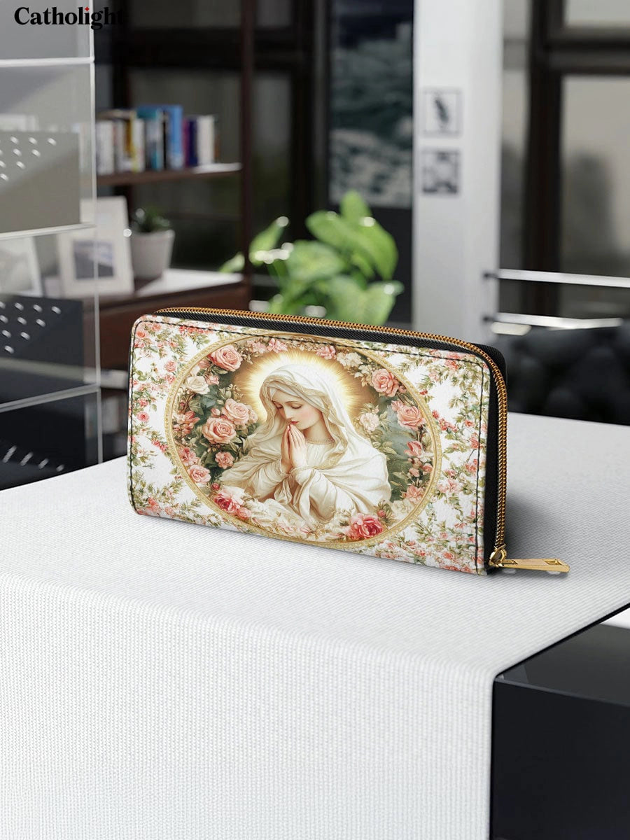 Ce portefeuille magnifiquement conçu présente une image tendre de la Sainte Vierge Marie en prière, entourée de délicates roses et rayonnante d'un halo doré. L'œuvre dégage paix et dévotion, symbolisant la grâce de Marie et son rôle en tant qu'intercesseur aimant pour tous. Les détails floraux complexes et les teintes pastel douces créent un design apaisant et spirituellement élévateur.