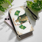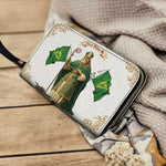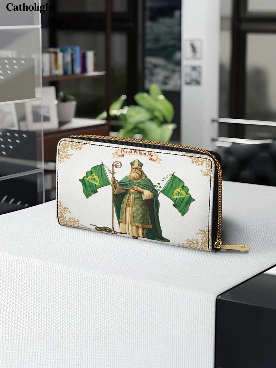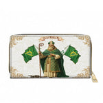 Ce portefeuille frappant célèbre l'héritage de Saint Patrick, le bien-aimé saint patron de l'Irlande, avec un design qui rayonne de foi, de courage et d'héritage. Au centre se tient Saint Patrick, vêtu de robes vertes resplendissantes ornées de détails dorés complexes, symbolisant son rôle de leader spirituel. Dans ses mains, il tient un crosier et un trèfle, représentant la Trinité et ses enseignements de foi.
