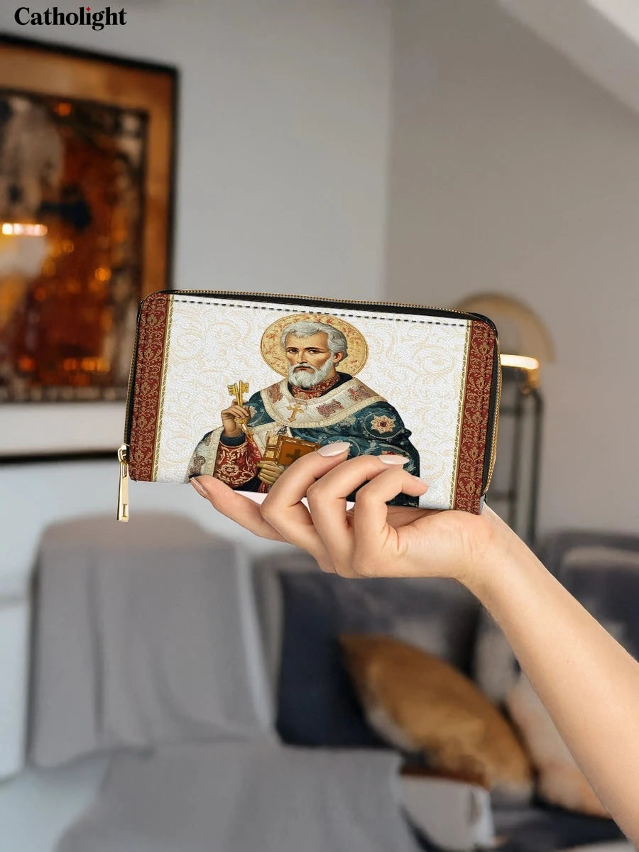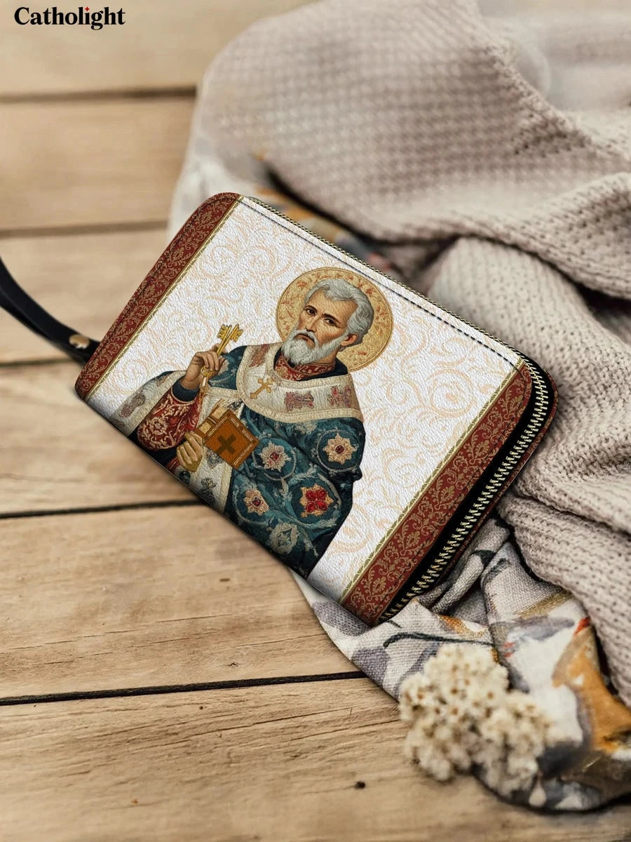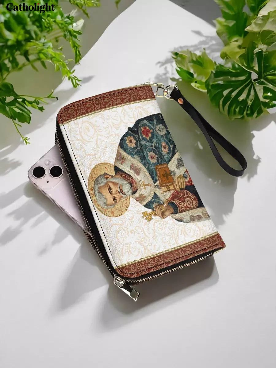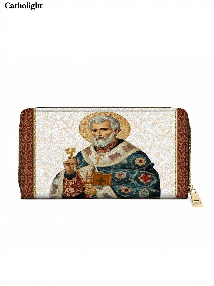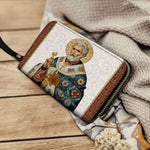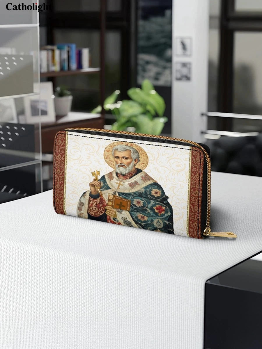Ce portefeuille élégant présente une magnifique représentation de Saint Pierre, la pierre angulaire de la foi et de la dévotion. Enveloppé dans un halo doré, Saint Pierre est dépeint tenant les clés du Royaume des Cieux et la Sainte Écriture, symbolisant l'autorité divine et un engagement indéfectible à répandre la Parole de Dieu. Les détails complexes de ses vêtements richement ornés et l'arrière-plan orné évoquent un sentiment de révérence, de tradition et de grâce spirituelle.