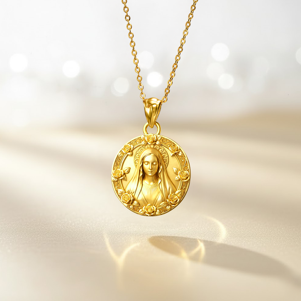 This pendant honors the Blessed Virgin Mary, surrounded by roses, the eternal symbol of purity, love, and devotion. Her serene gaze and flowing veil are delicately engraved, a timeless reminder of her intercession and maternal care.
