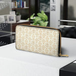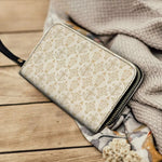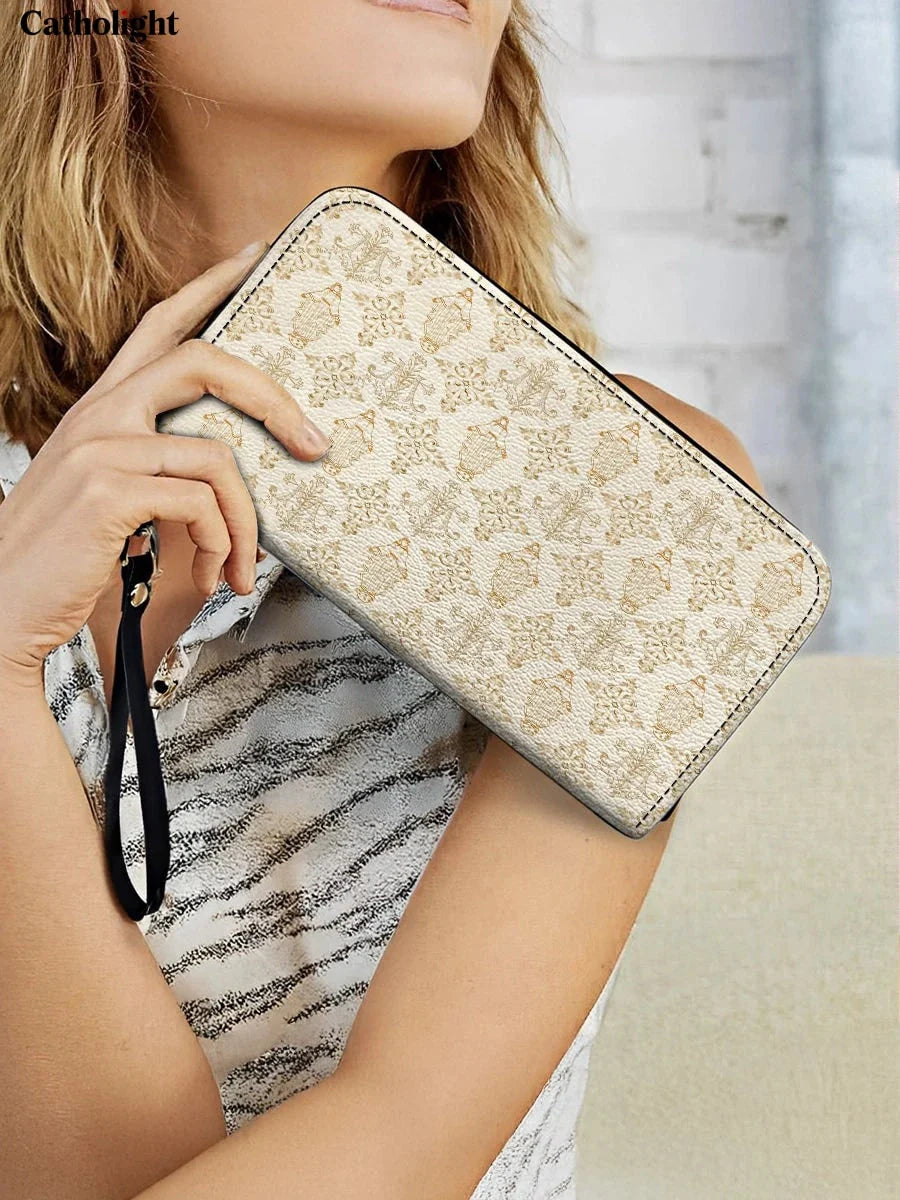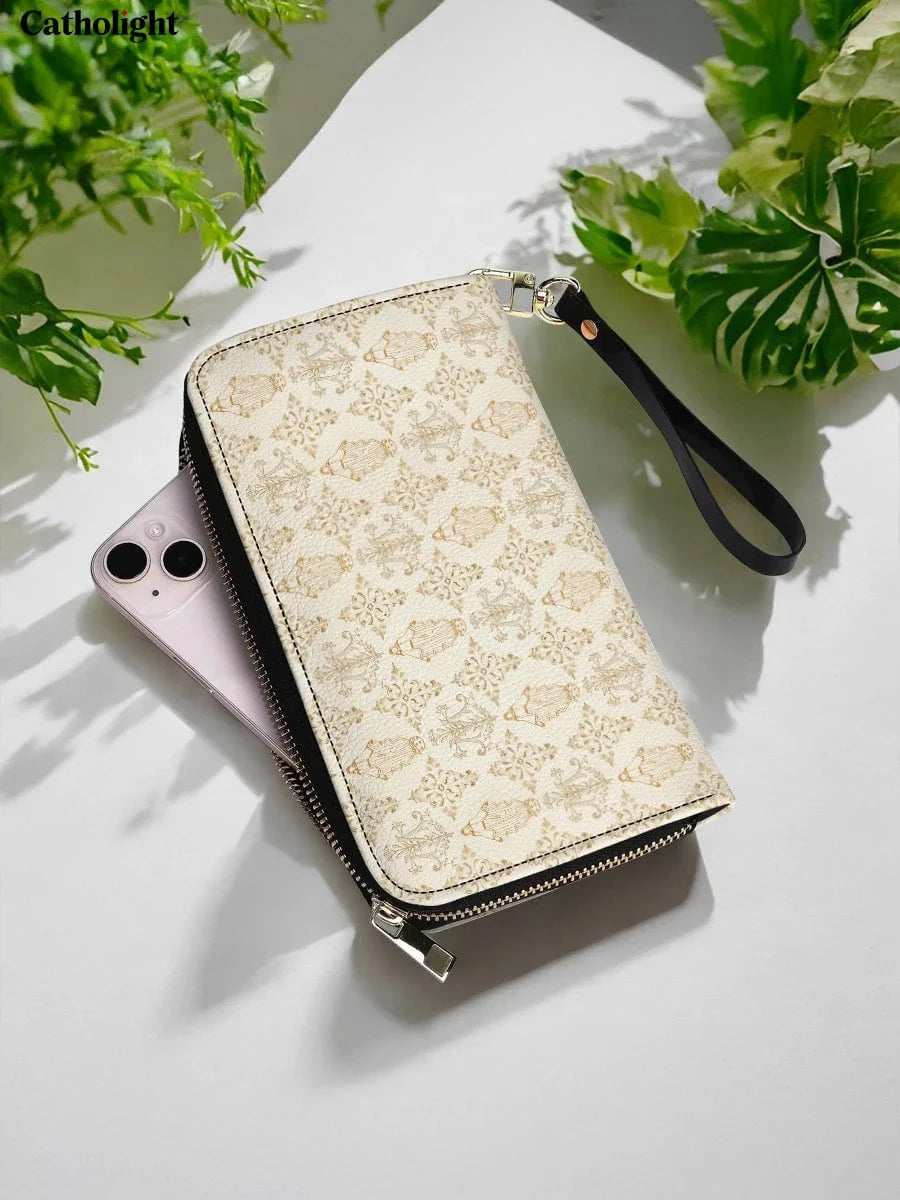 Ce portefeuille élégant célèbre le Monogramme de Marie et sa grâce éternelle à travers son design complexe. Le fond crème doux est orné d'un motif doré répétitif qui met en valeur le monogramme marial, symbolisant la pureté, la dévotion et l'amour maternel de la Vierge Marie. Les accents floraux ornés entourant le monogramme reflètent son lien avec la beauté et la foi, créant un design à la fois subtil et spirituellement significatif.