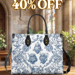This beautifully designed leather bag features a timeless blue-and-white motif inspired by sacred art and classical porcelain patterns. The centerpiece of the design showcases intricate illustrations of the Sacred and Immaculate Hearts, symbolizing divine love, sacrifice, and compassion. Encircling the hearts are delicate floral arrangements, including roses and lilies, representing purity, devotion, and eternal grace.