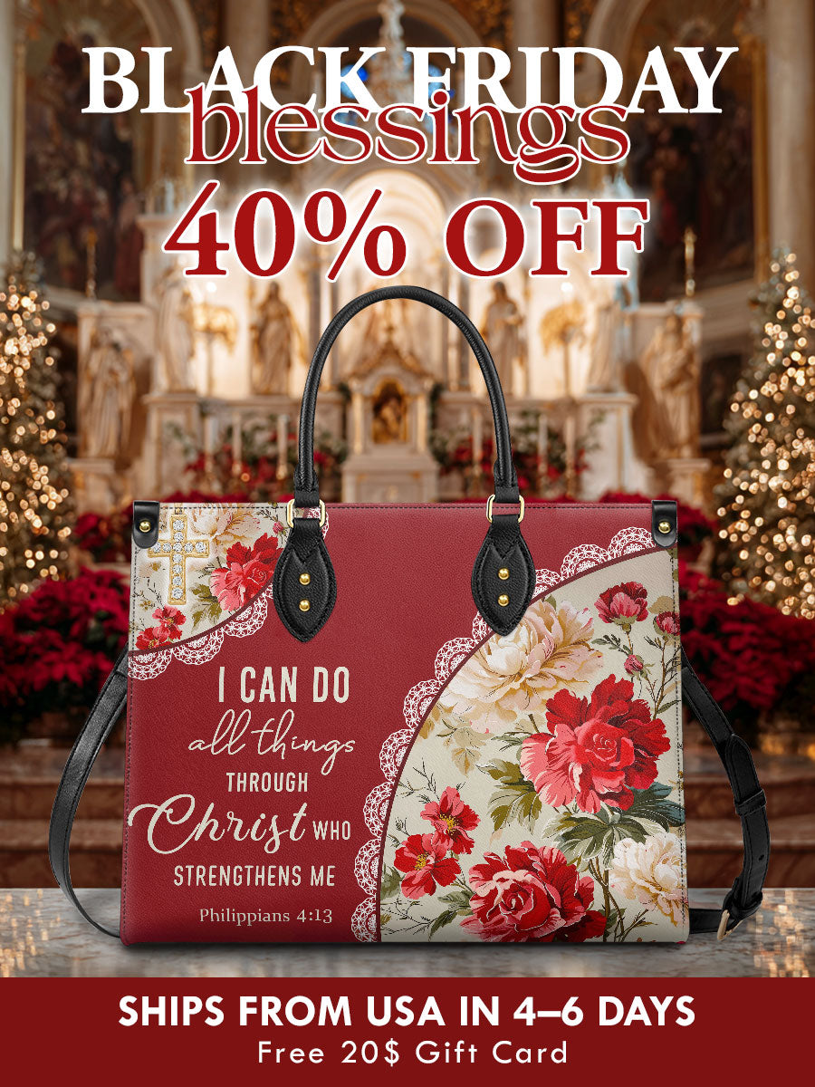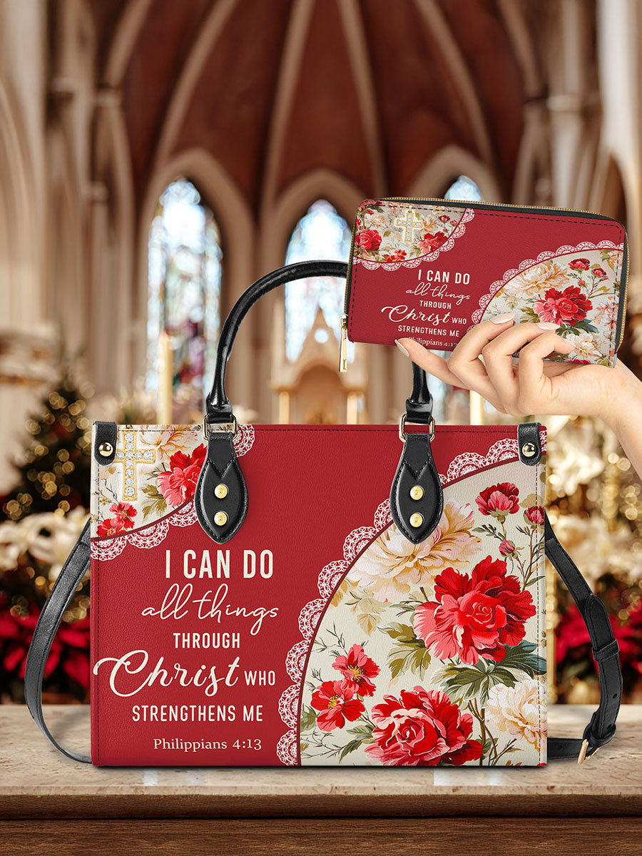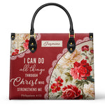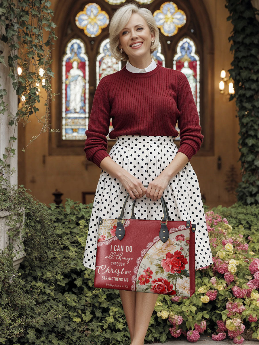Ce sac en cuir magnifiquement conçu présente le verset biblique inspirant “Je peux tout par celui qui me fortifie” de Philippiens 4:13. Sur un fond cramoisi riche, le verset est encadré par de délicates accents en dentelle et des motifs floraux vibrants, y compris de bold roses rouges qui symbolisent l'amour, la force et la foi. Une croix subtile et un détail de nom personnalisé ajoutent une touche significative et personnelle à ce design élégant et spirituellement édifiant.