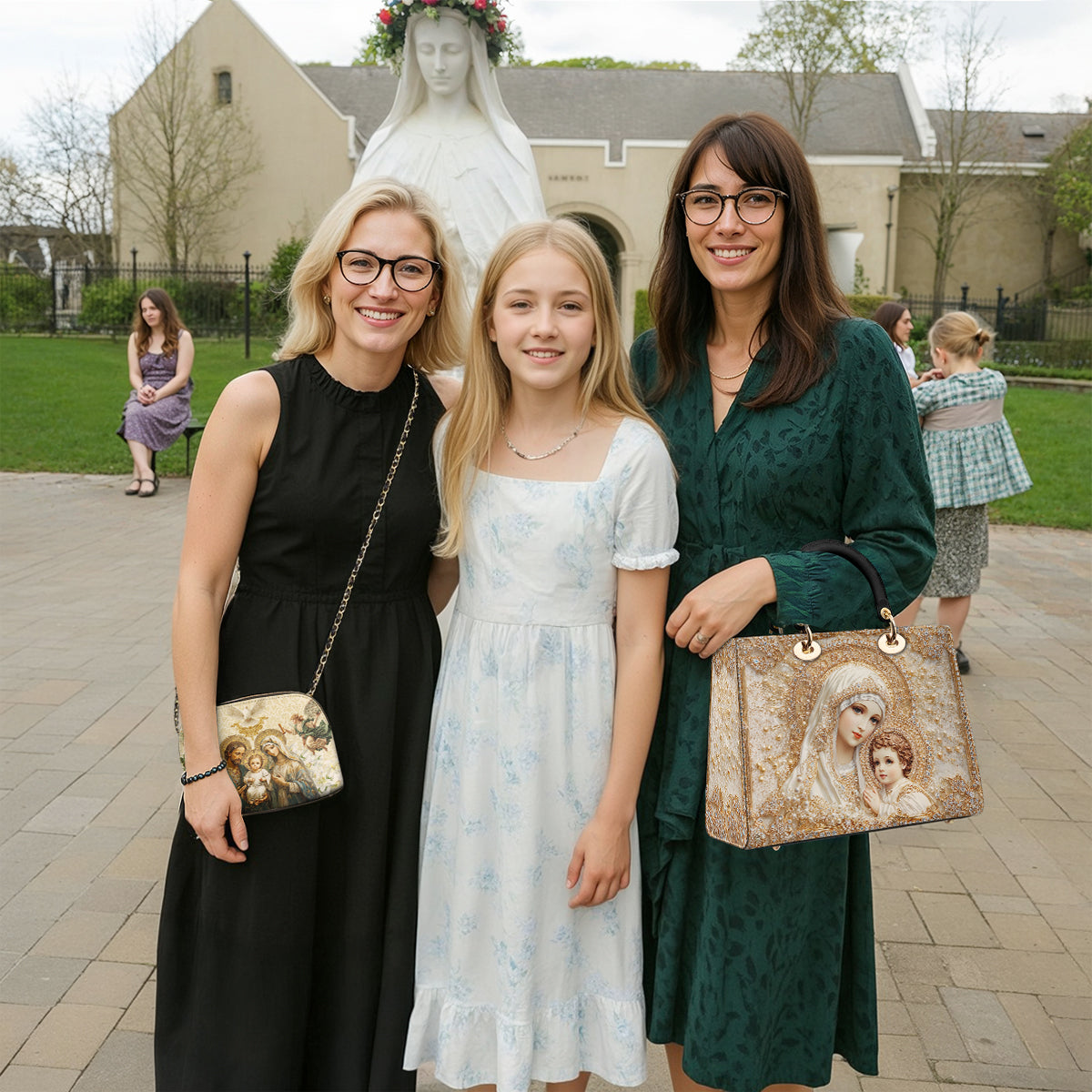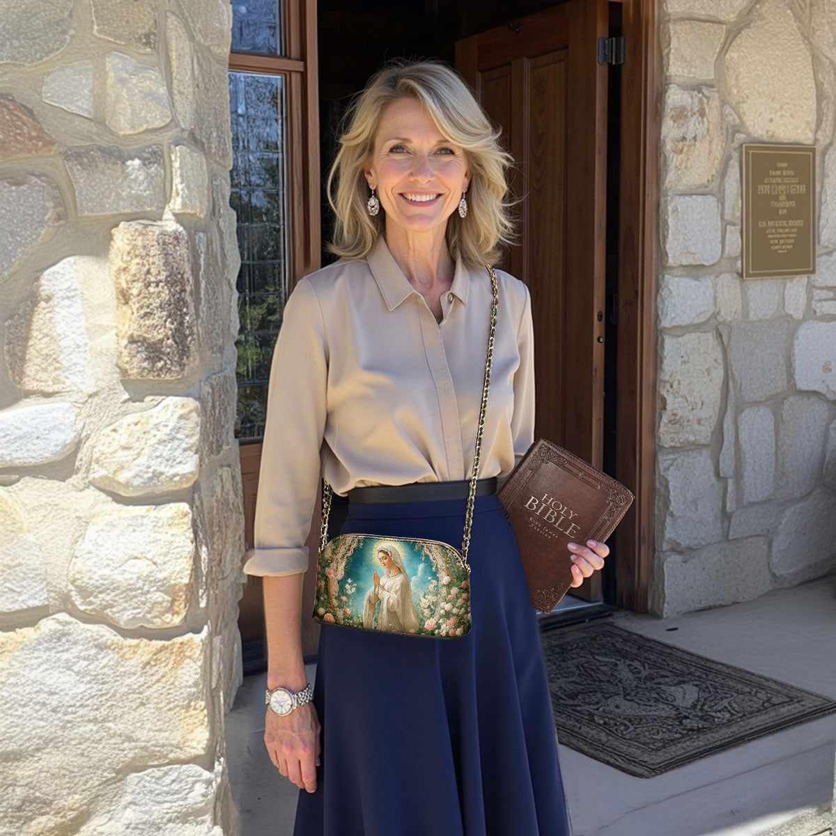 Designed with grace and intention, the Catholight Crossbody Bag is a quiet expression of faith and elegance. Its compact form, gold-accented chain strap, and symbolic artwork make it a meaningful companion for both daily life and sacred moments.