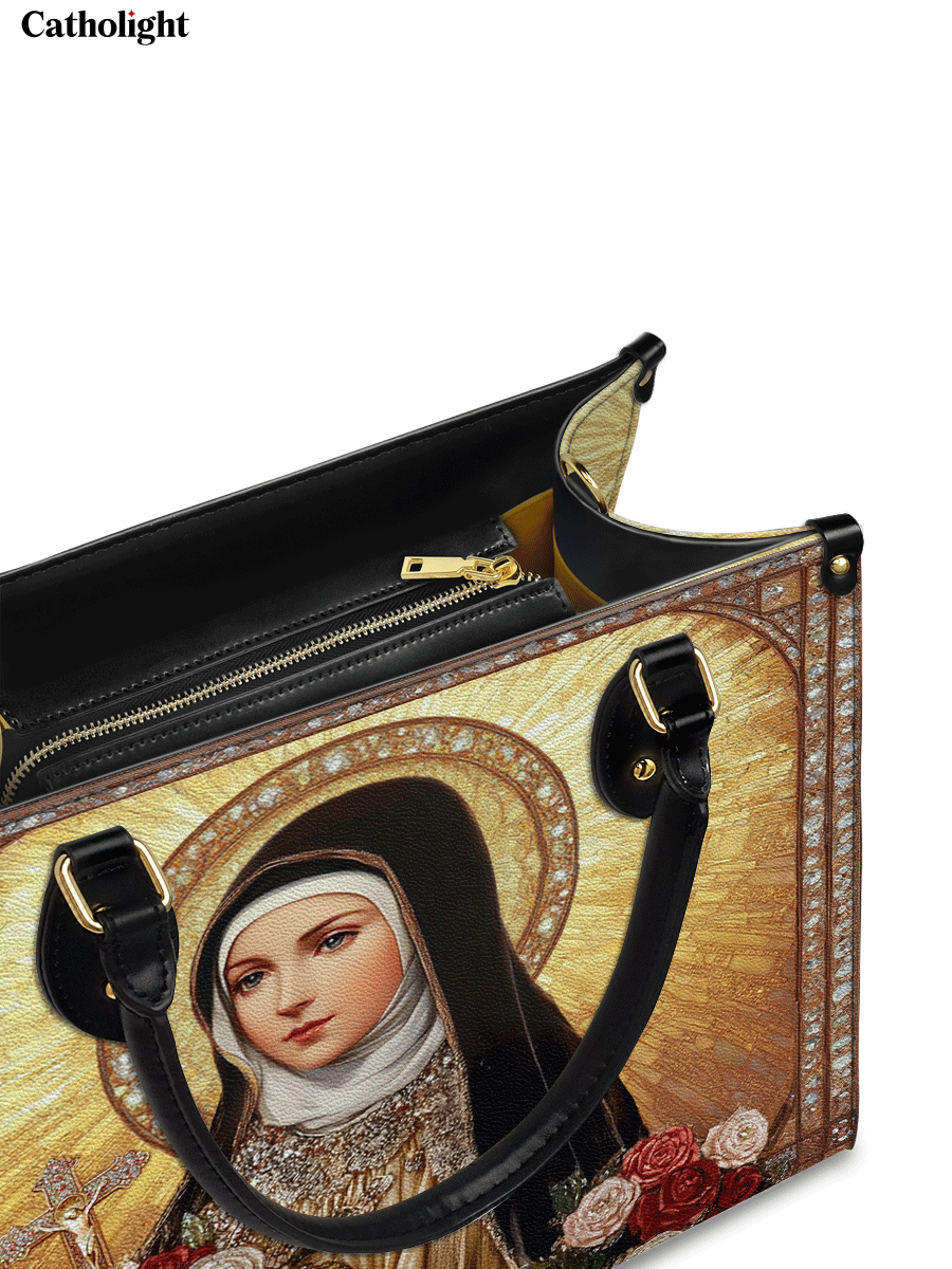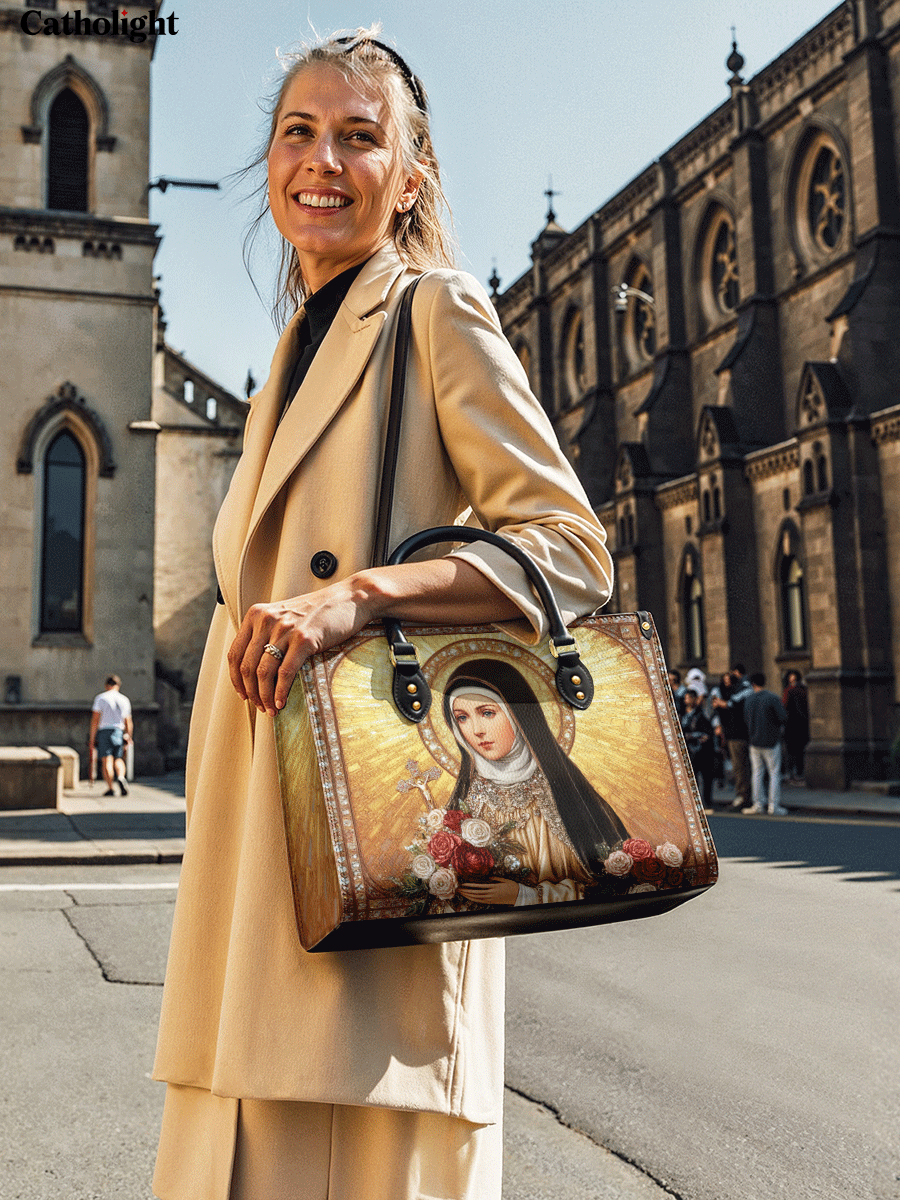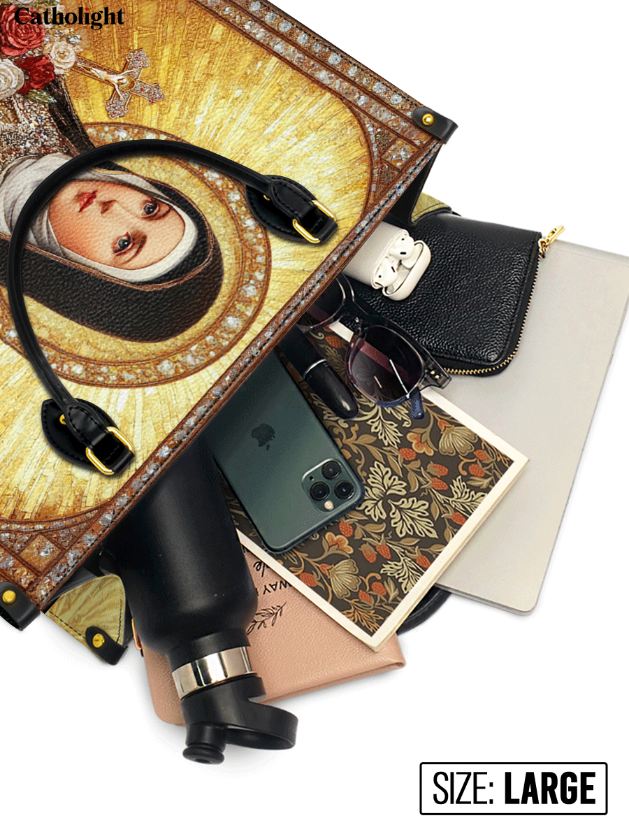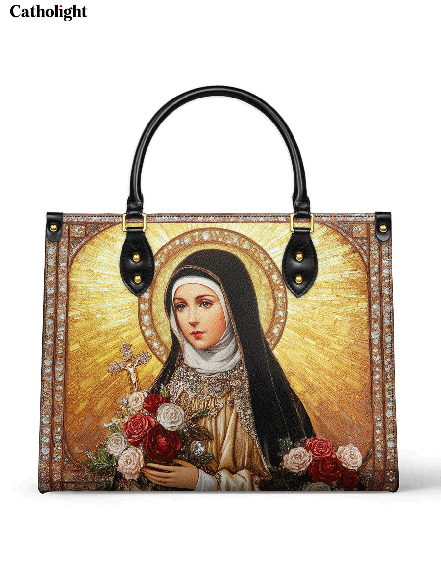 Ce sac en cuir élégant présente une représentation radieuse de Sainte Thérèse de Lisieux, affectueusement connue sous le nom de "La Petite Fleur." Entourée d'un halo doré qui émane une lumière divine, le visage serein de Sainte Thérèse reflète sa foi et sa dévotion inébranlables.