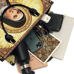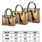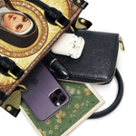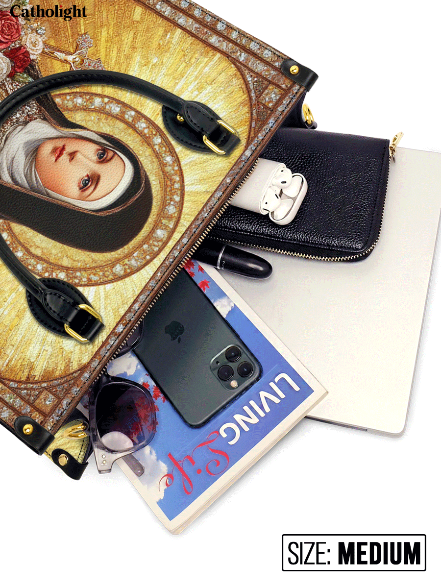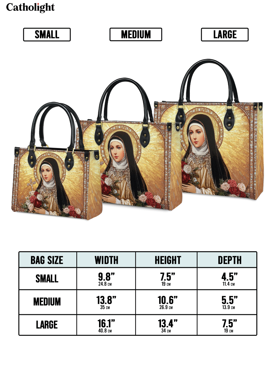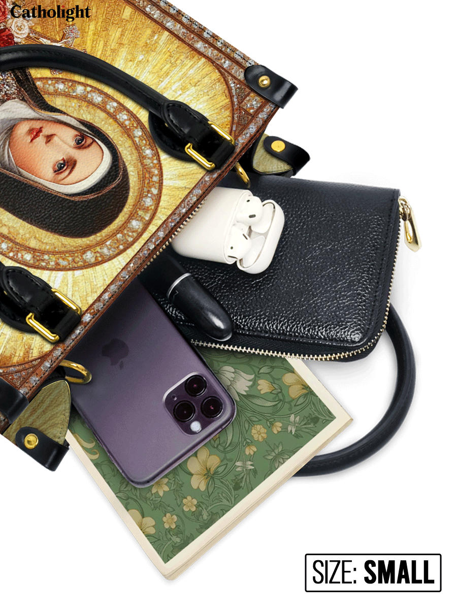 Ce sac en cuir élégant présente une représentation radieuse de Sainte Thérèse de Lisieux, affectueusement connue sous le nom de "La Petite Fleur." Entourée d'un halo doré qui émane une lumière divine, le visage serein de Sainte Thérèse reflète sa foi et sa dévotion inébranlables.